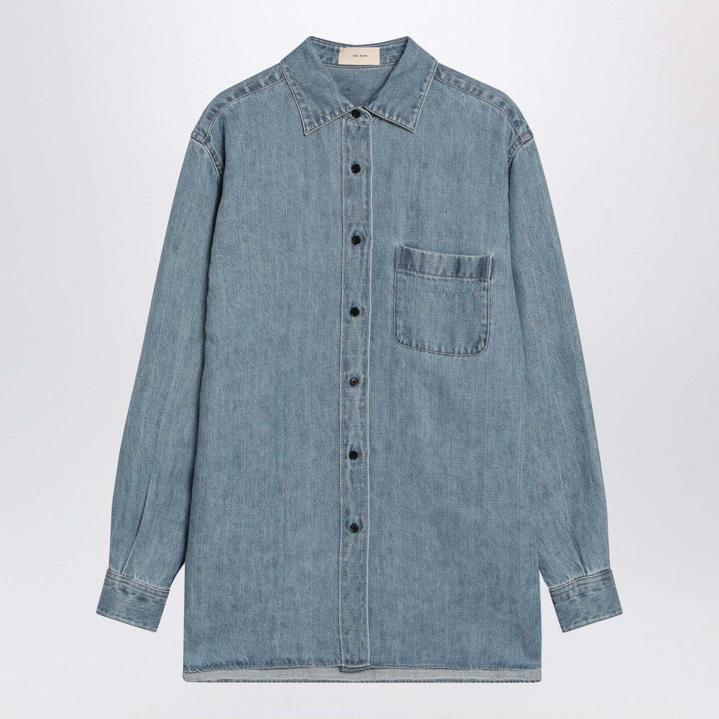 Light blue linen denim shirt by The Row, featuring a front button closure, long sleeves with buttoned cuffs, a classic collar, and a patch pocket on the chest.