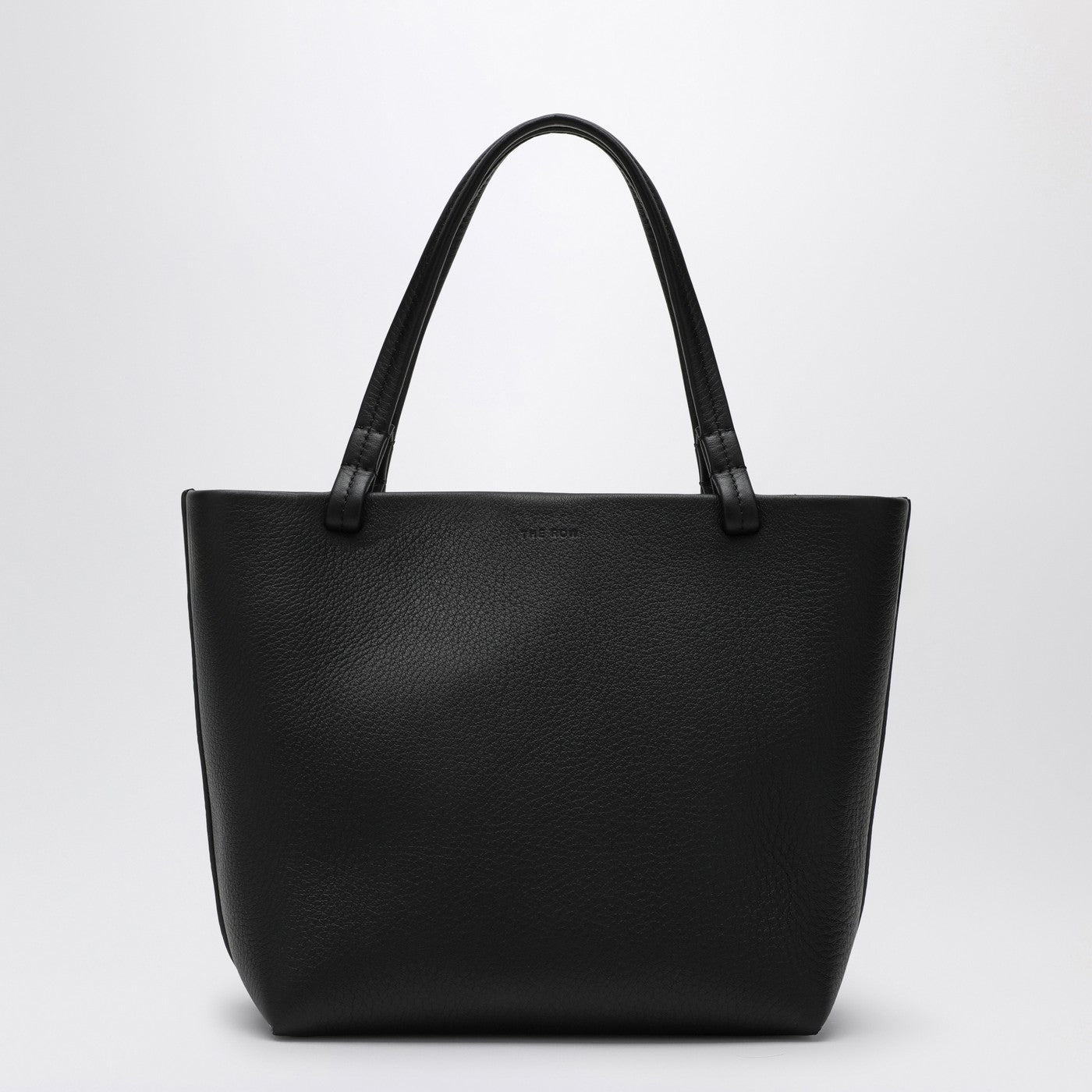Black calfskin leather small bag from The Row featuring two flat top handles, an adjustable and detachable shoulder strap, embossed lettering logo on the front and a metal hook fastening.