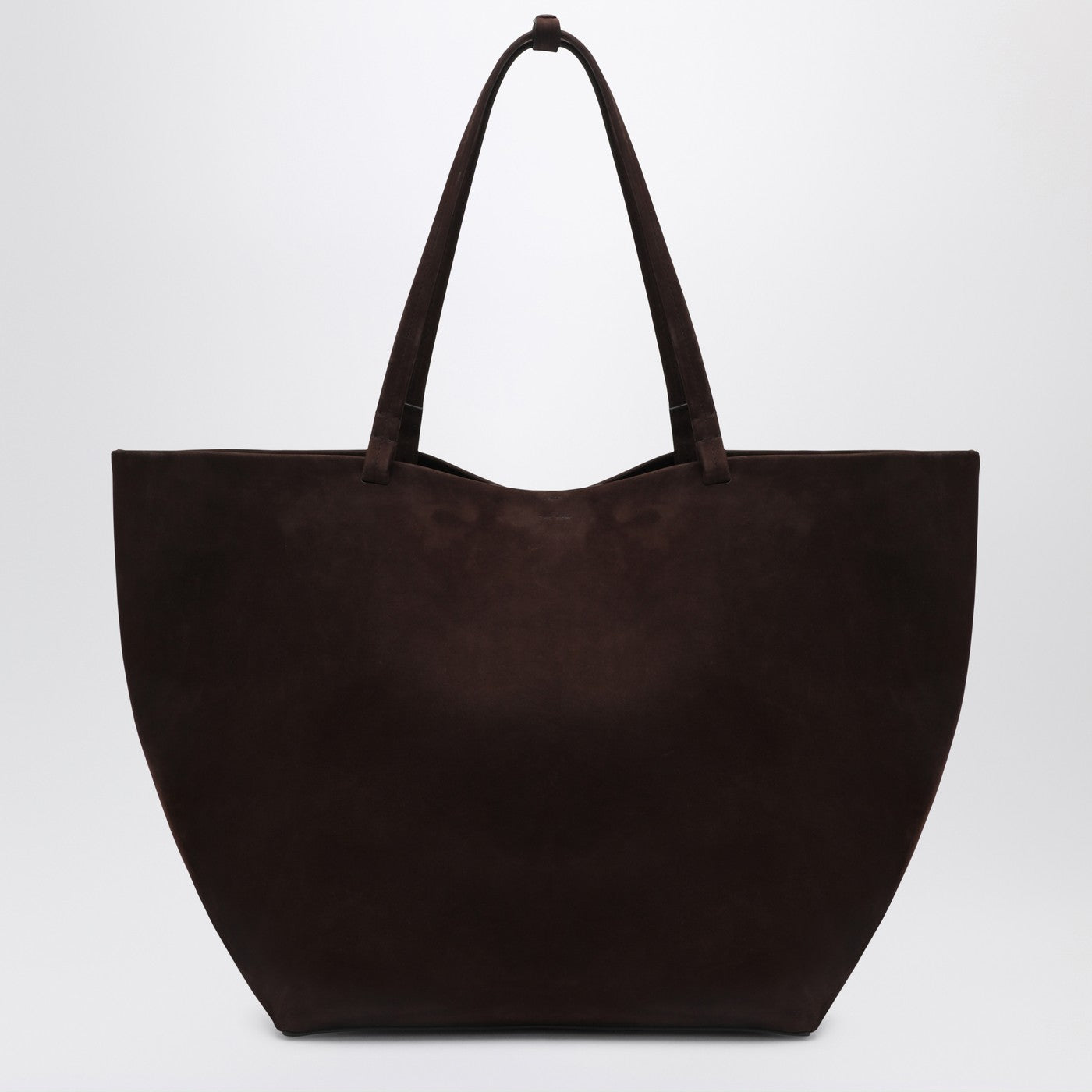 XL size tote bag by The Row in brown nubuck suede, featuring two flat handles and internal closure.