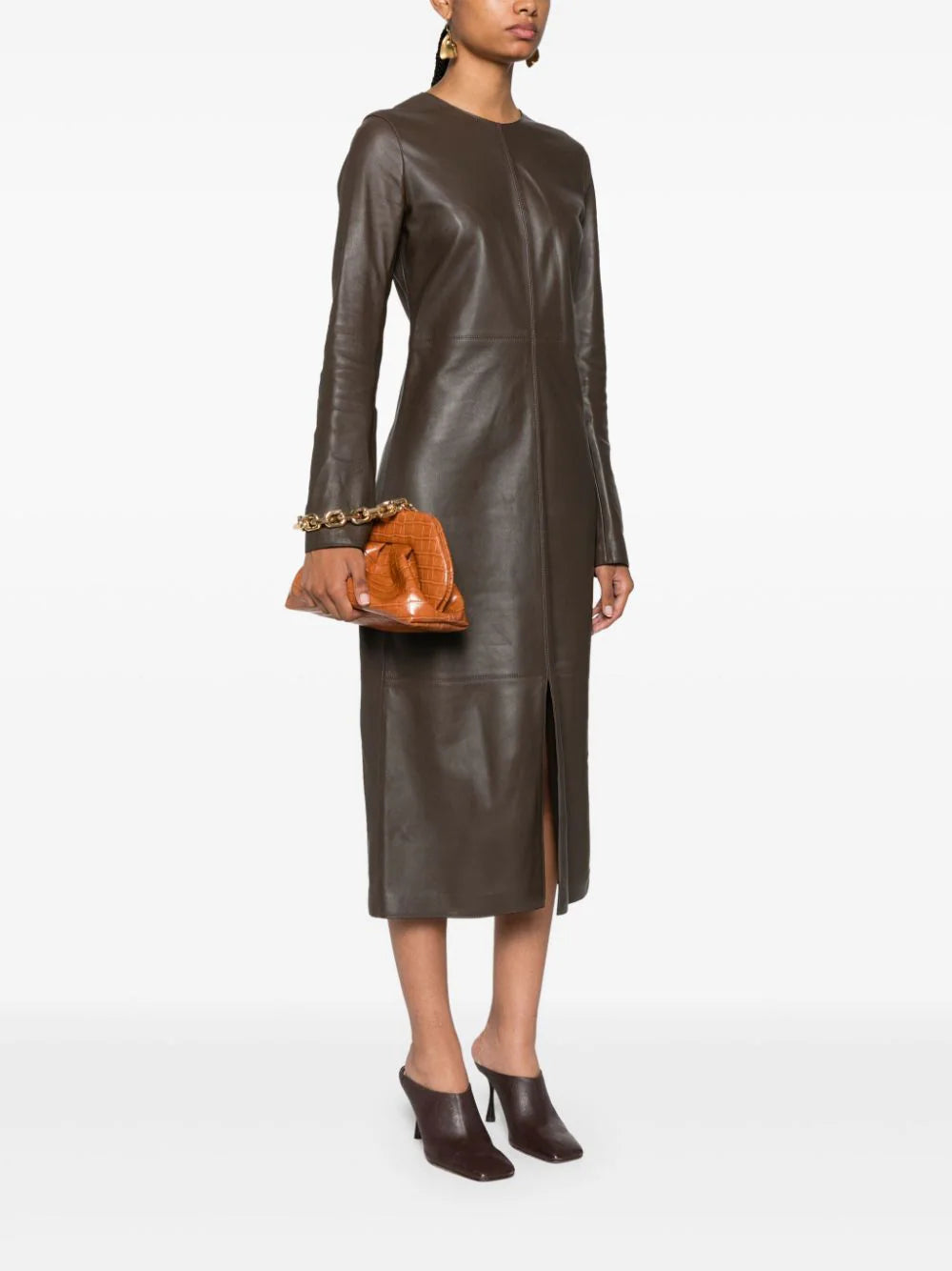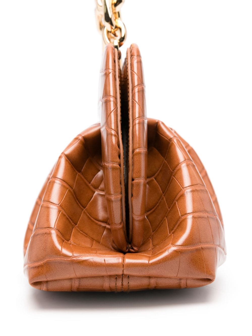 cognac brown faux leather crocodile embossed effect hidden magnetic closure single chain top handle detachable adjustable shoulder strap fold details main compartment full lining