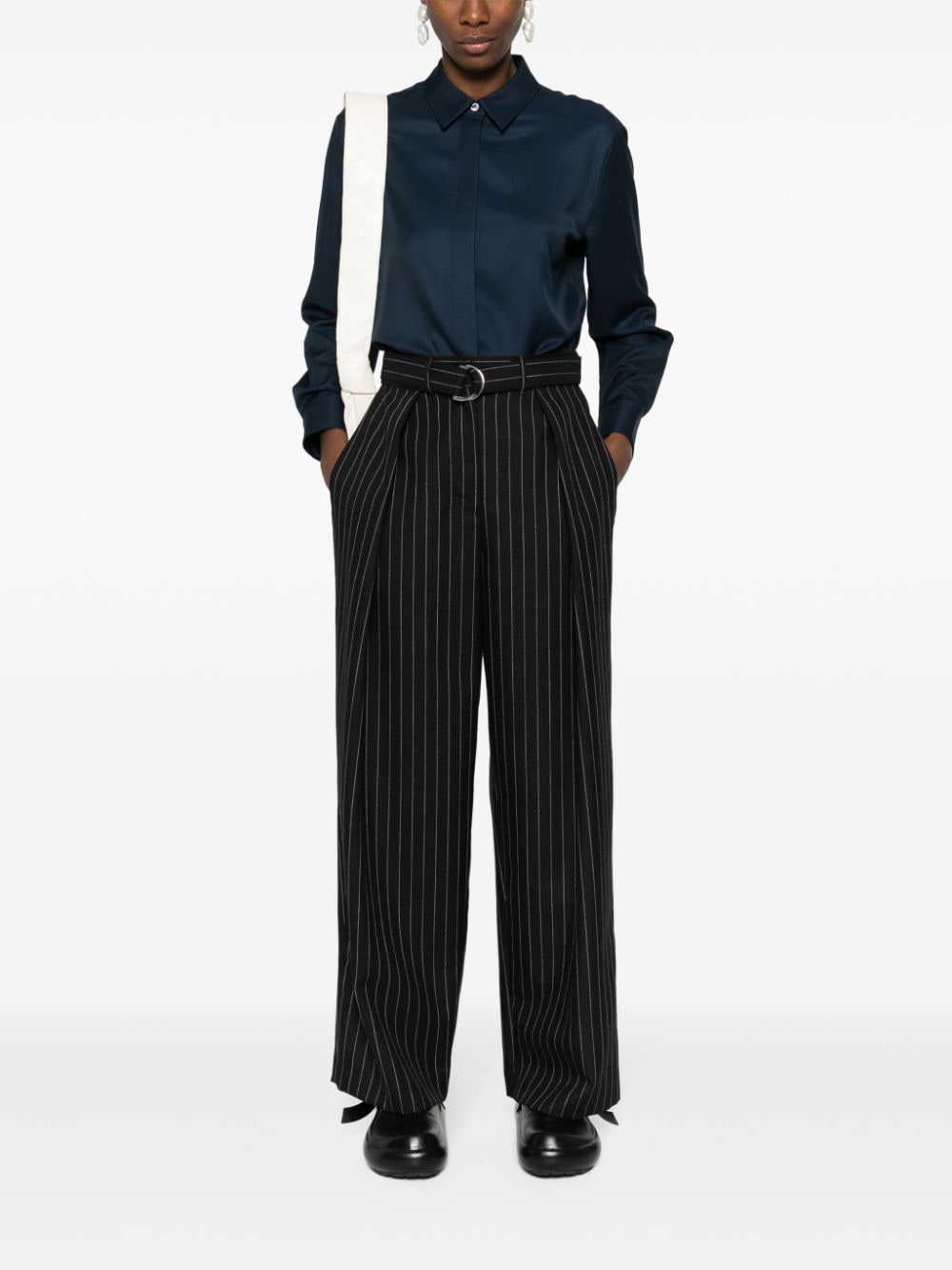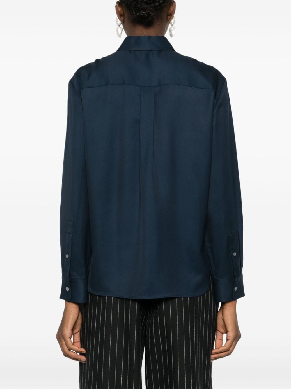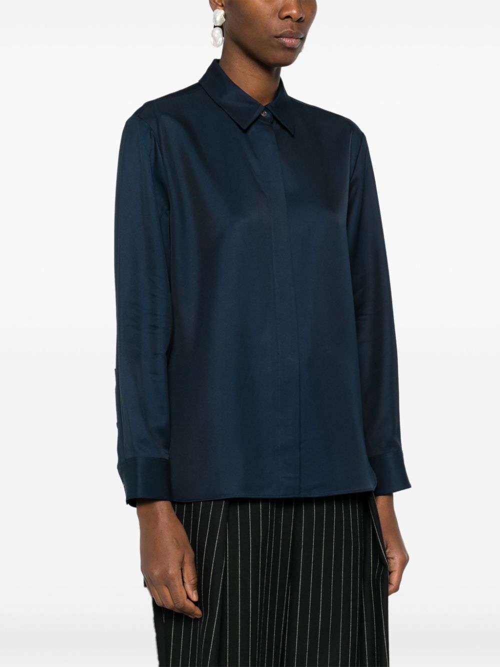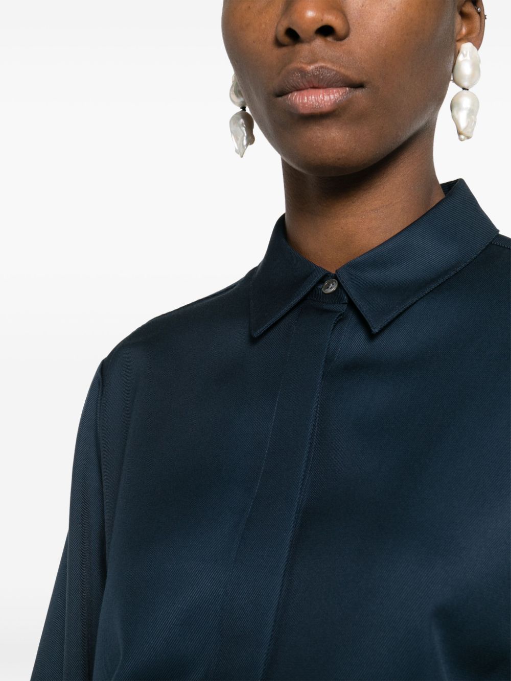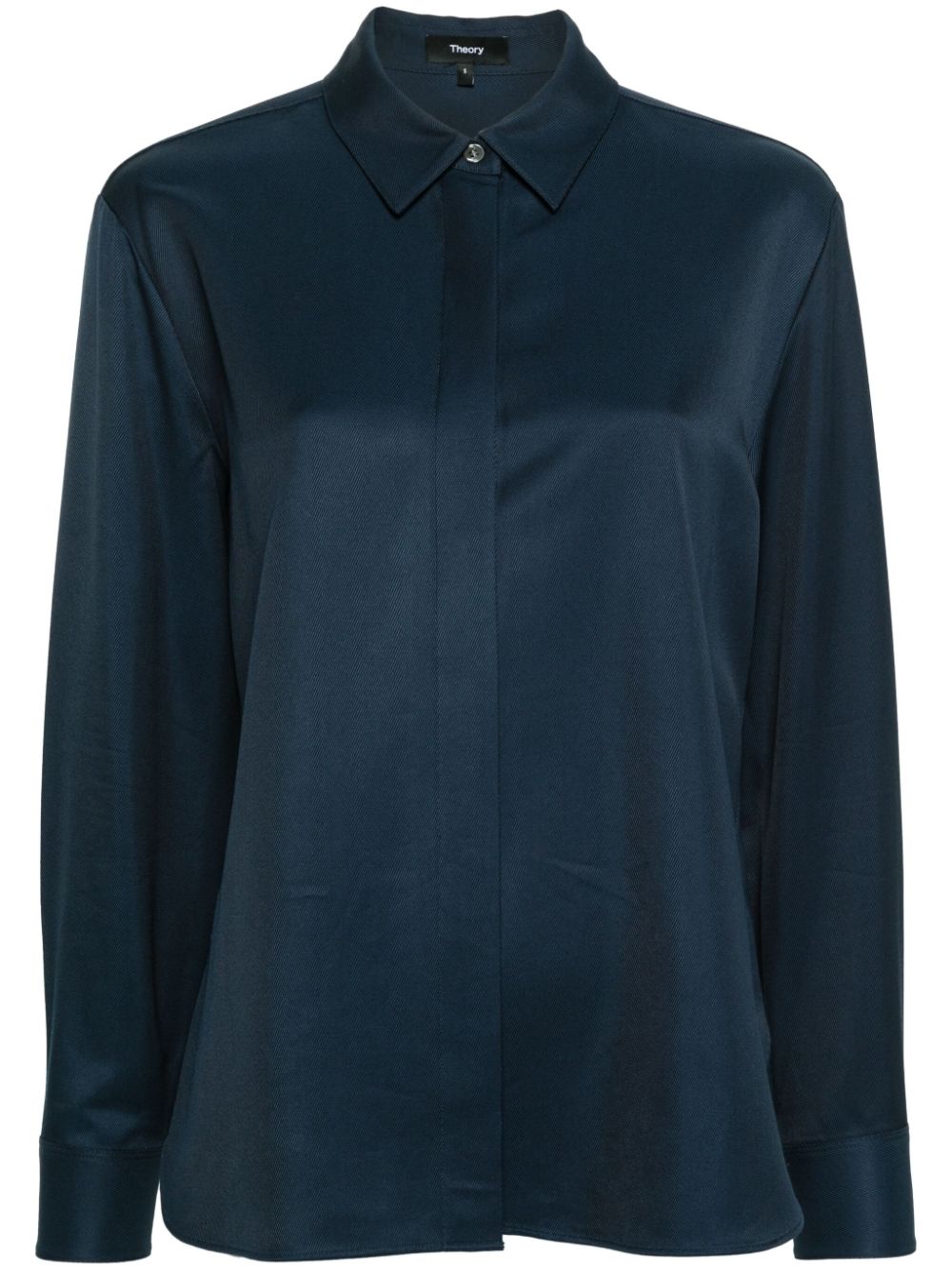 navy blue faille classic collar long sleeves buttoned cuffs rear box-pleat detail internal logo tag curved hem concealed front button fastening