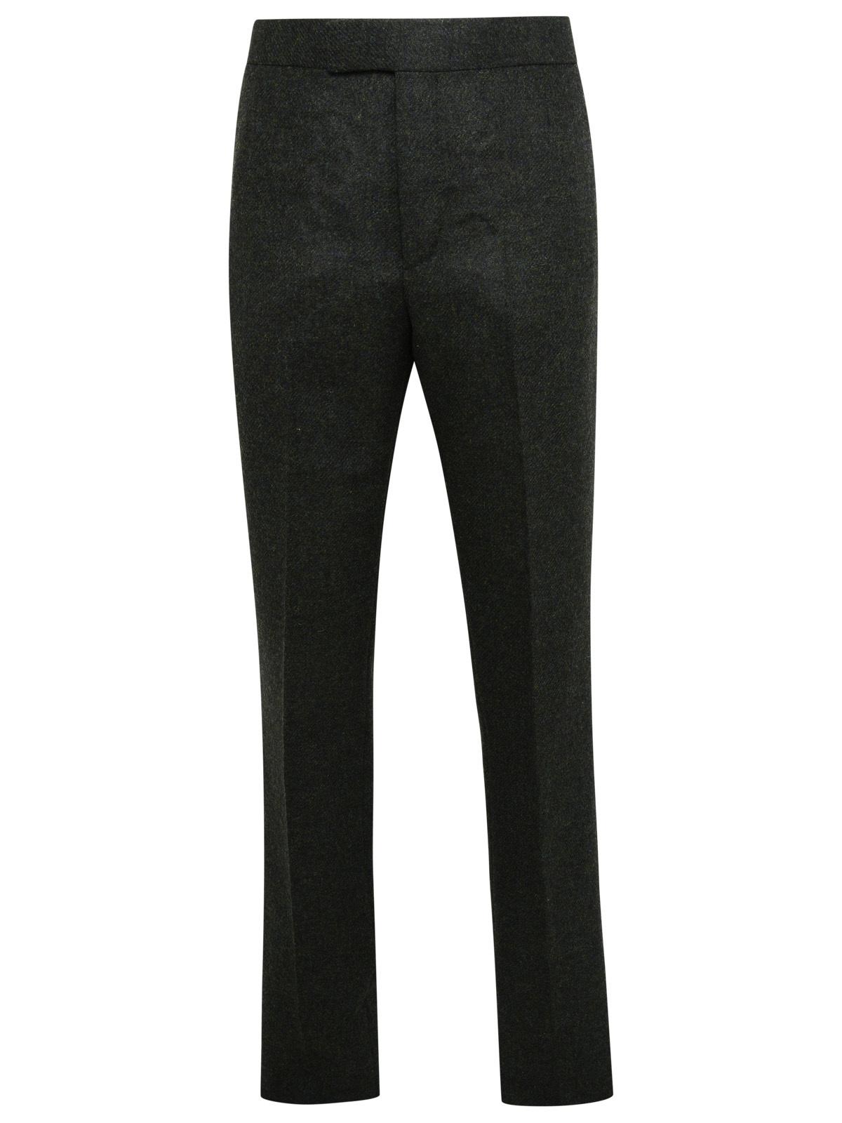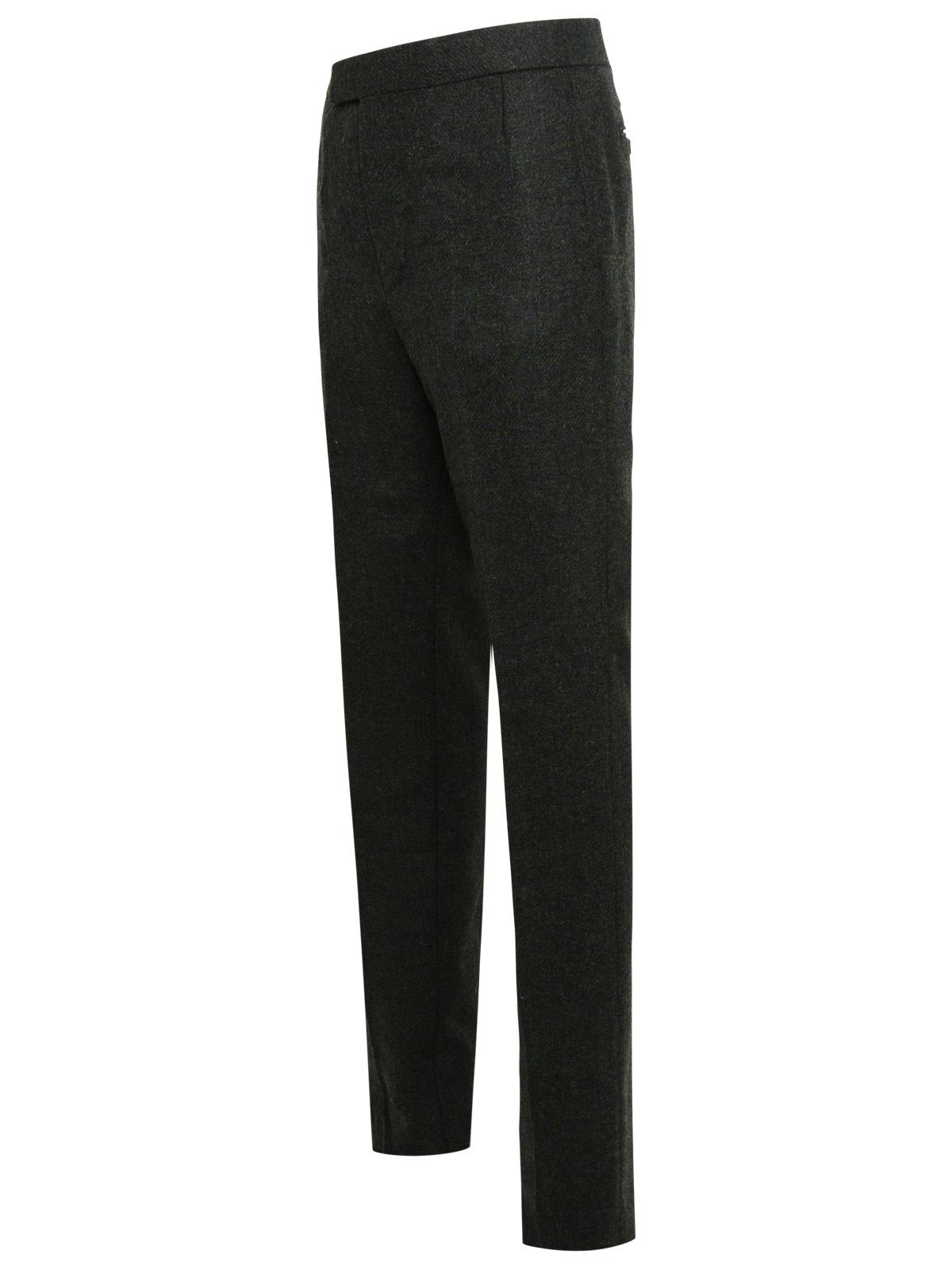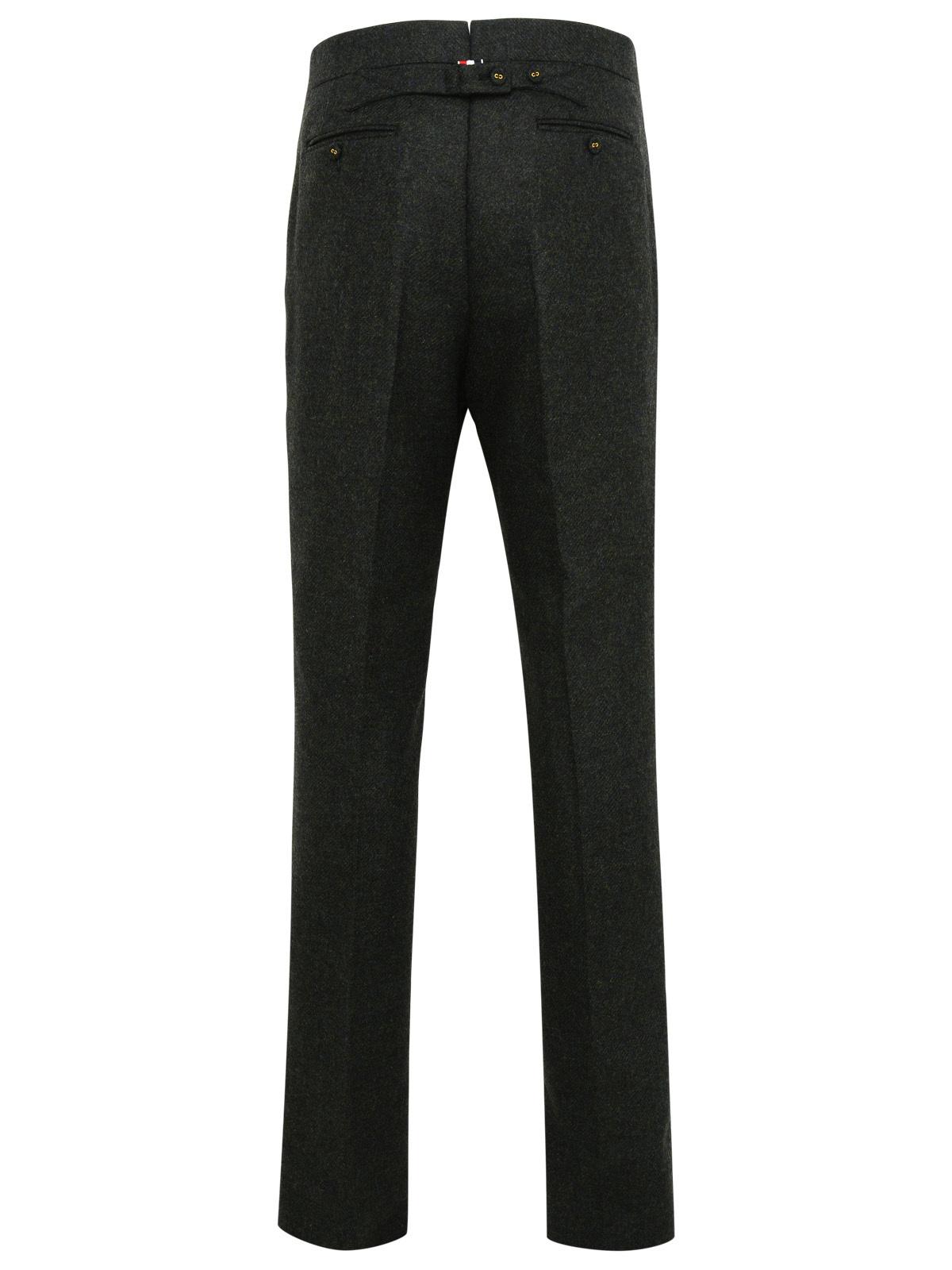 Tailored straight trousers, hook and button closure, side pockets, adjustable buckle strap on the back, welt pockets with button on the back