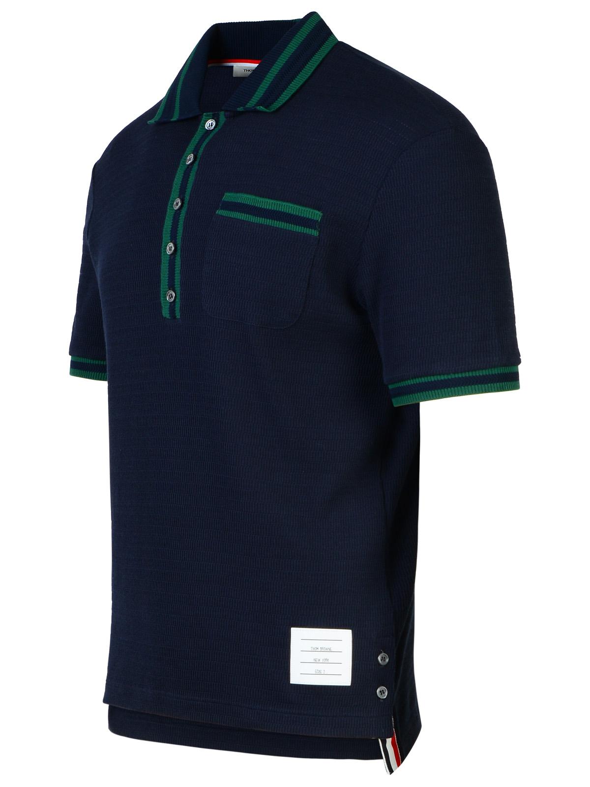 Ribbed polo collar, five-button polo closure, patch pocket on the chest, iconic contrasting logo patch on the front, short sleeves with ribbed trim, longer hem on the back with side slits embellished with tricolor bands and buttons.