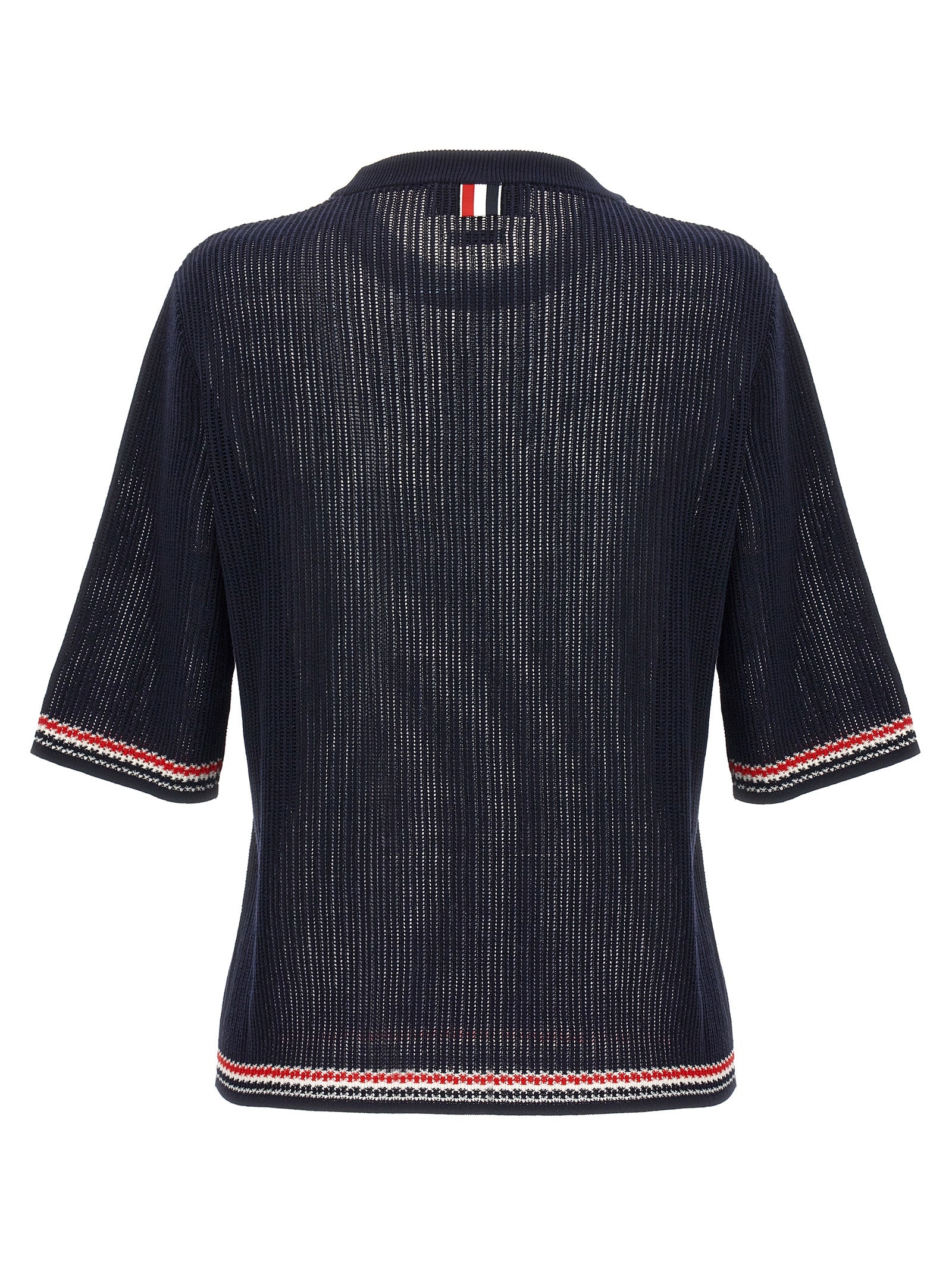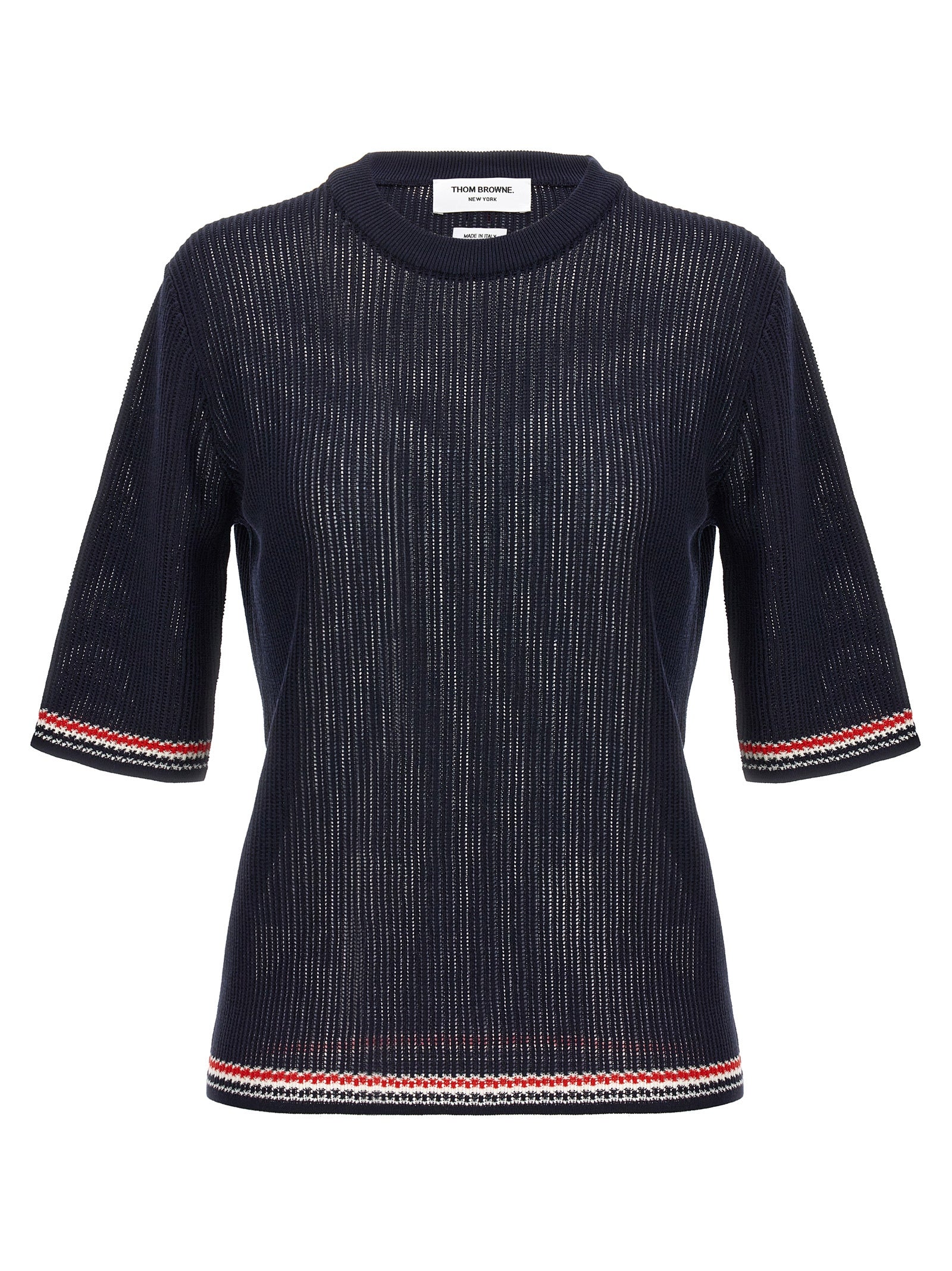 Knit cotton and silk pointelle sweater with short sleeves, crew neck.