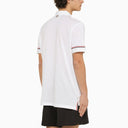 Short-skeeved polo shirt by Thom Bronwe in white cotton feauturing classic collar, button front, short sleeves with tricolour detailing, stitched logo patch on the front and a straight hem.