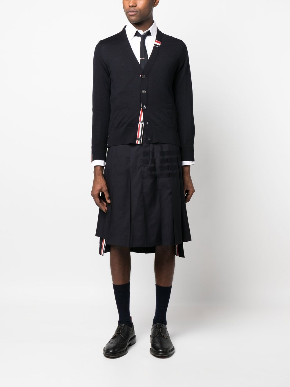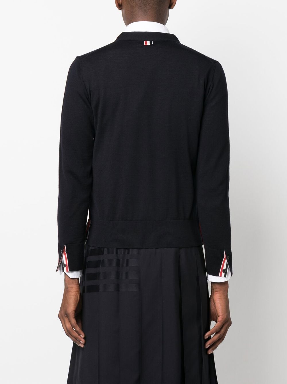 jersey stitch V-neck cardigan from THOM BROWNE featuring navy blue, virgin wool blend, fine knit, RWB stripe, V-neck, long sleeves and straight hem.