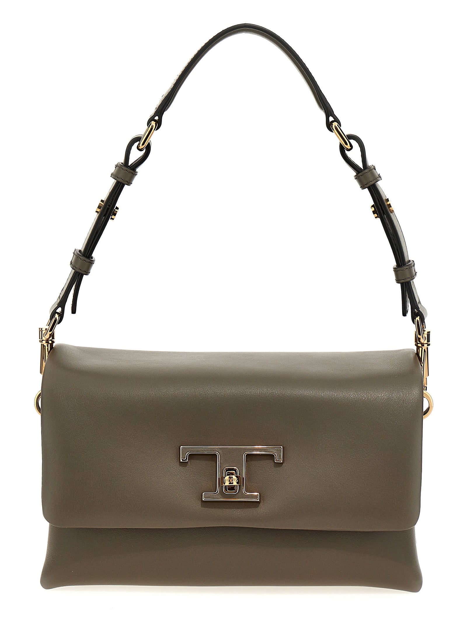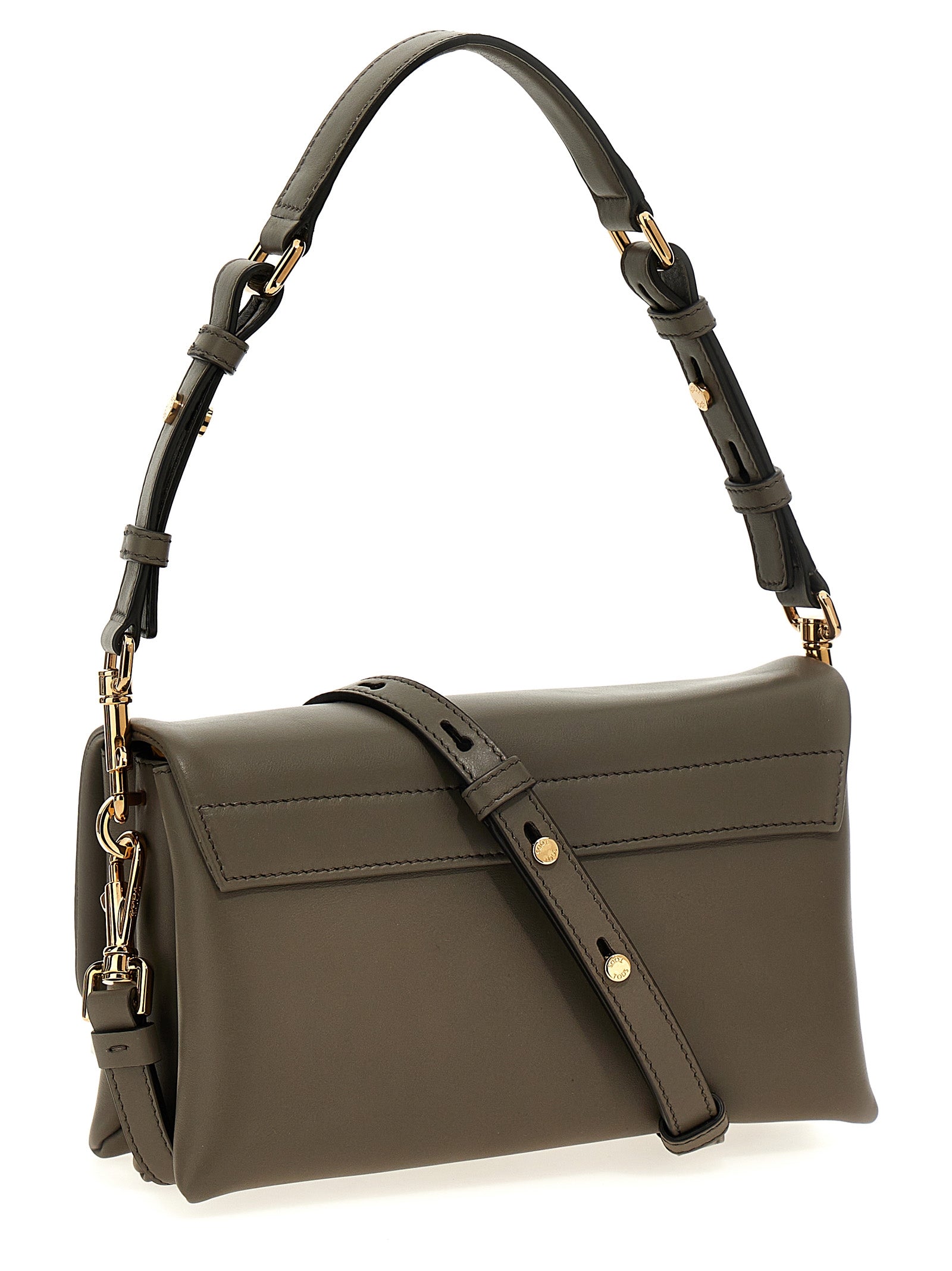 Leather shoulder bag, metal twist closure with enameled logo, removable top handle, separate interior into three compartments.