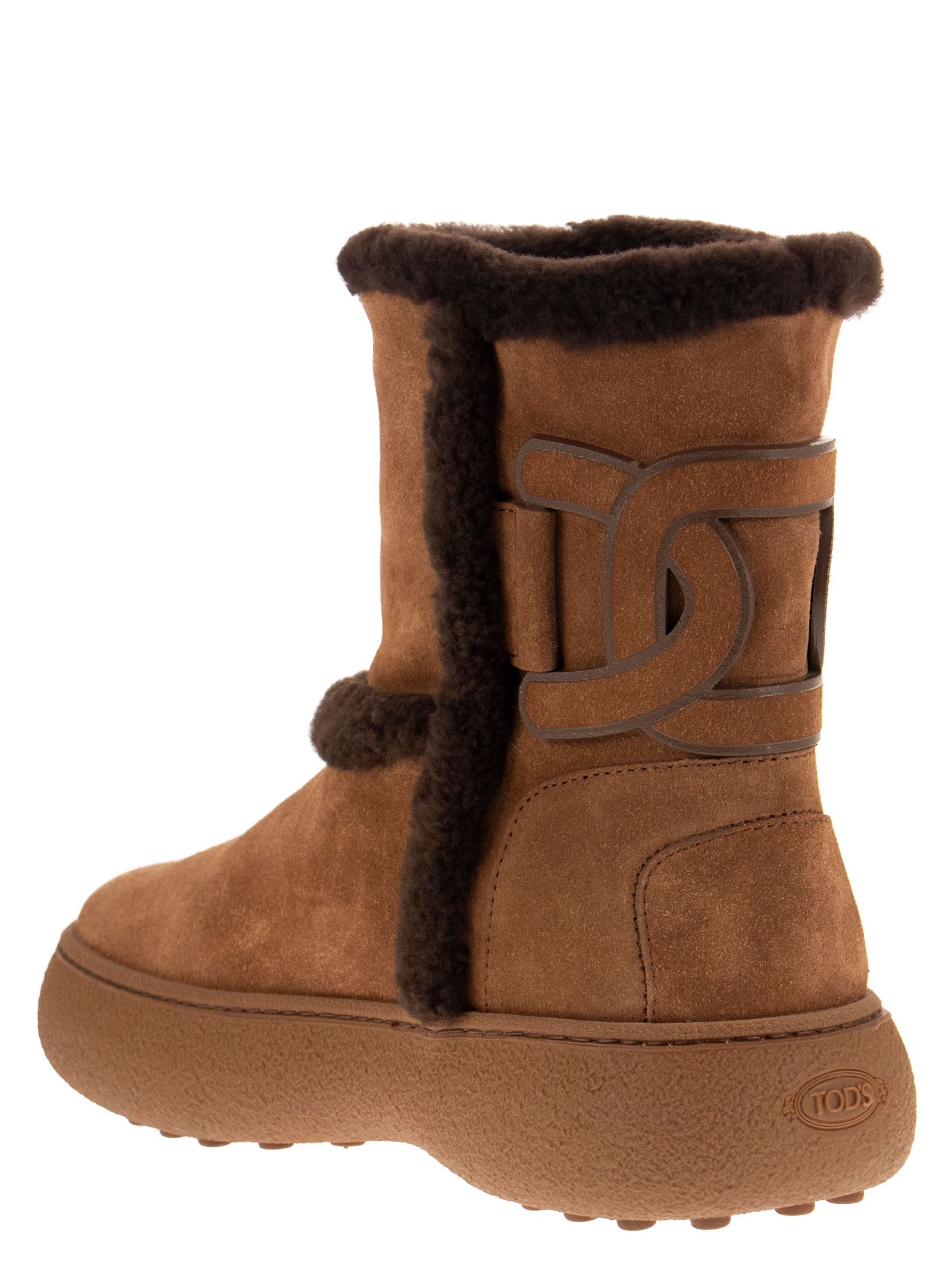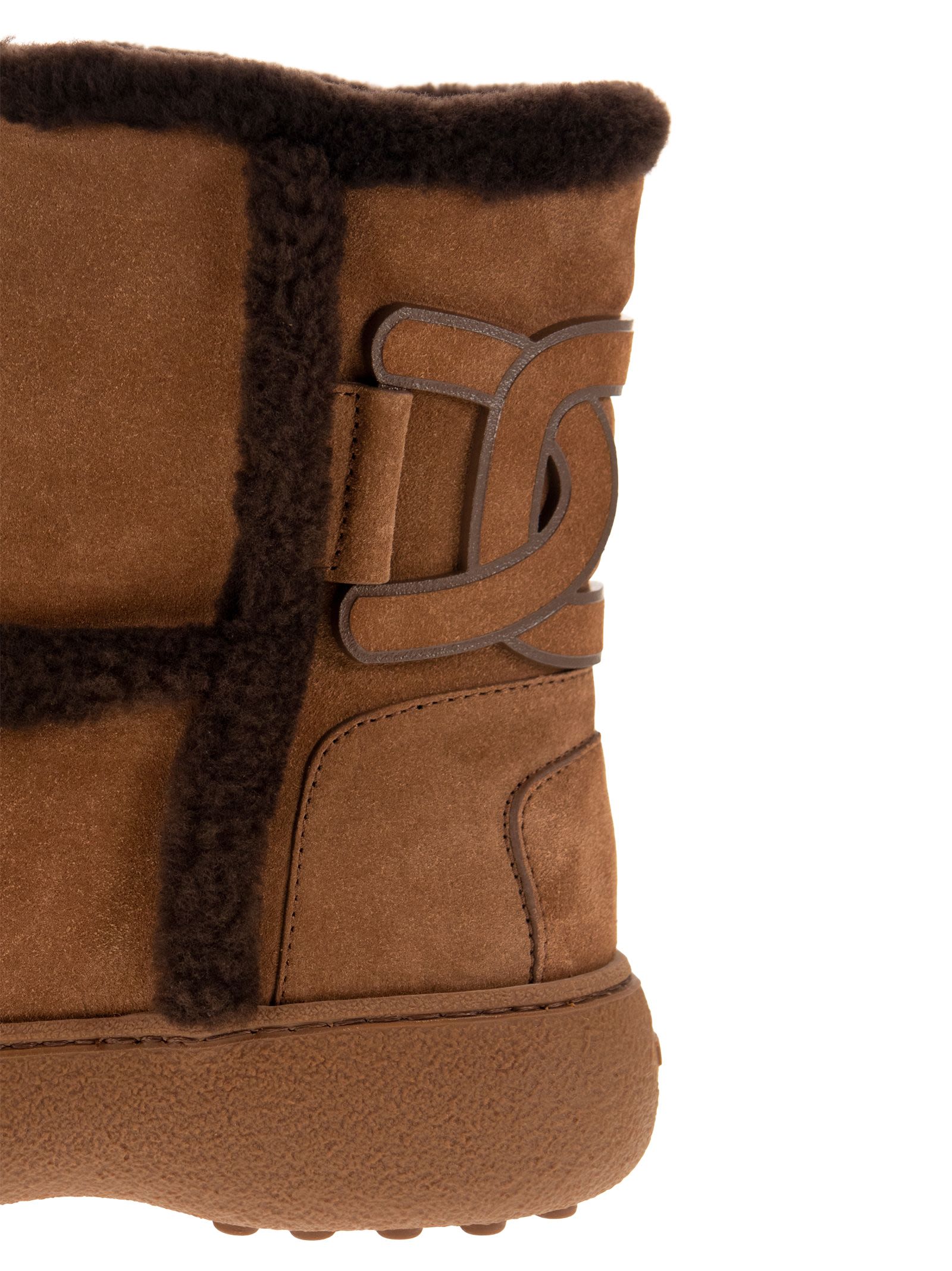 Characterised by a chunky but at the same time sober and refined sole, Tod's W. G. is here proposed in an ankle boot version. Made of suede, with iconic gommini on the bottom, it features the iconic chain motif on the back, also in suede, and a warm sheepskin lining. - Made in Italy - Chain motif on the back - Sheepskin lining - Rubber sole with embossed rubber grommets - Tod's logoed pouch DESIGNER ID: XXW09J0HQ60I0X02S5