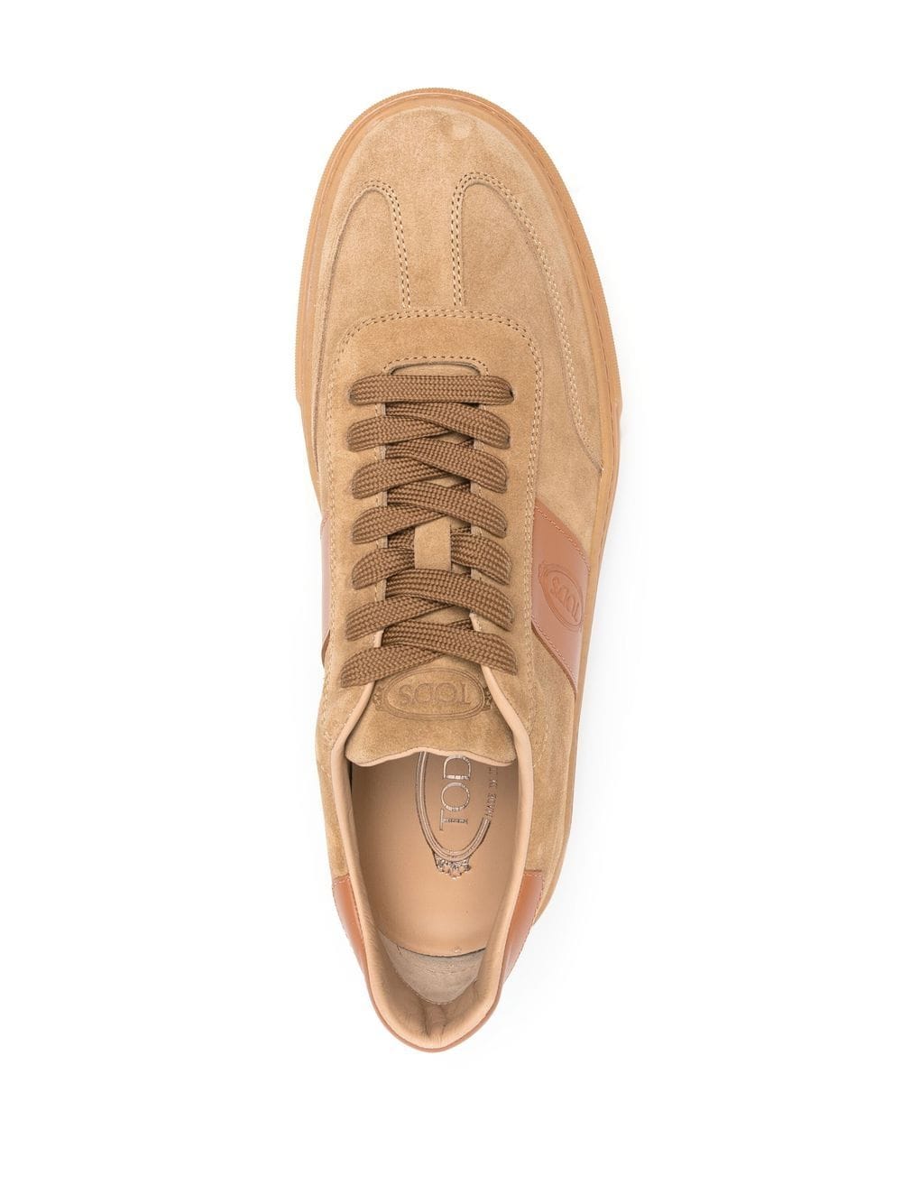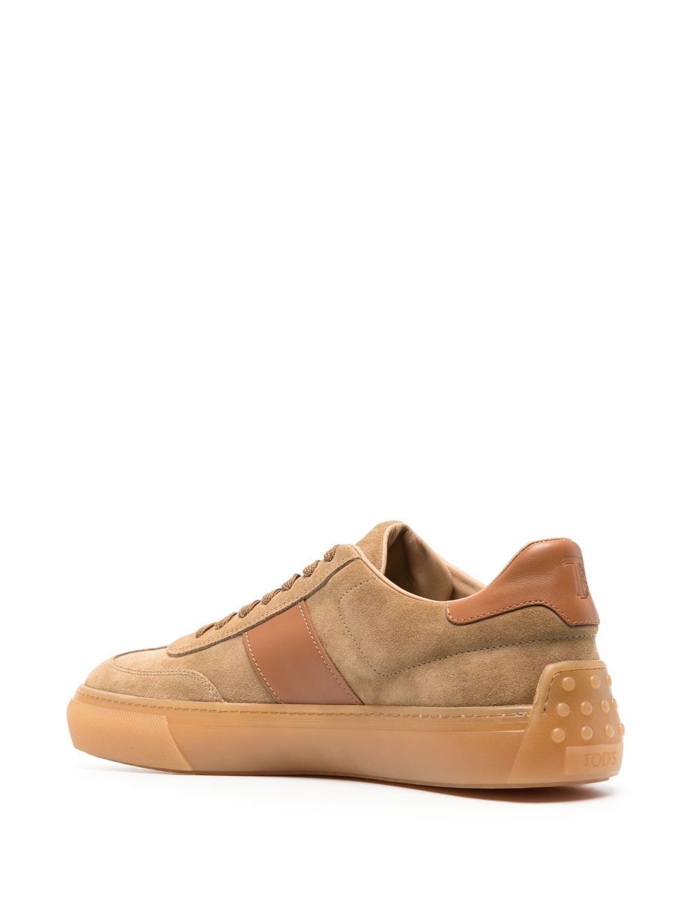 suede low-top sneakers from TOD'S featuring light brown, calf suede, logo patch to the side, round toe, front lace-up fastening, logo-embossed tongue, branded insole and flat rubber sole.