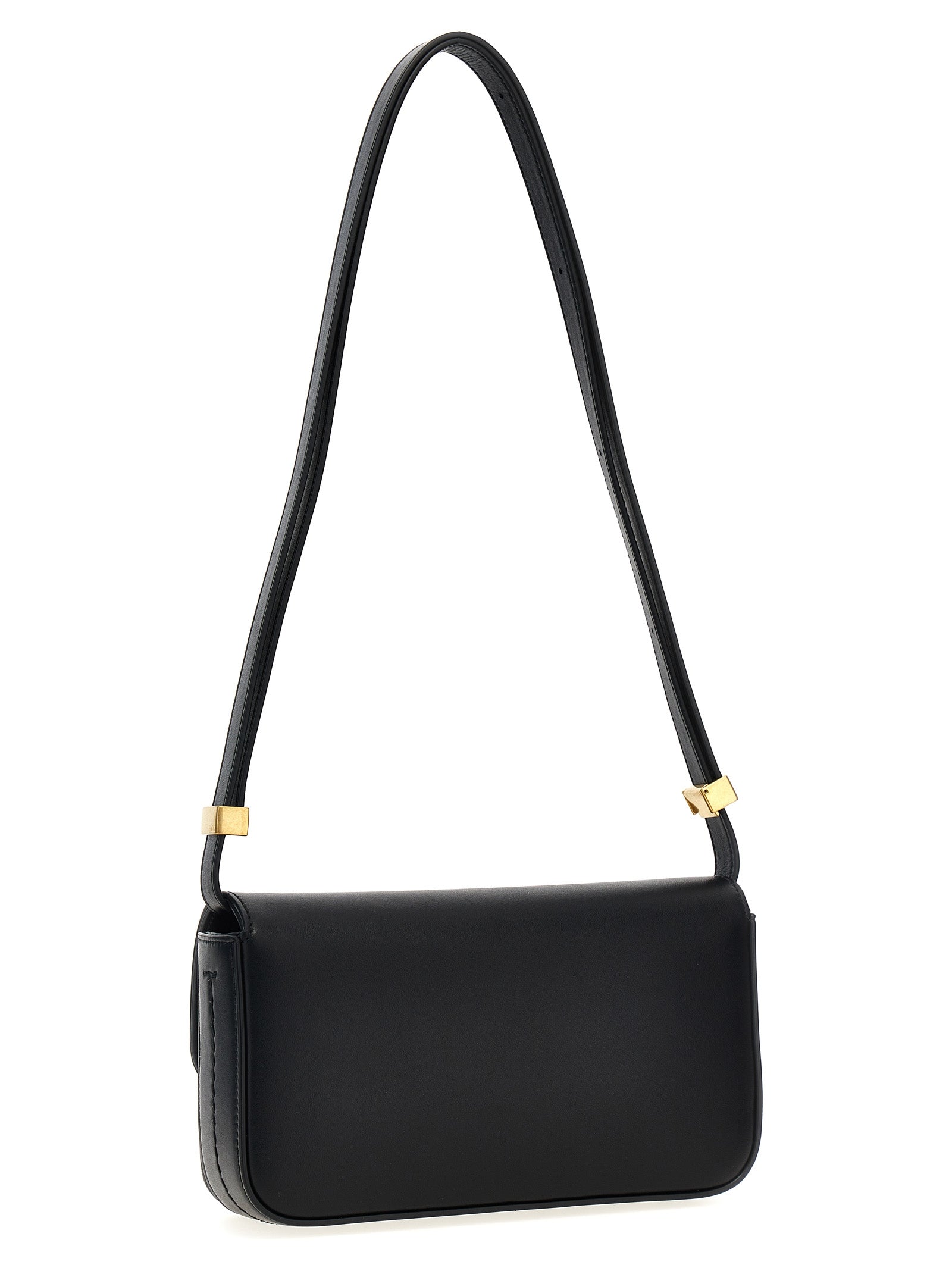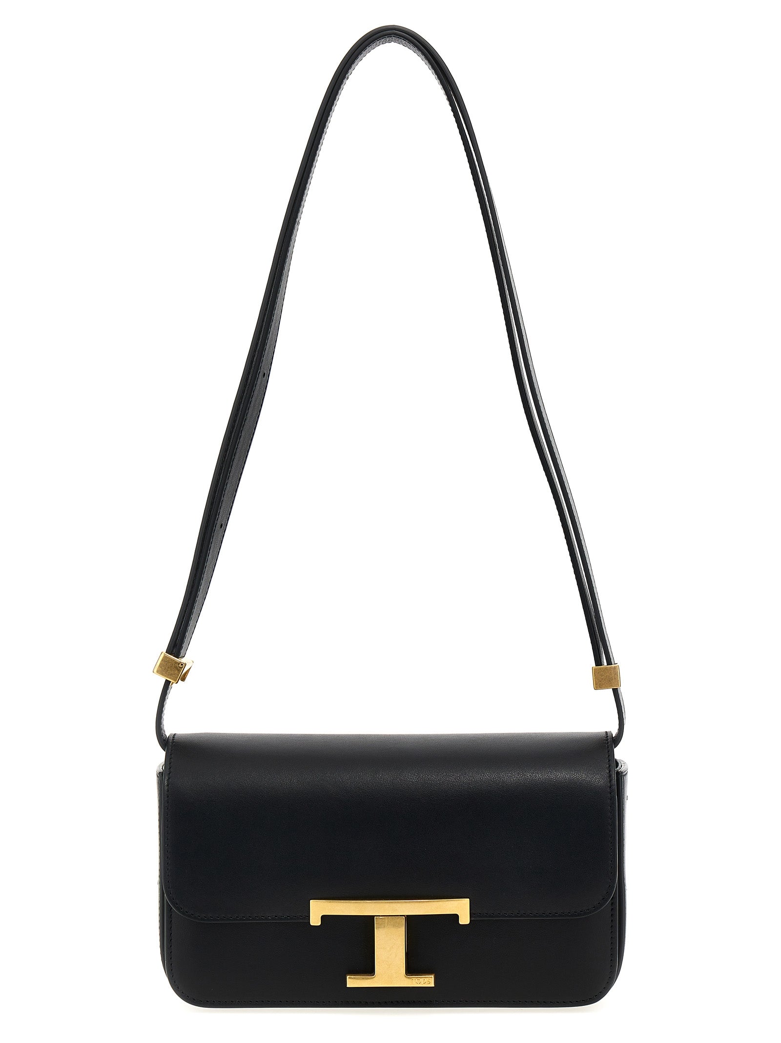 'T Micro' leather crossbody bag, magnetic flap closure with metal logo appliqué, adjustable shoulder strap.