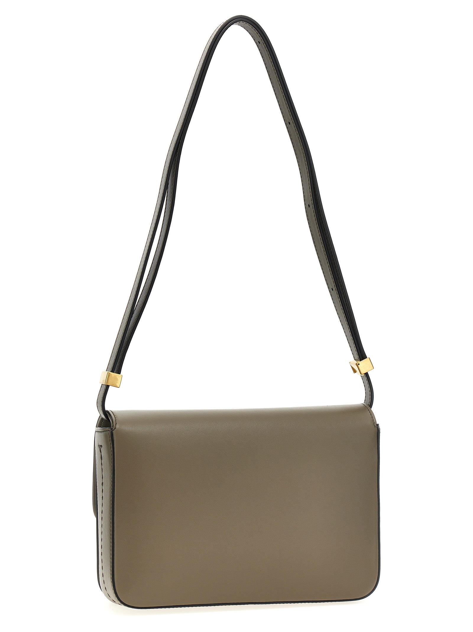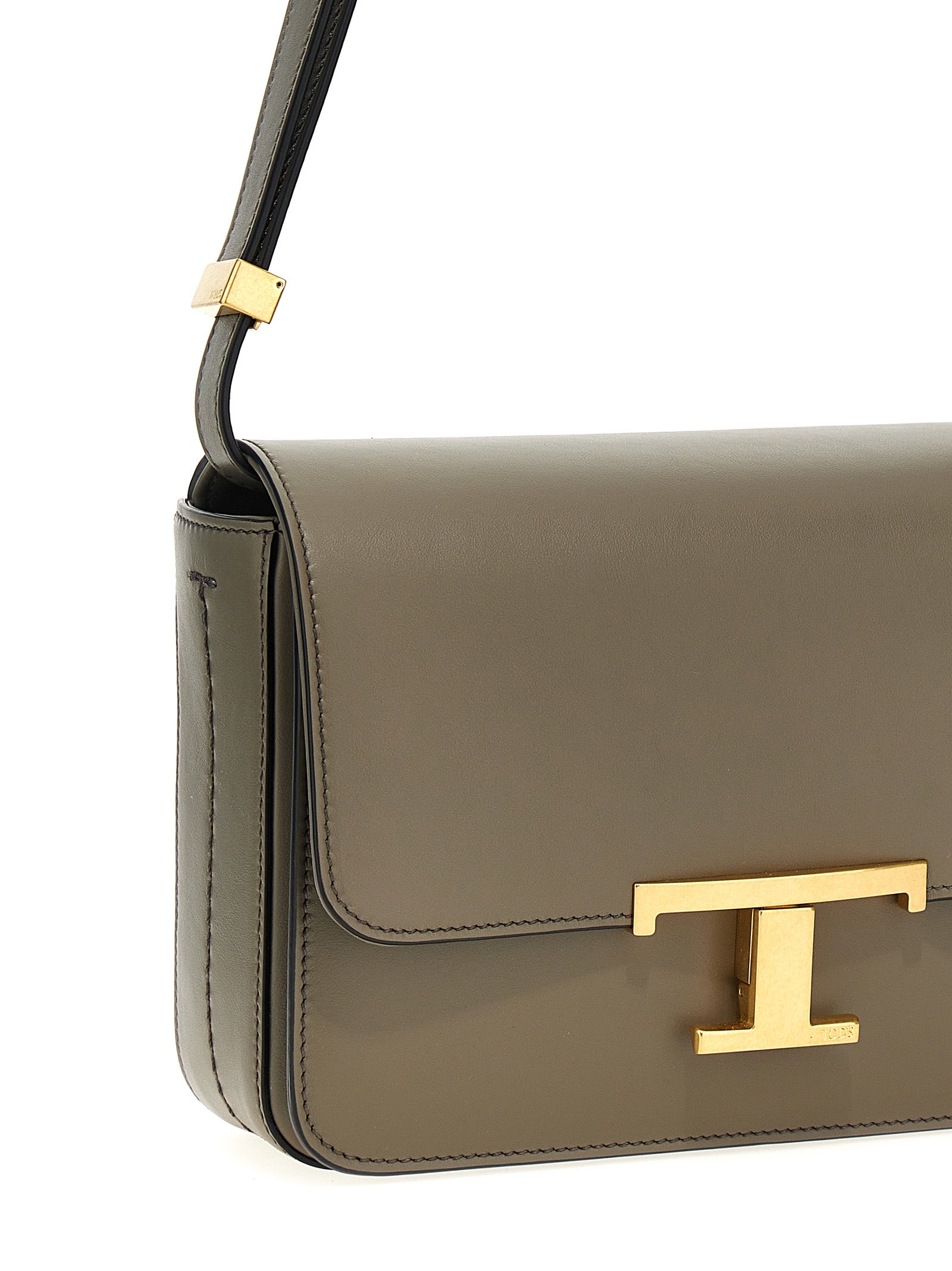 'T Mini' leather crossbody bag, magnetic flap closure with metal logo appliqué, adjustable shoulder strap.