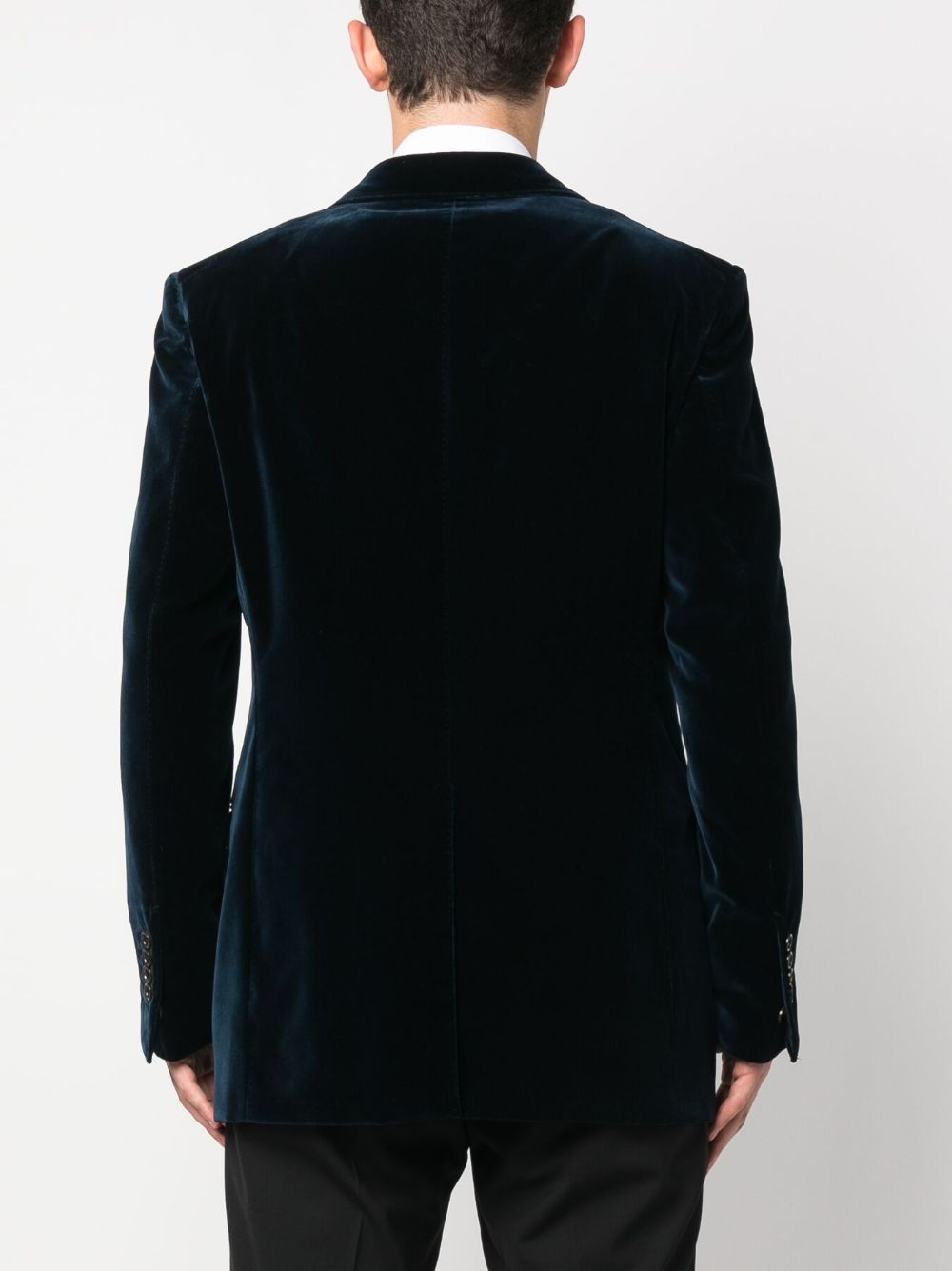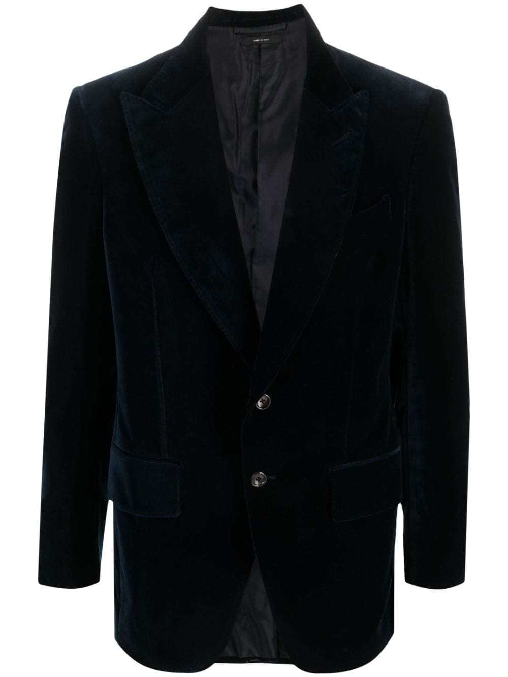 single-breasted velvet blazer from TOM FORD featuring midnight blue, cotton, velvet, notched collar, notched lapels, long sleeves, front button fastening, two side flap pockets and full lining.