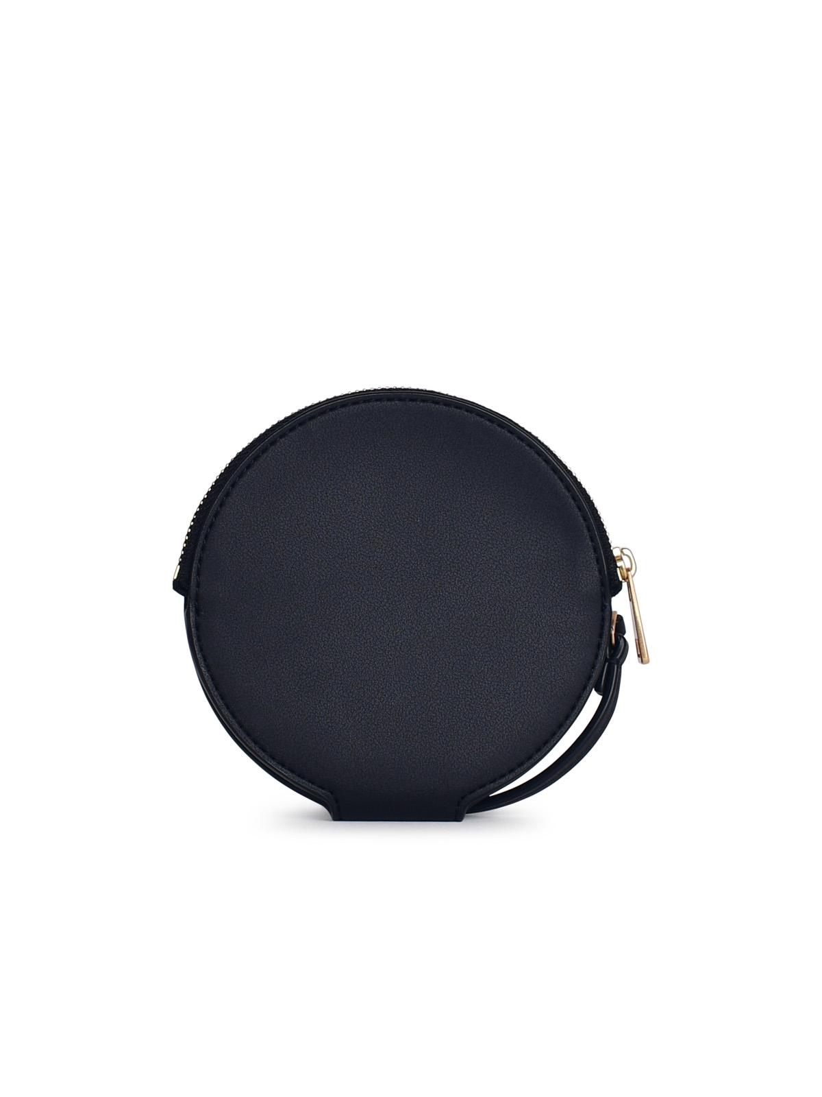 Round shape, full zip closure, cuff or bag hook, tonal front logo, four card slots, snap closure, coin zipper compartment \n12 x 11 x 2 cm
