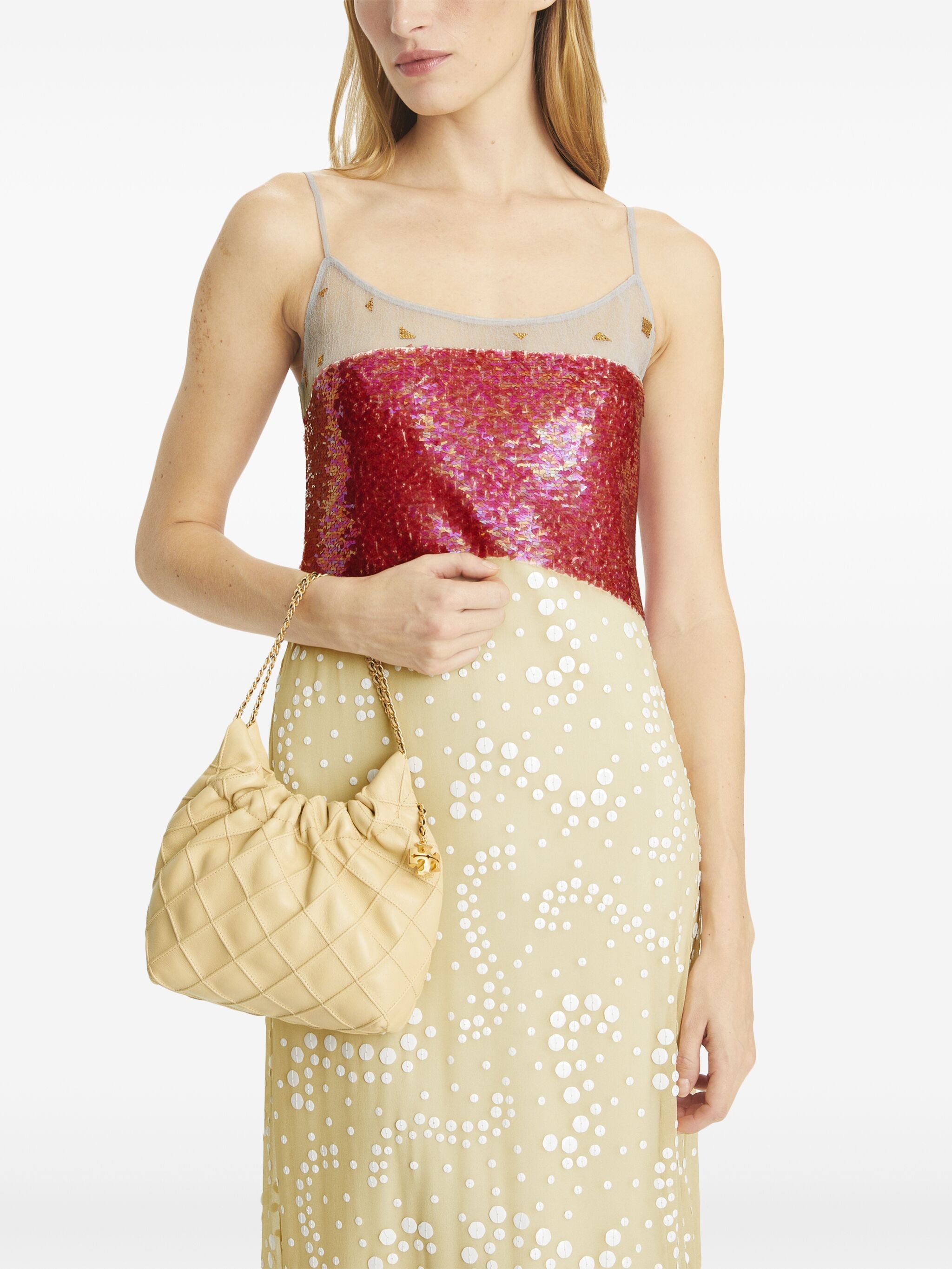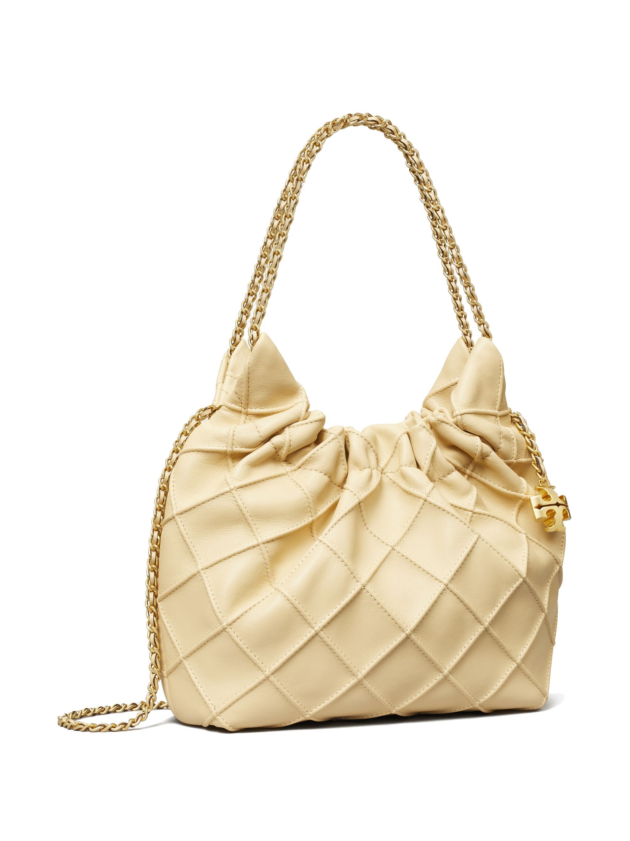 The Fleming Mini with drawstring by Tory Burch combines elegance and functionality, with quilted diamond details and braided leather and chain shoulder strap.