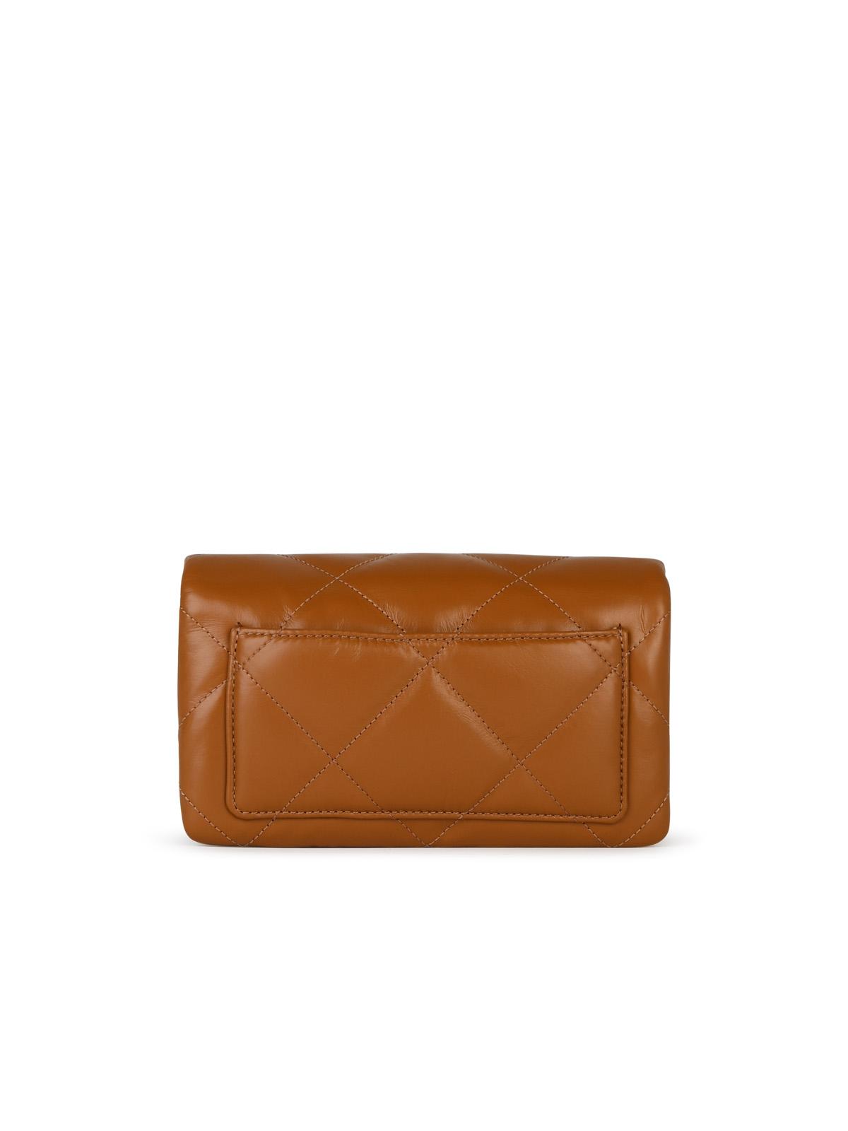 Made of quilted leather, chain shoulder strap with leather inserts, contrasting logo on the front, flap closure with magnetic button, one central zip pocket, four card pockets, one bill pocket, one slit pocket in the back\n21 x 12 x 4 cm