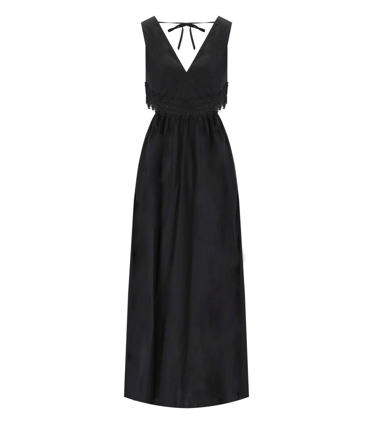 Twinset dress made of black cotton poplin. Cut-out details on the sides, V-neck and macramé lace applications on the chest. Tie straps on the back and gold logo detail. Soft fit. Composition: 96% cotton, 4% elastane.