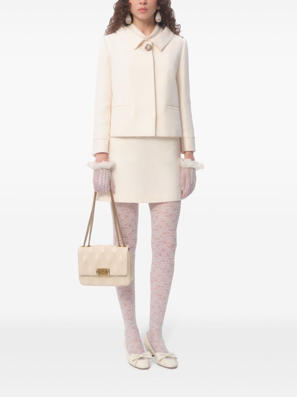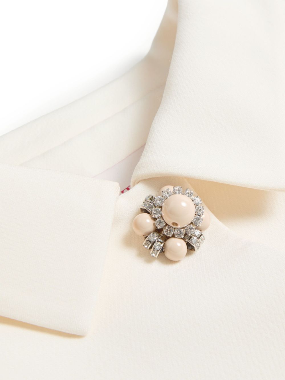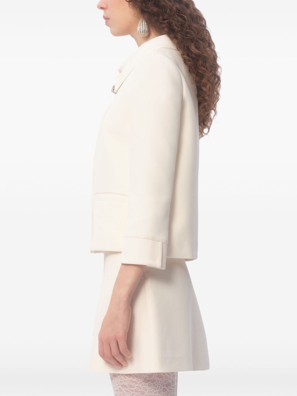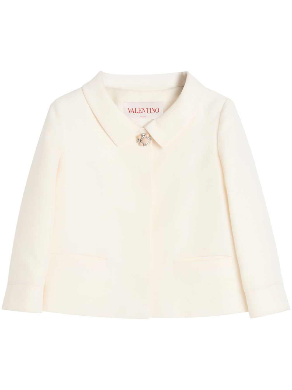 light beige virgin wool-silk blend bead detailing concealed front button fastening spread collar two front jetted pockets long sleeves straight hem