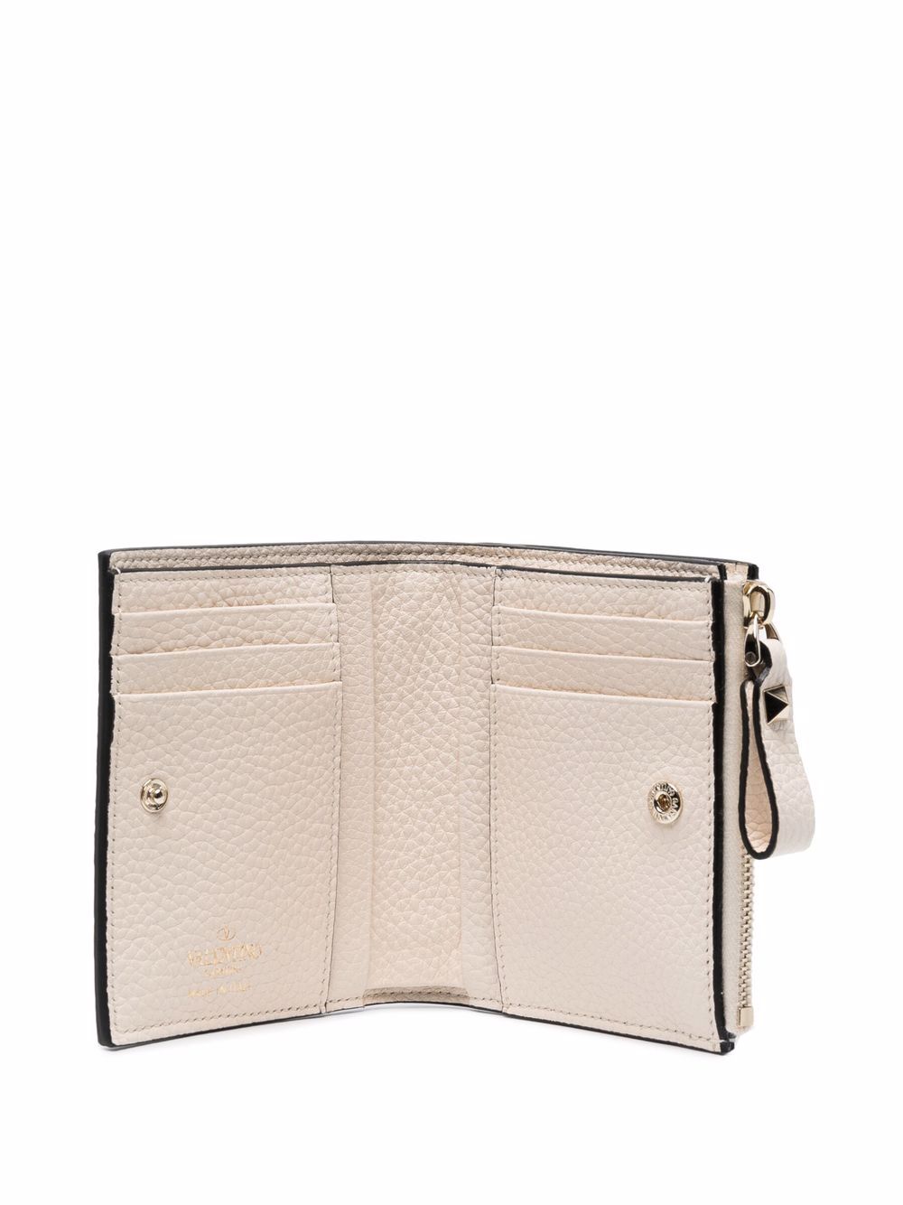 Hammered texture, gold-tone Rockstud details, gold-tone lettering logo, bi-fold design, internal card slots, internal zip pocket and internal logo print.