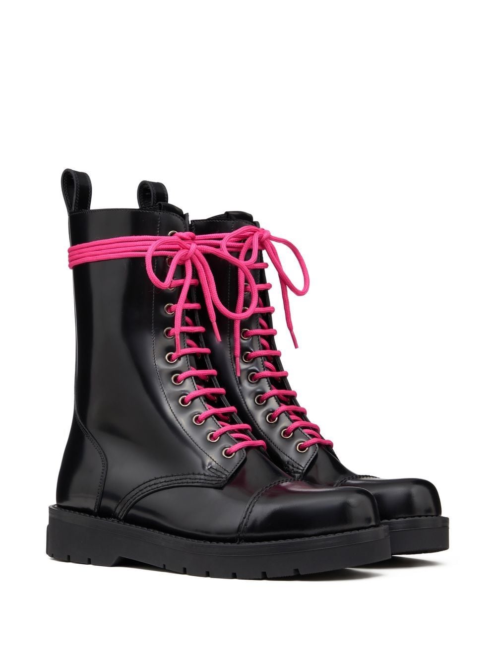 Untitled leather combat boots from VALENTINO GARAVANI featuring black, fuchsia pink, calf leather, lambskin, pull-tab at the heel, contrasting laces, stud detailing and front lace-up fastening.