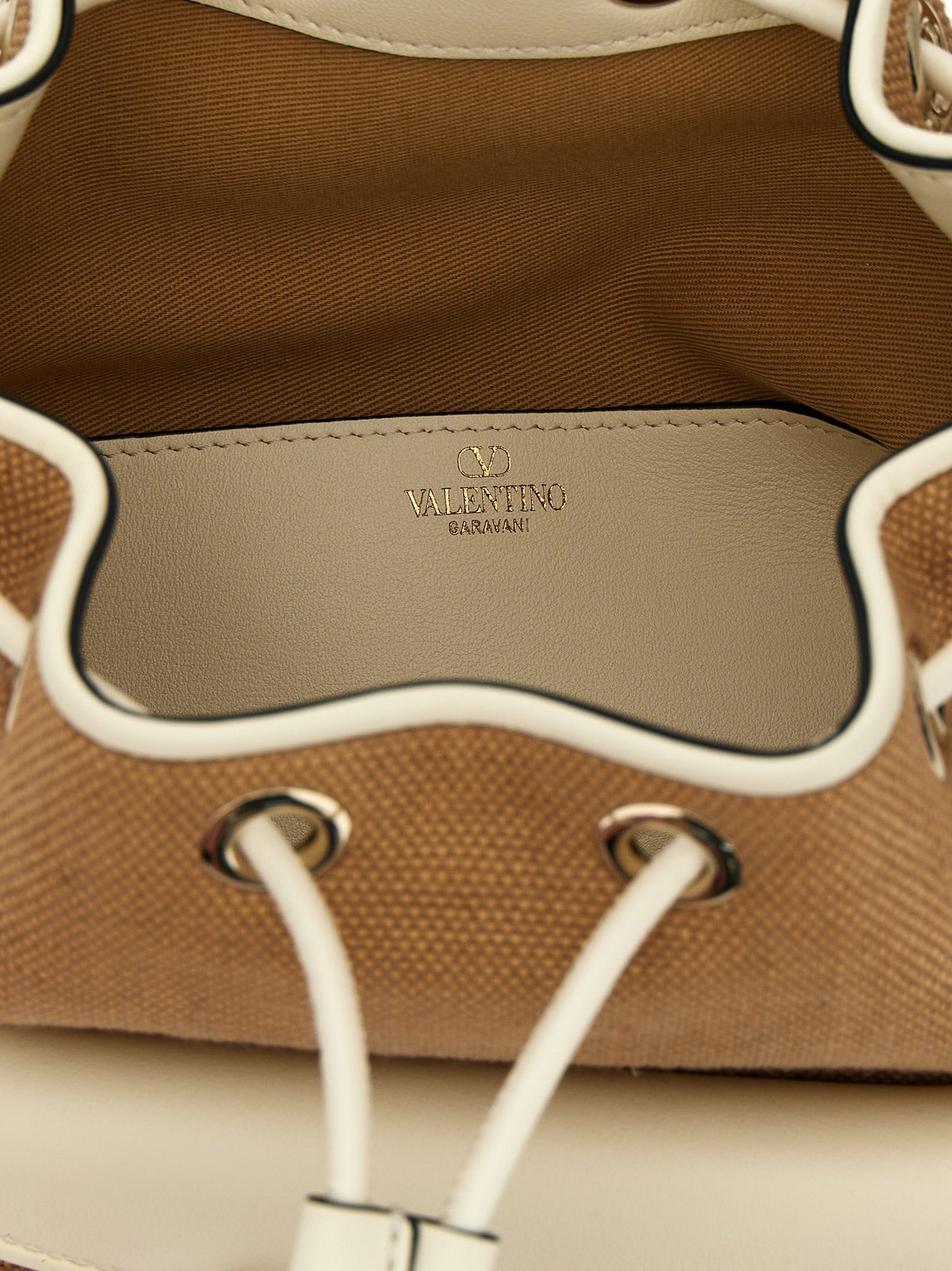 Valentino Garavani 'Locò' raffia handbag with leather details, drawstring closure, front flap with metal logo, removable top handle, adjustable and removable shoulder strap.