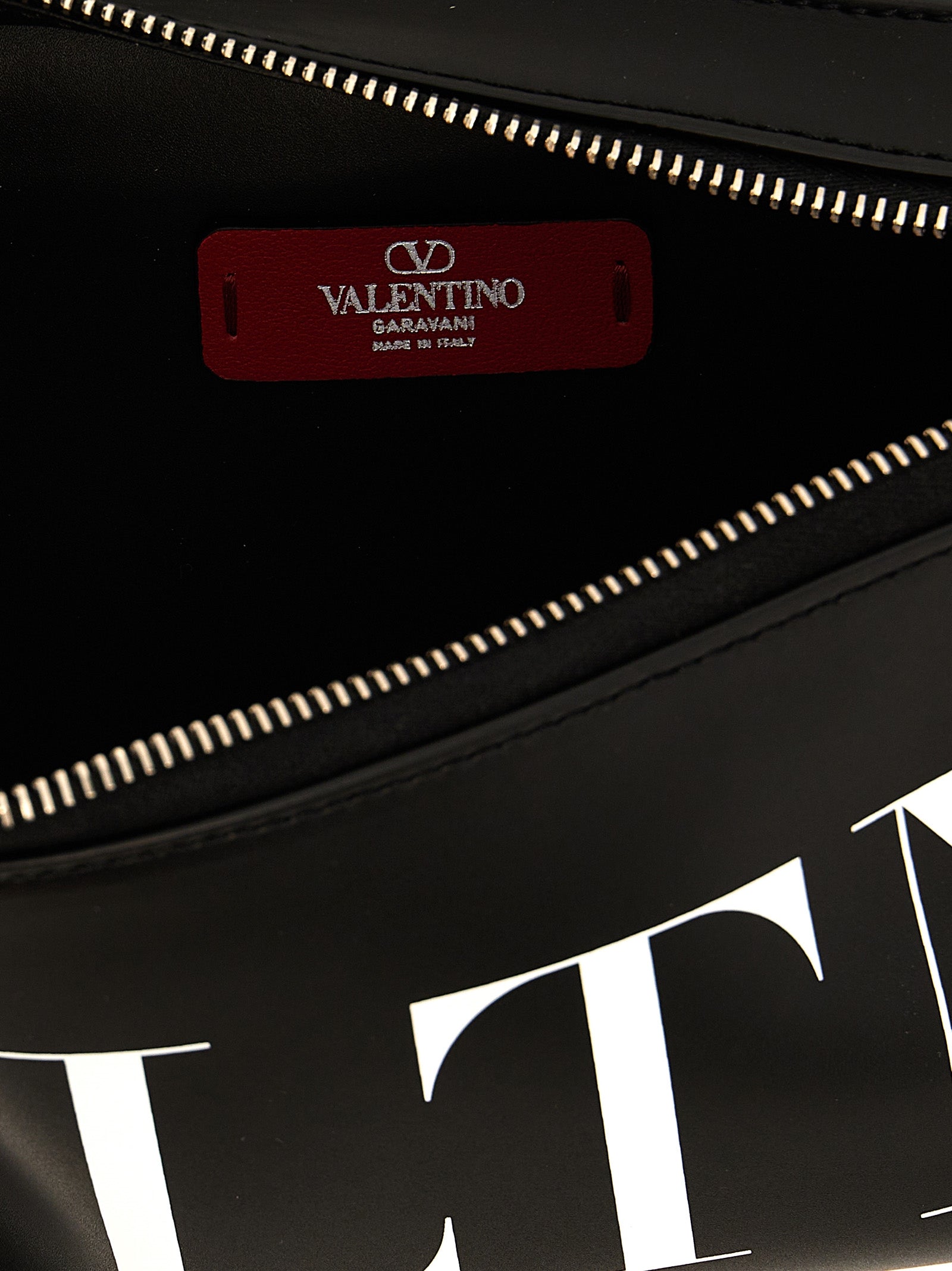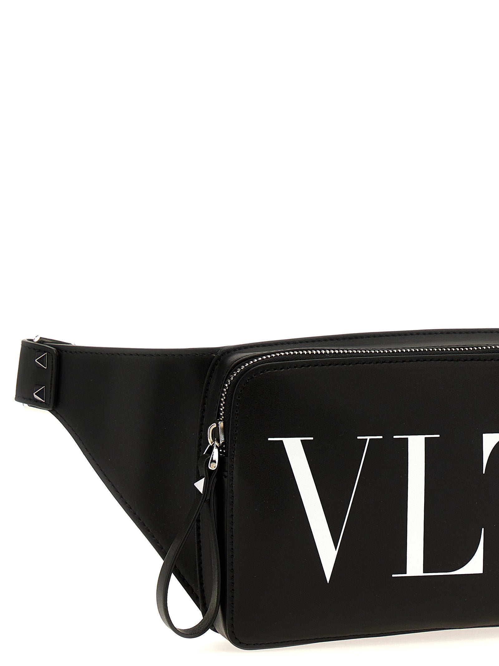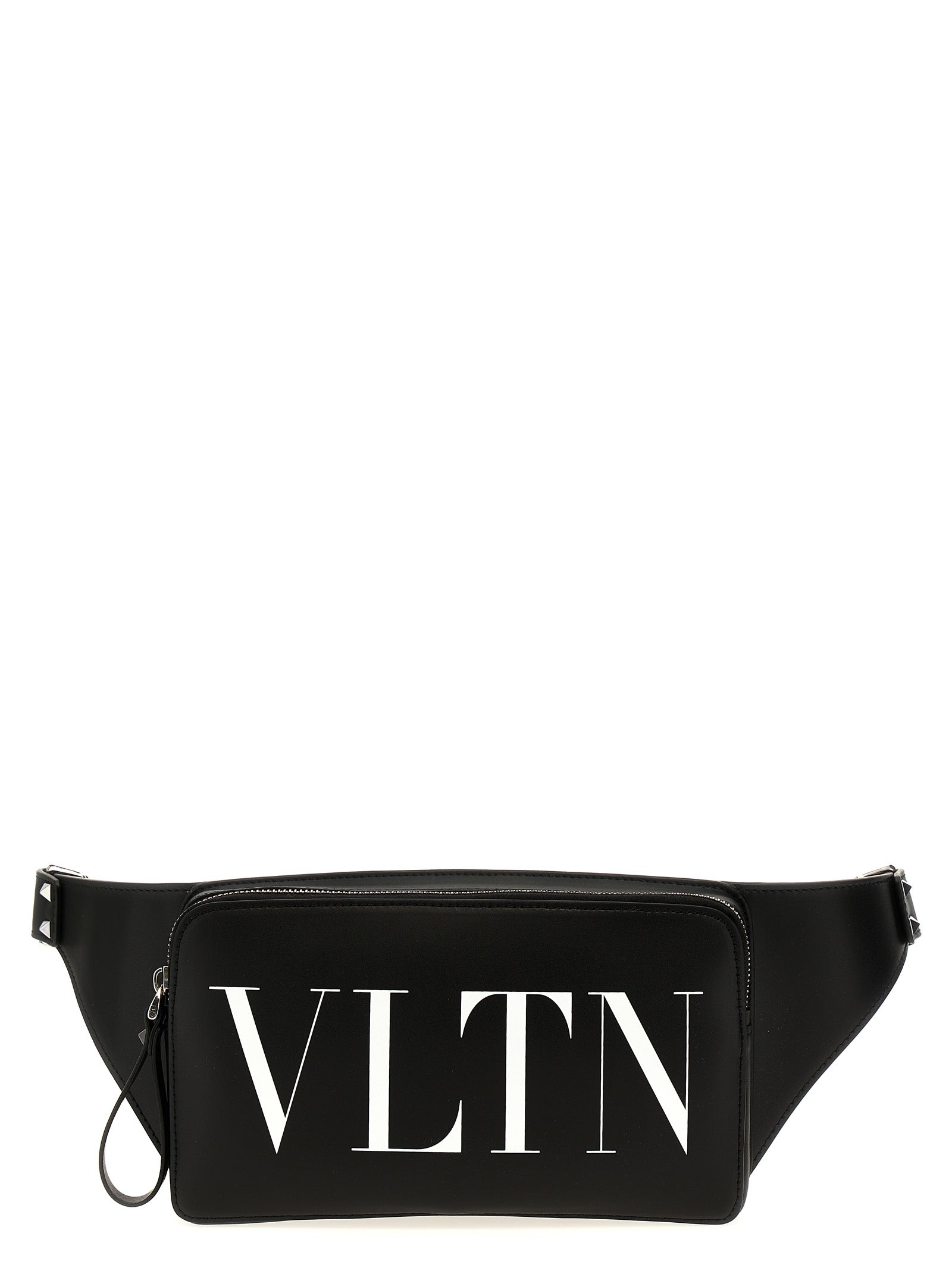 Leather fanny pack with 'VLTN' logo print, zip closure, adjustable shoulder strap.