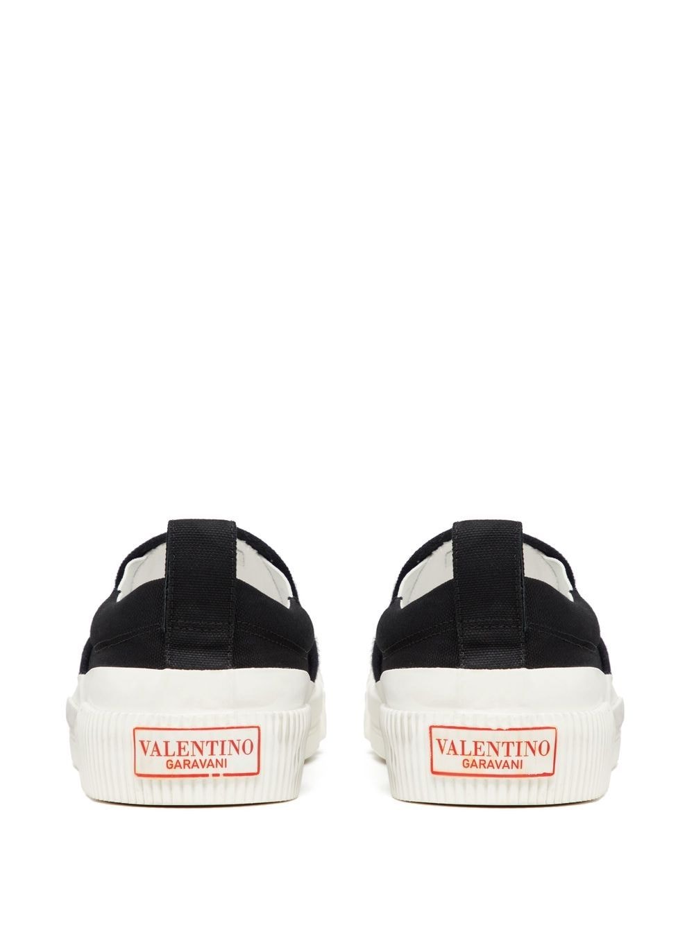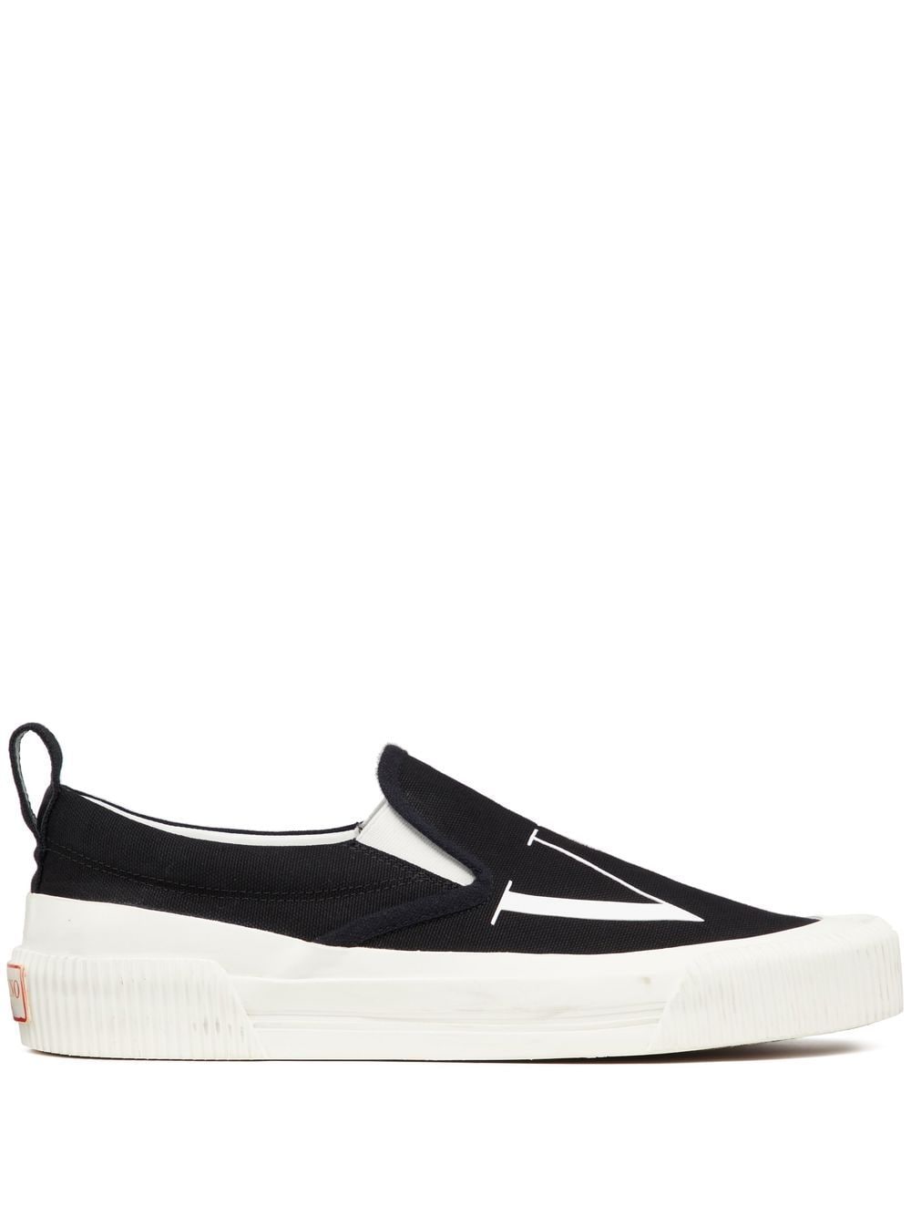 VLTN slip-on sneakers from VALENTINO GARAVANI featuring black/white, cotton, logo print to the front, logo patch to the rear, pull-tab at the heel, round toe, branded insole, flat rubber sole and slip-on style.