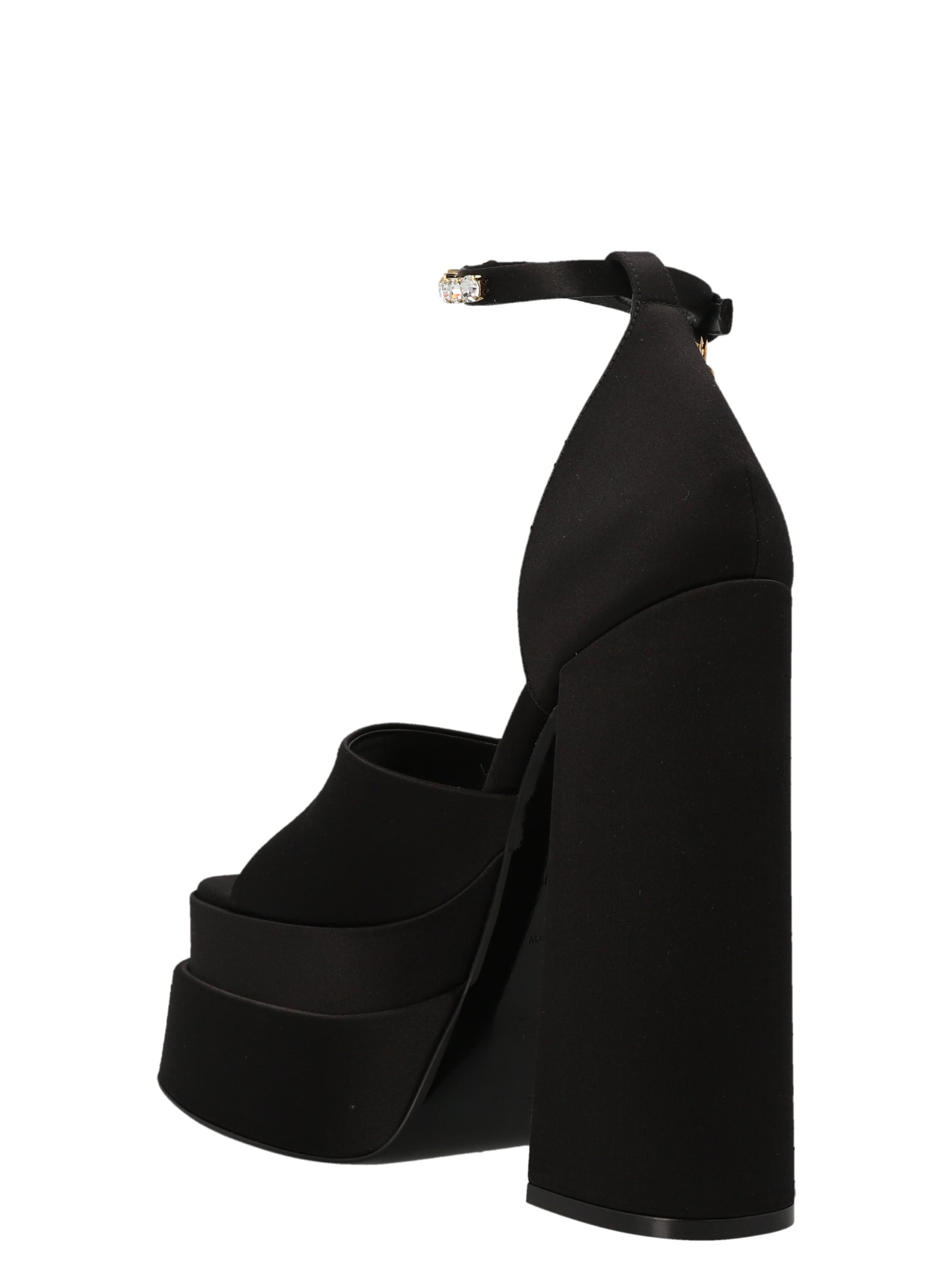 'Medusa aevitas' satin platform sandals with ankle strap embellished with crystals and Medusa pendant.