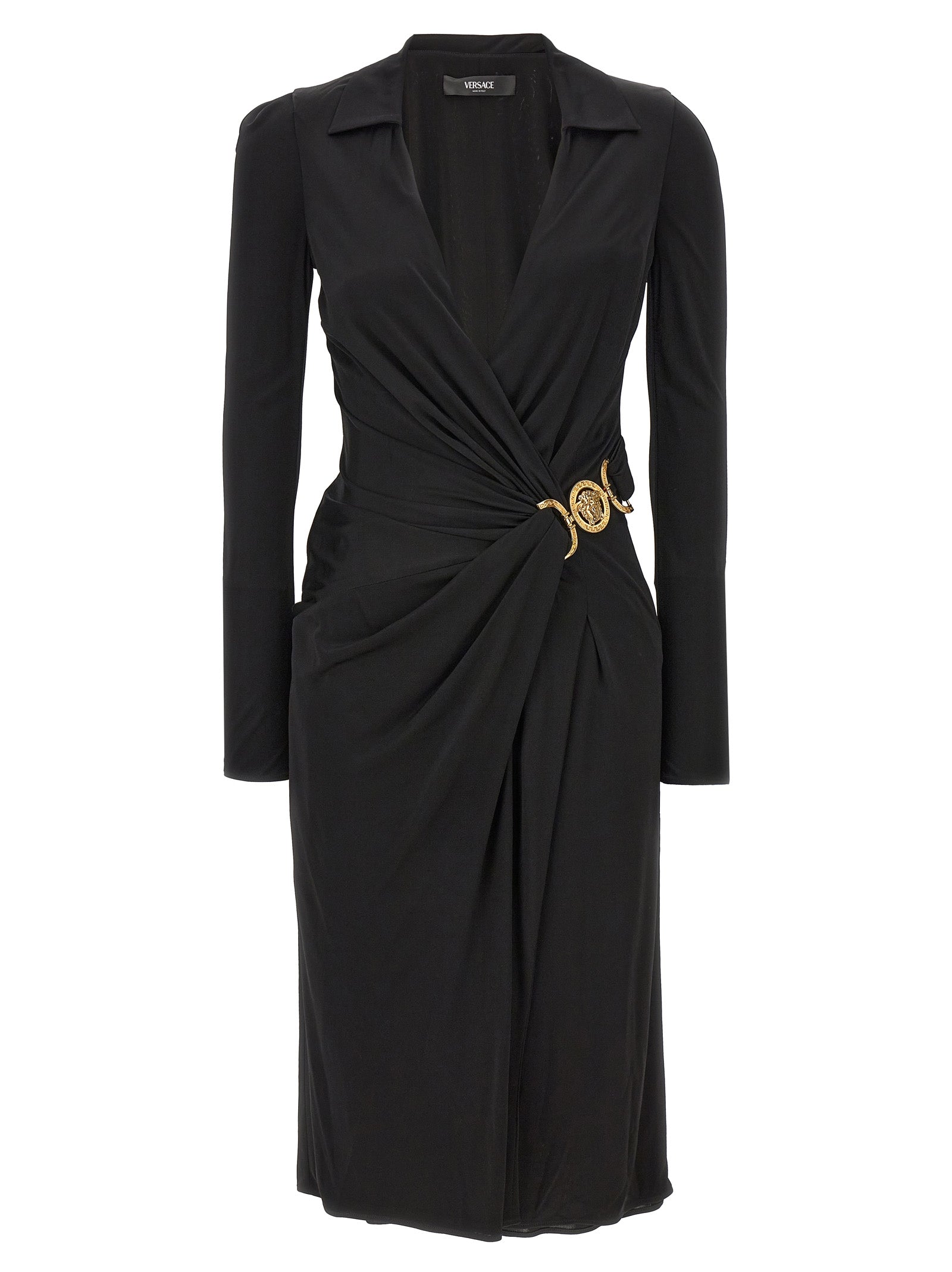 Viscose strech dress, wide V-neck and draping at the waist with metallic 'Medusa', long sleeves.