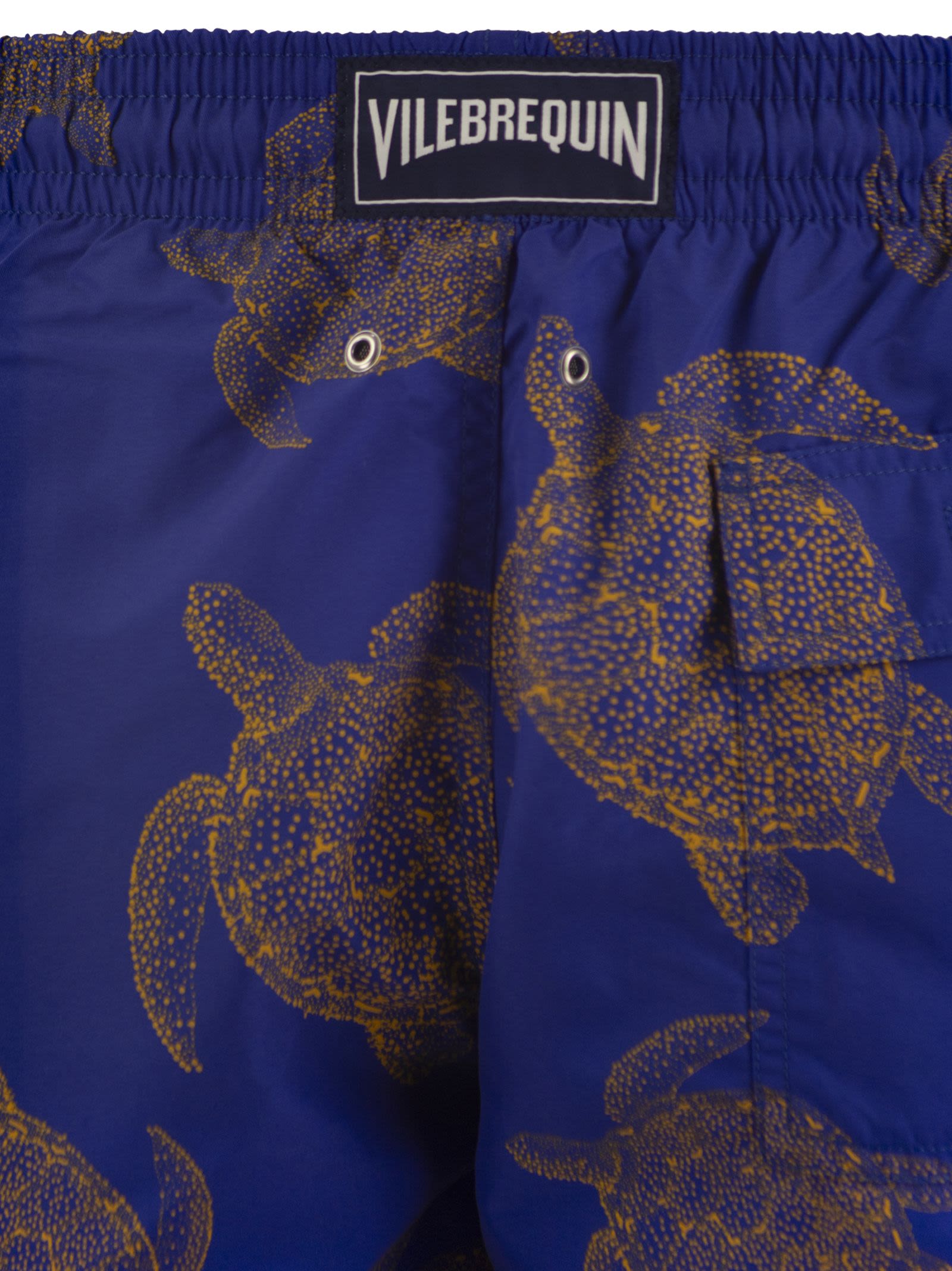 Decorated with turtles swimming against a Marrakech blue background, these recycled polyamide swim shorts feature a comfortable elasticated waistband and a distinctive drawstring with zamak ends. - Swimsuit with elastic waistband and drawstring with Vilebrequin logo engraved on zamak ends - Side pockets - Hand-sewn back pocket for perfect visual continuity with the swimsuit print - Two back grommets allow water to drain away to reduce the “balloon” effect when exiting the water - Integral water-resistant mesh lining (100% polyamide) - Fabrics are treated for quick drying DESIGNER ID: MOOCB105 613