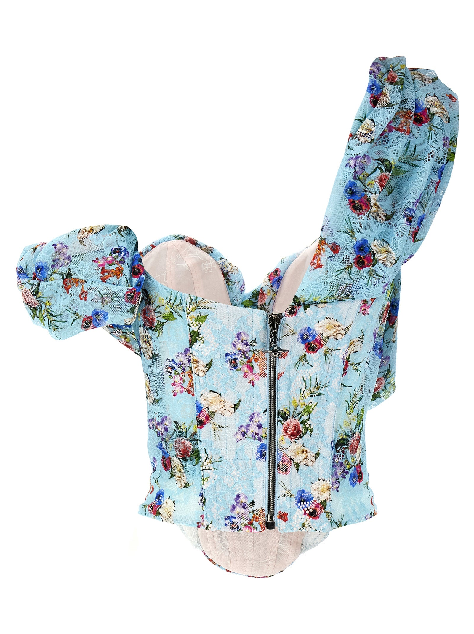 Knot Corset' tulle top with trimmings, sweetheart neckline with front draping, asymmetrical shoulder straps, corset with slats inside, back zip closure.