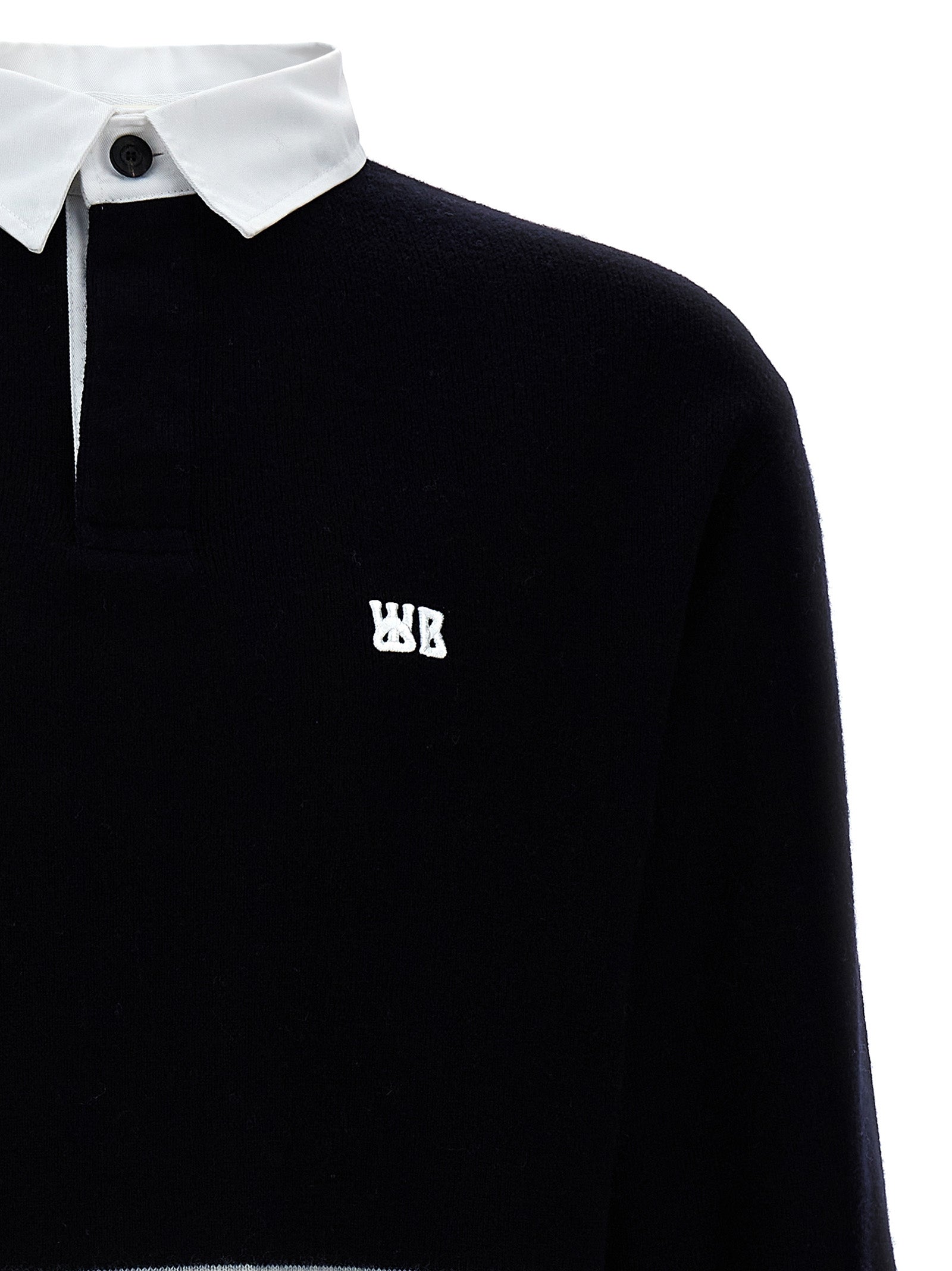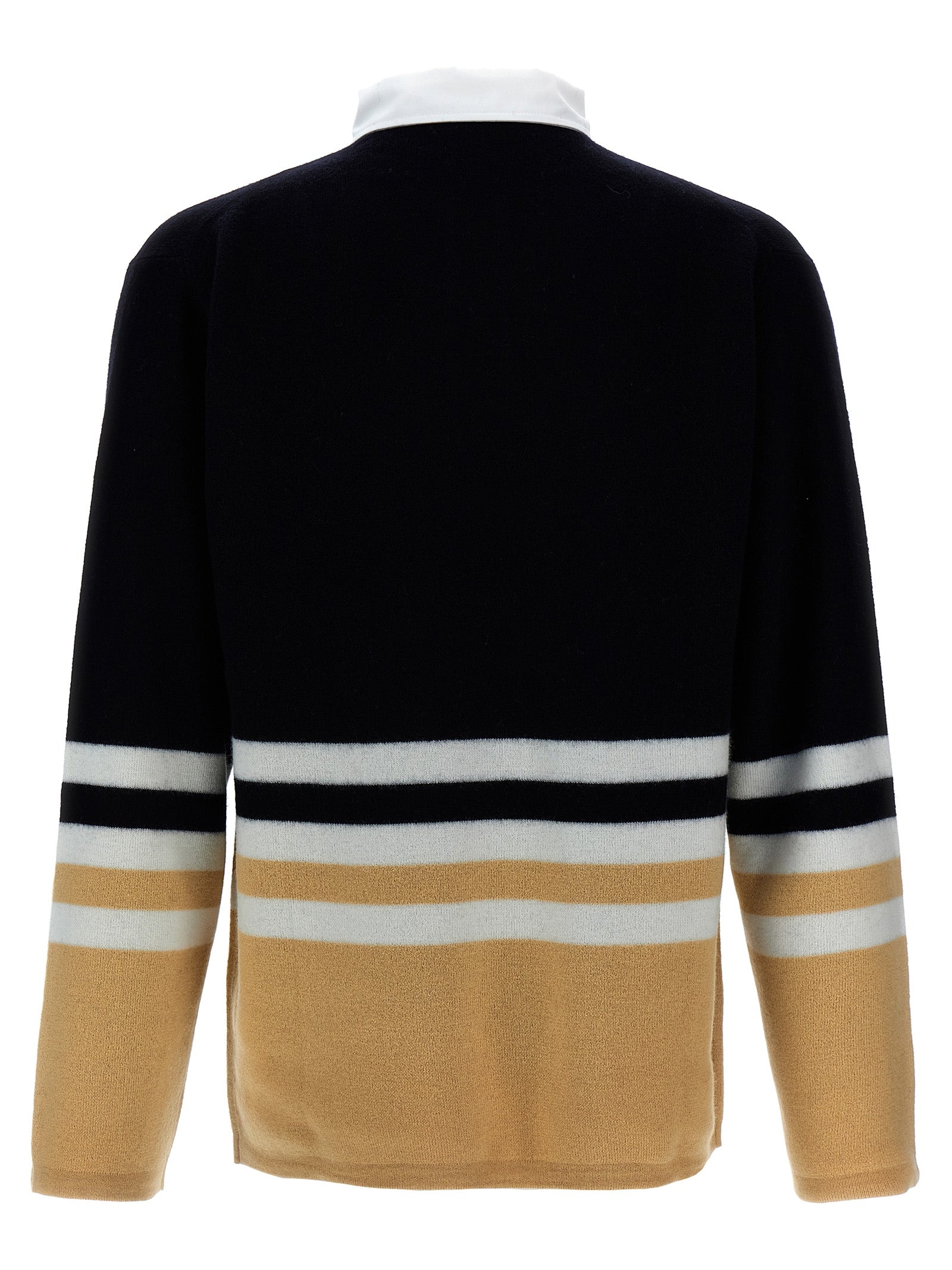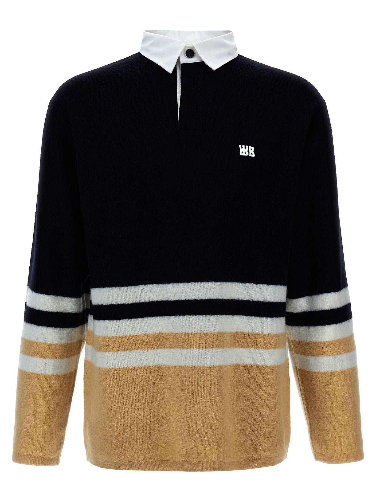 'Cypher' striped wool knit polo shirt with contrast collar, front logo embroidery, long sleeves.