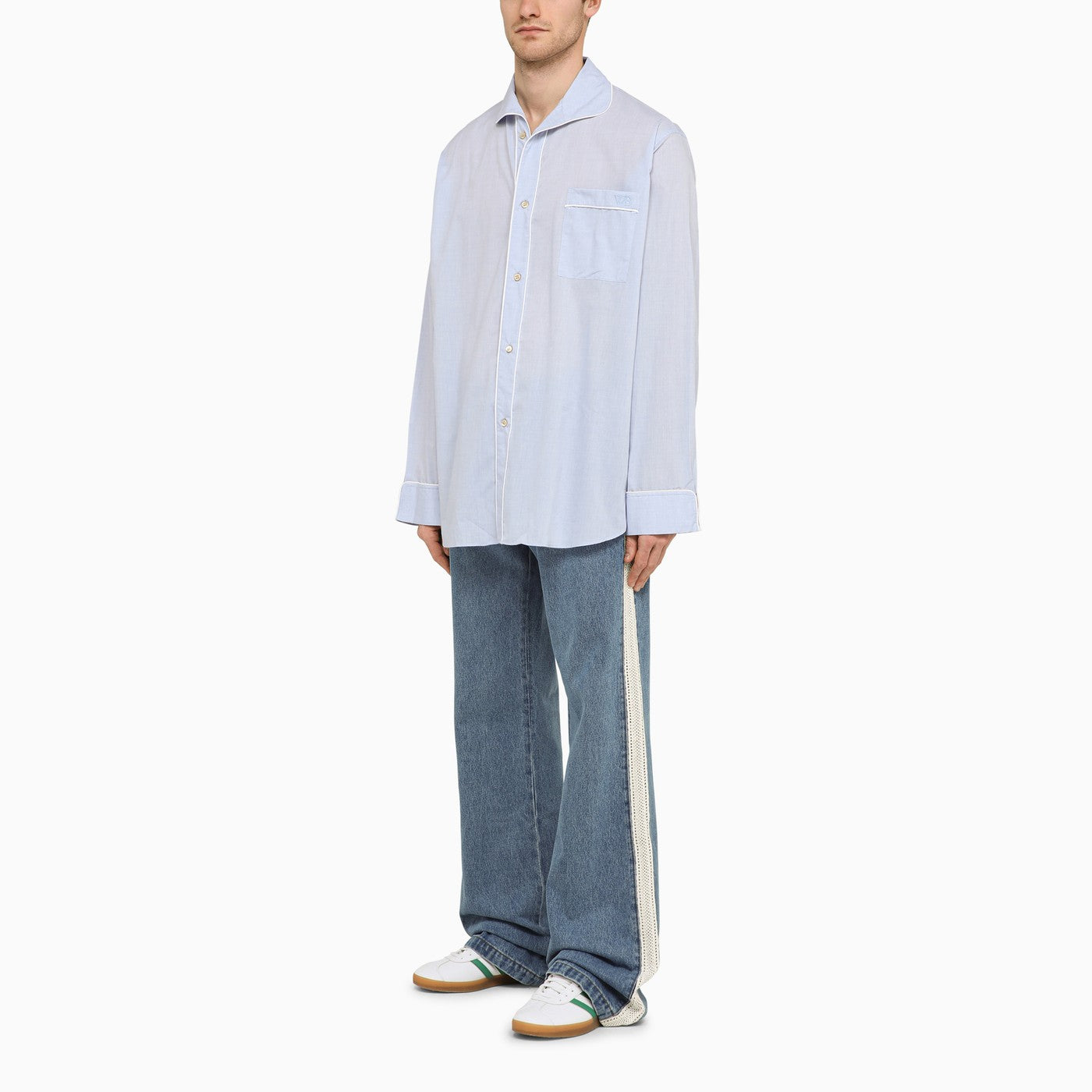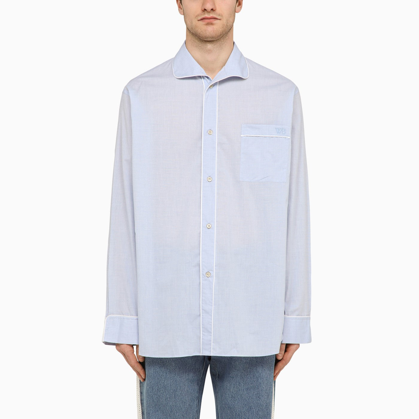 Long-sleeved shirt by Wales Bonner in light blue cotton featuring contrasting white piping, collar, frontal placket, breast pocket with logo embroidery, long sleeves and button cuffs.