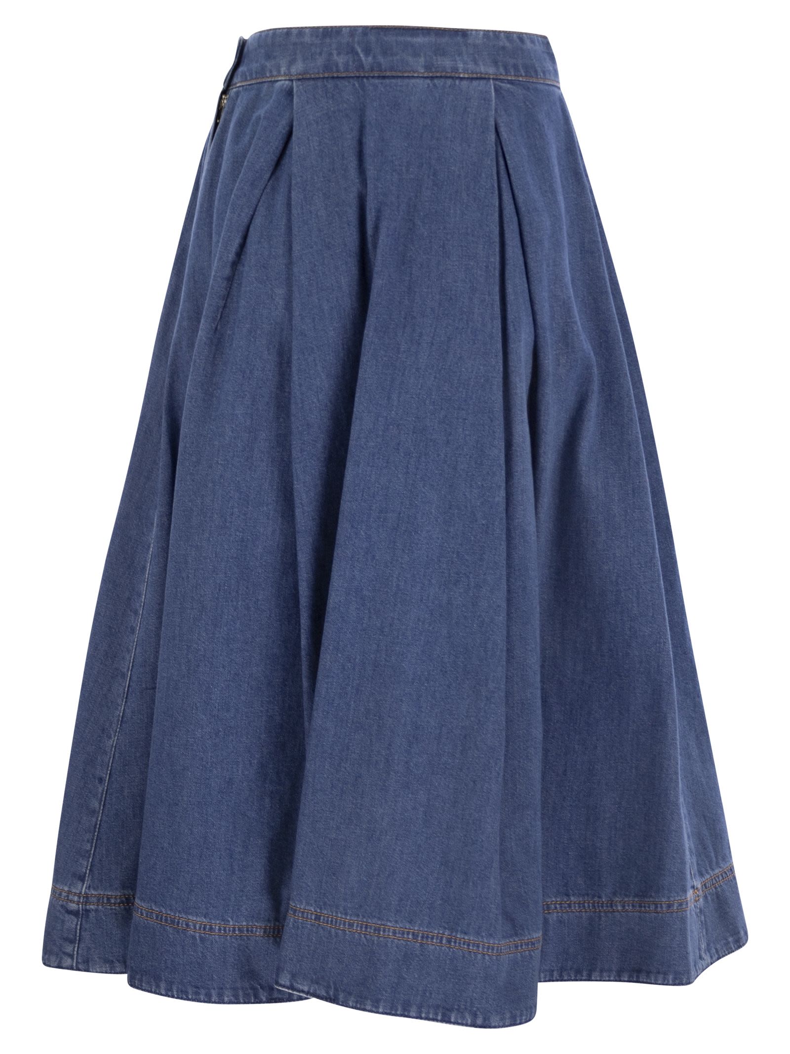 Pure cotton denim skirt with welt pockets. The pleated motif stitched at the waist enhances the wide line of the garment. Zip and button fastening on the side. Unlined. The garment is part of the new ‘A Weekend with Ashley Park’ capsule collection. Inspired by a Mediterranean summer and Parisian elegance, the collection offers versatile and timeless garments designed to accompany you with style and ease throughout the day. A celebration of contemporary glamour. - Closure at the hip - Unlined - Wide DESIGNER ID: 2515101016600 002