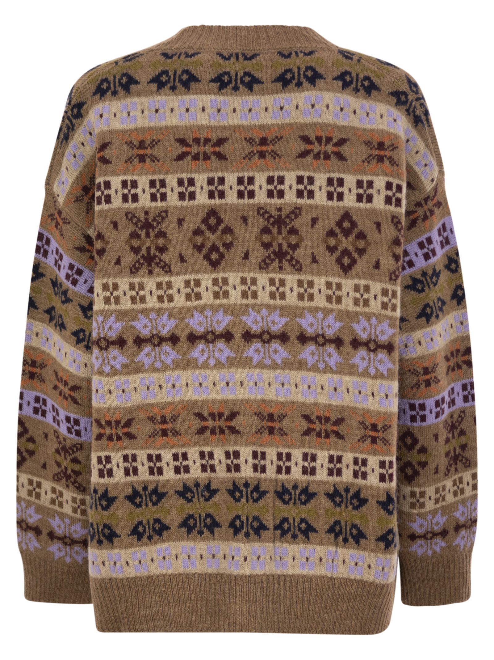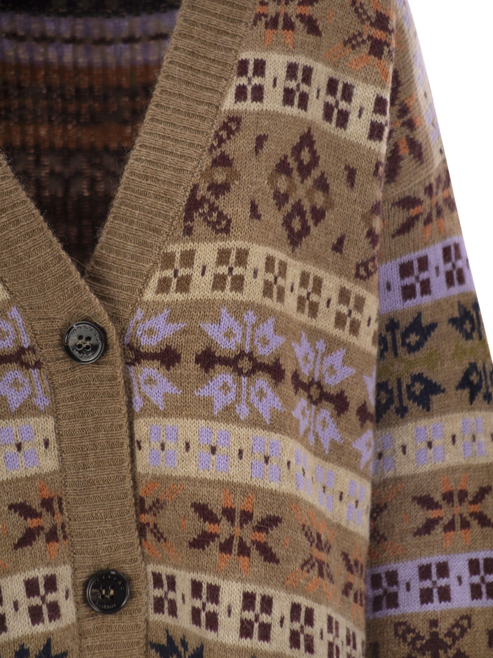 Cardigan in precious wool and alpaca yarn with an all-over jacquard design, featuring a pleasing oversized volume with a V-neck and long, low-cut sleeves. - Finished with ribbed edges - Horn-effect button closure - V-neckline DESIGNER ID: 2425346062600 001