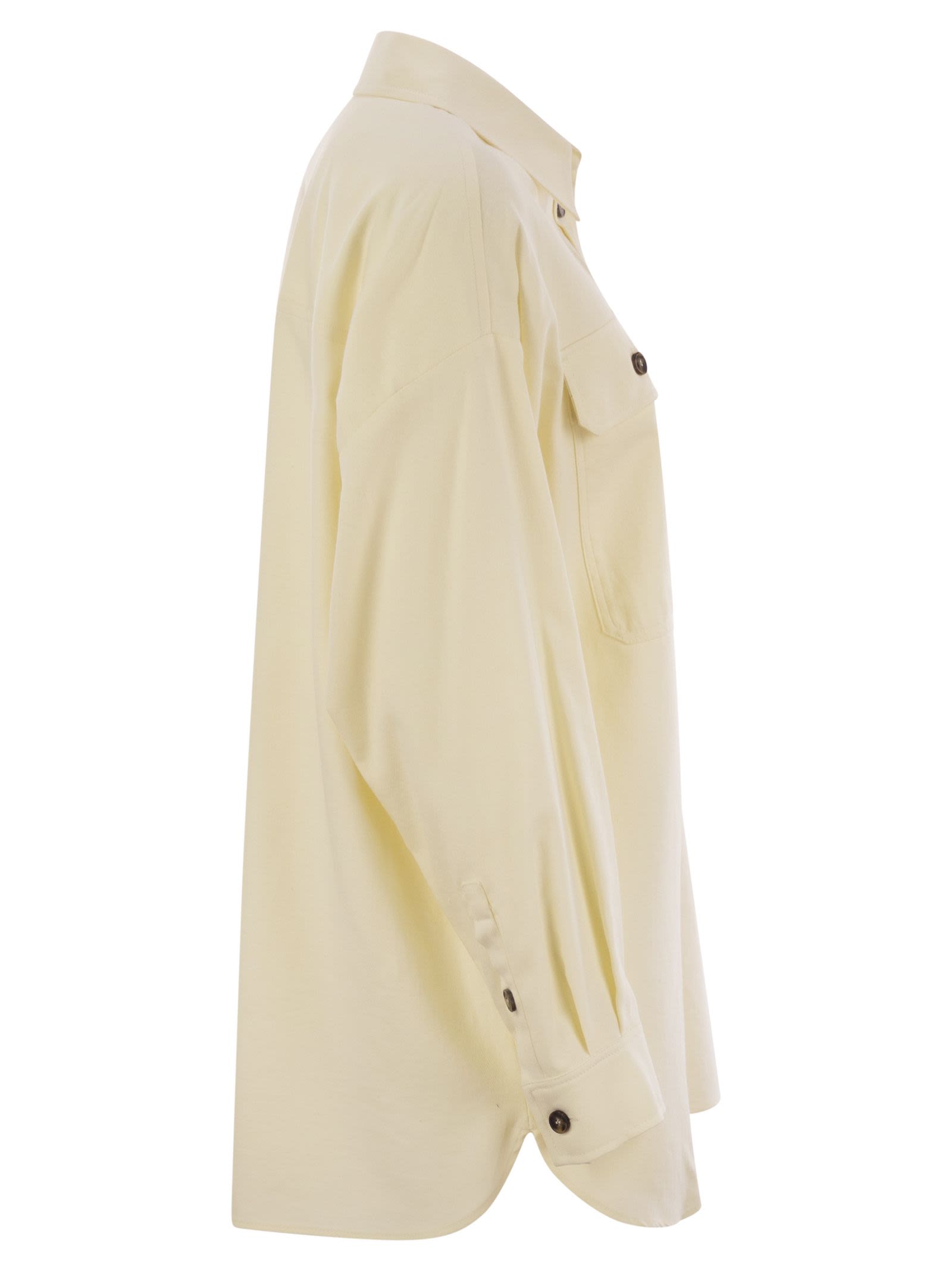 Oversized long shirt in soft pure cotton flannel, featuring long sleeves with a low turn, button cuffs and large flap and button patch pockets on the chest. Straight-line design finished with side slits and a slightly longer rounded hem at the back. - Exposed button fastening - Oversize - Side slits DESIGNER ID: 2425196013600 001