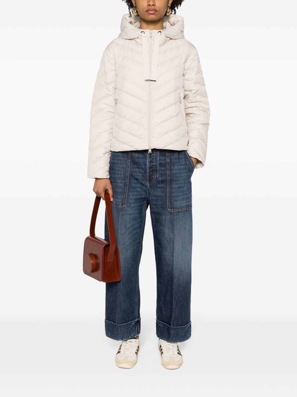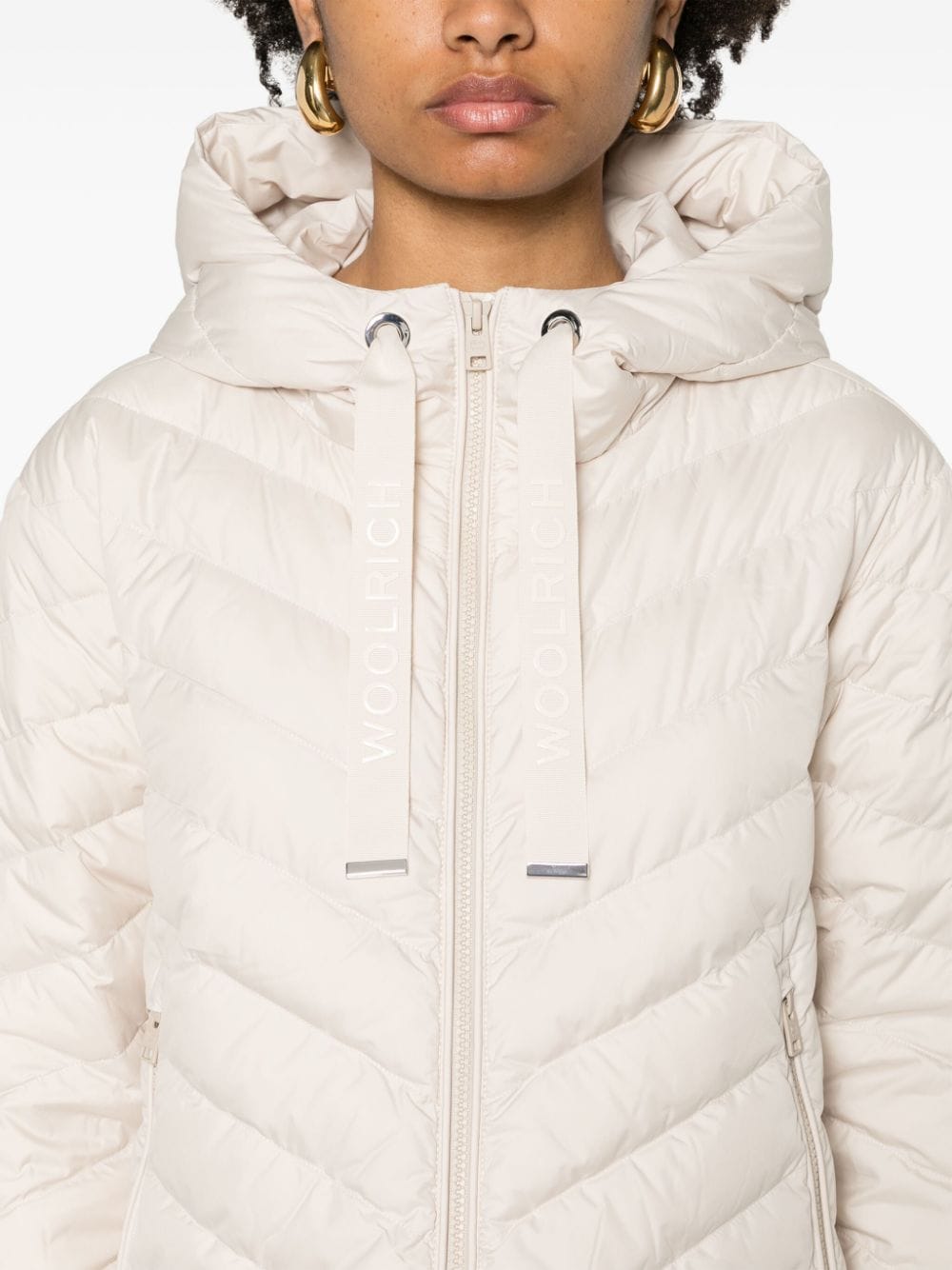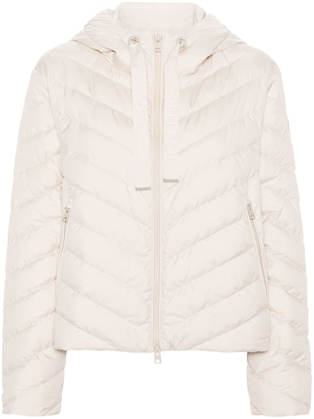 light beige feather down chevron quilting drawstring hood long sleeves with rubberised logo detail elasticated cuffs two zip-fastening pockets full lining internal drawstring fastening waist front two-way zip fastening
