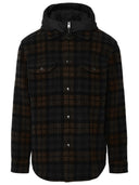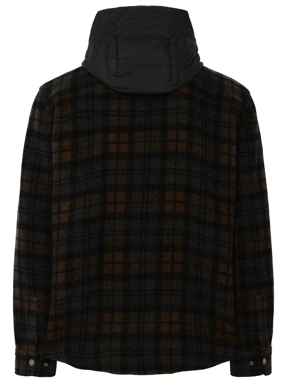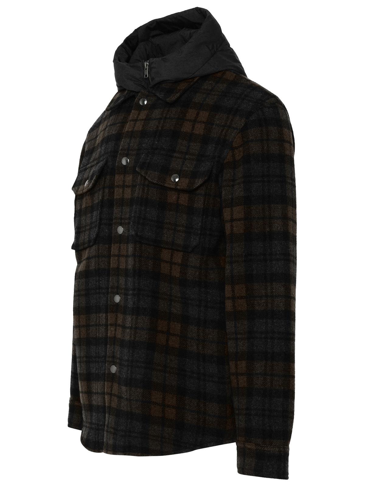 Duck feather padded shirt, removable inner jacket with zip, padded hood, pointed collar, flap and button pockets on the front, all-over check print, button cuffs, front button closure