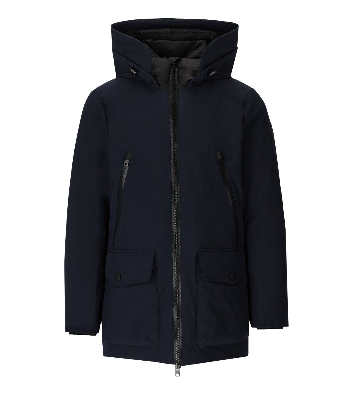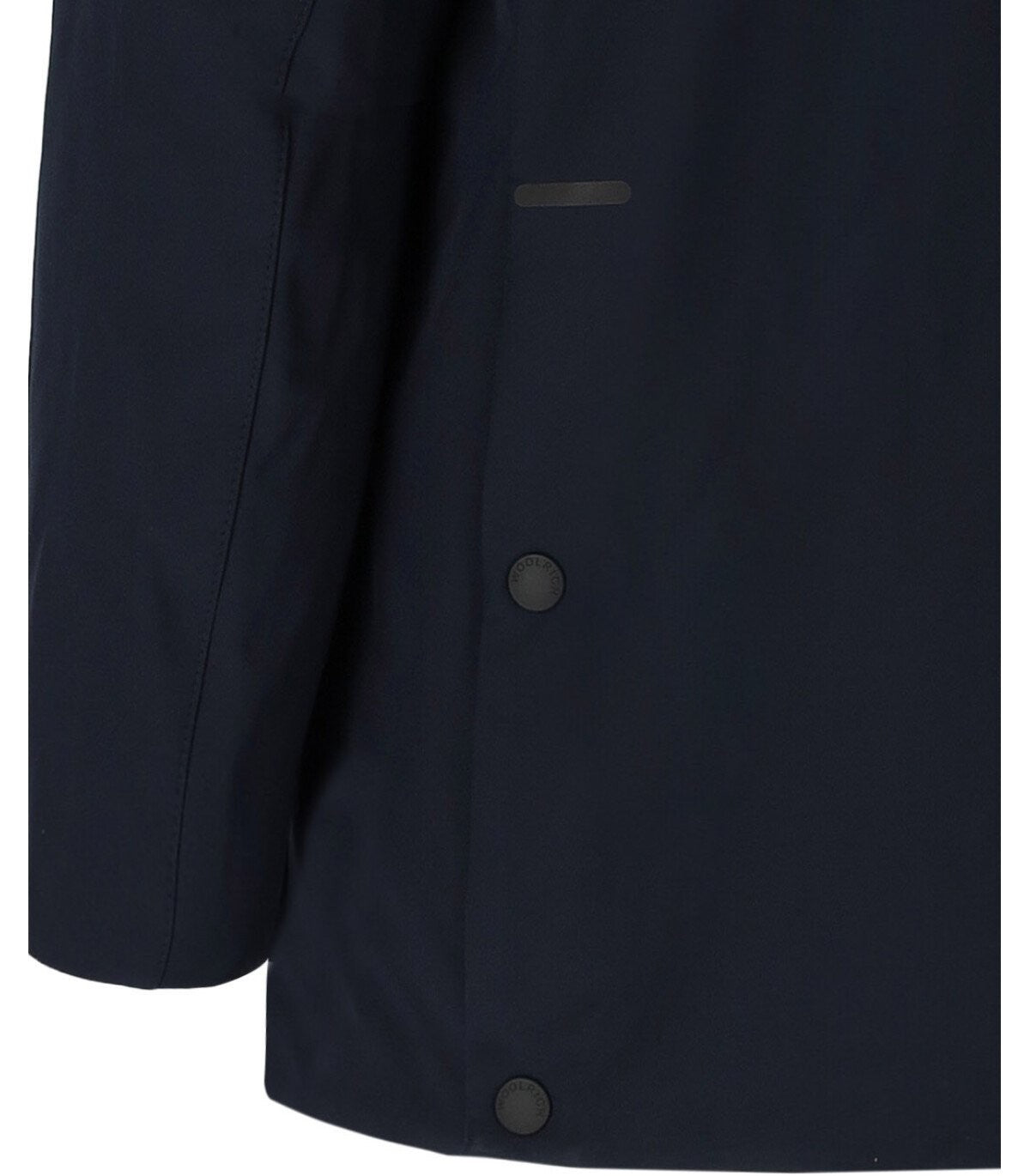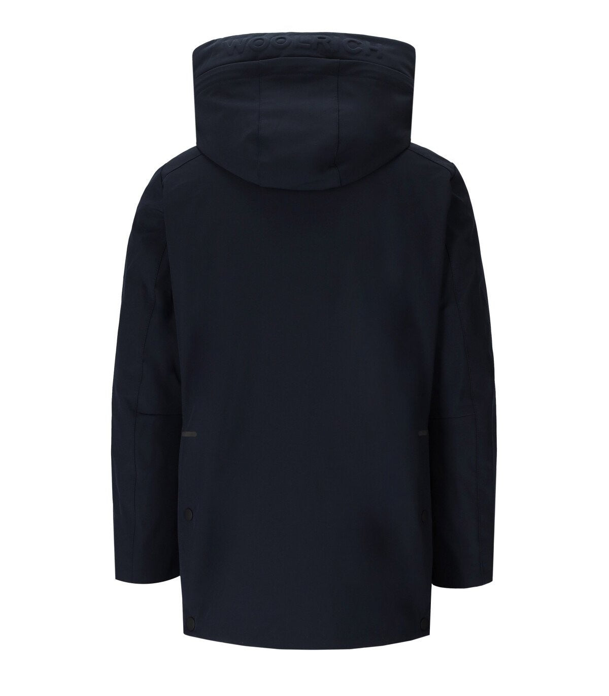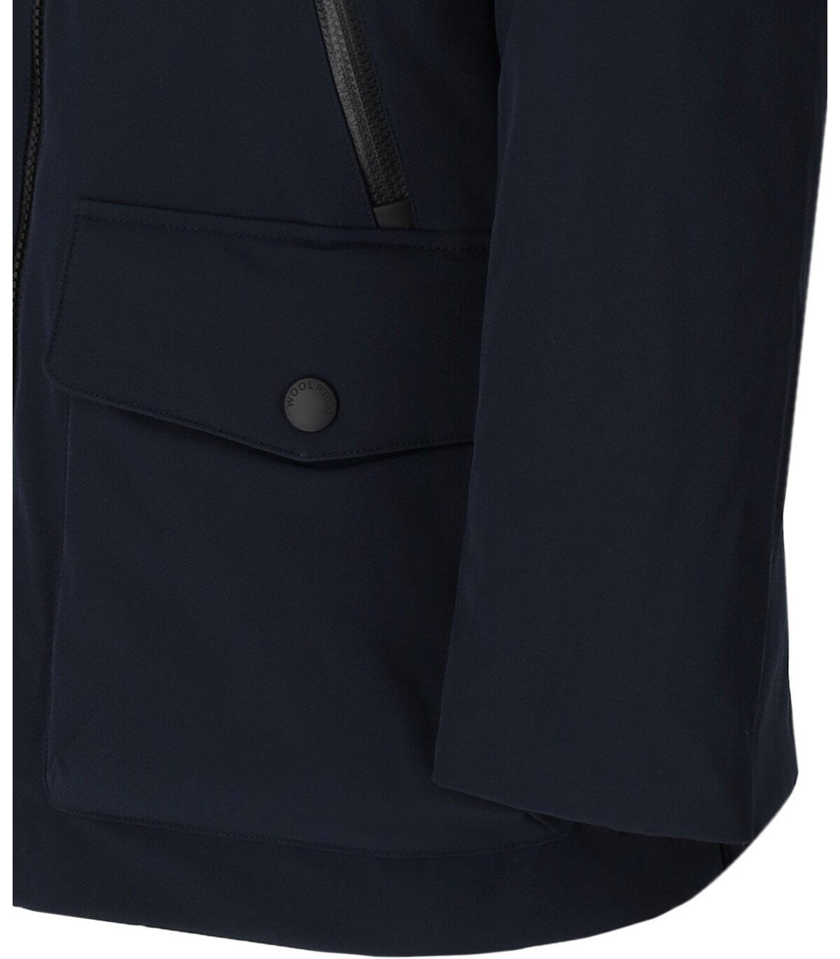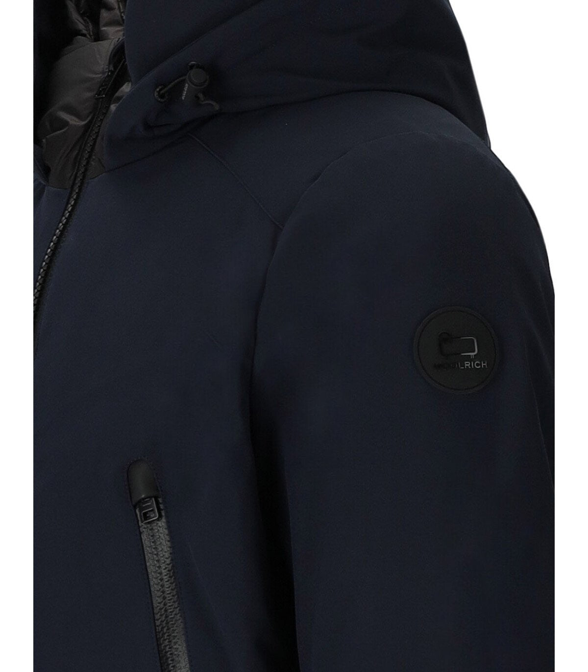 Woolrich Soft Shell parka made of blue nylon with duck down padding. Water-repellent, breathable and windproof, it features an adjustable hood, front pockets and the iconic logo patch on the left sleeve. Lined interior, equipped with mesh pockets with button, stretch fabric cuffs and zip and button closure. Composition: 94% polyester, 6% elastane. Lining: 100% polyamide. Filling: 90% duck down, 10% duck feather.
