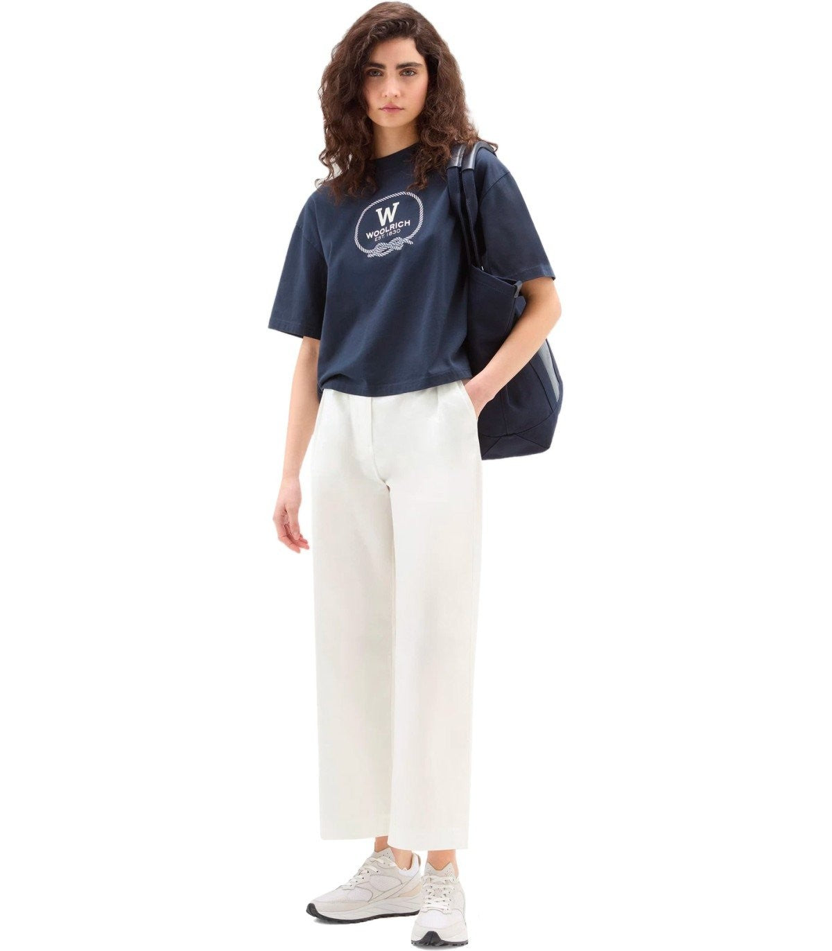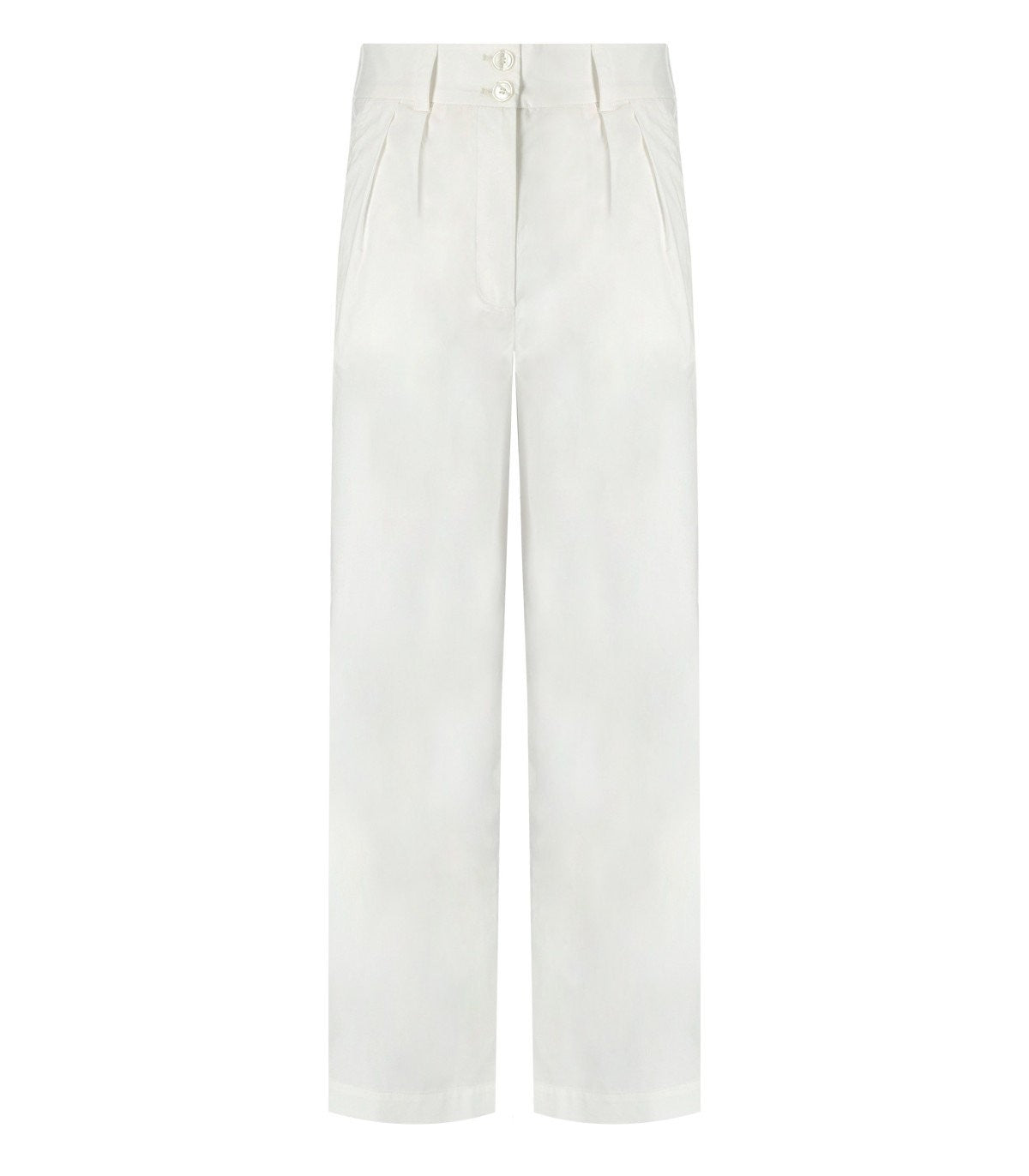 Woolrich trousers made of white cotton poplin. Pleats on the front, zip and button closure, and elastic insert at the waist. French pockets on the sides and welt pockets on the back. Regular fit, straight leg. The model is 178 cm tall and is wearing size 27. Composition: 100% cotton.