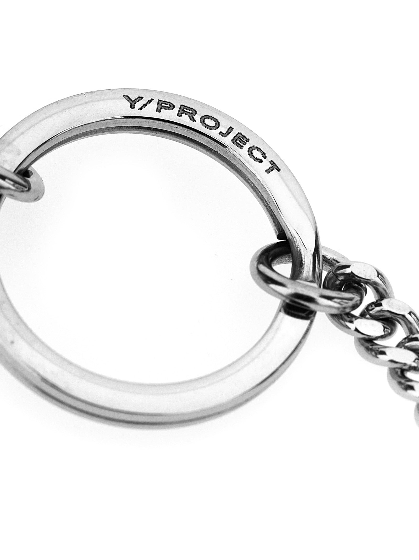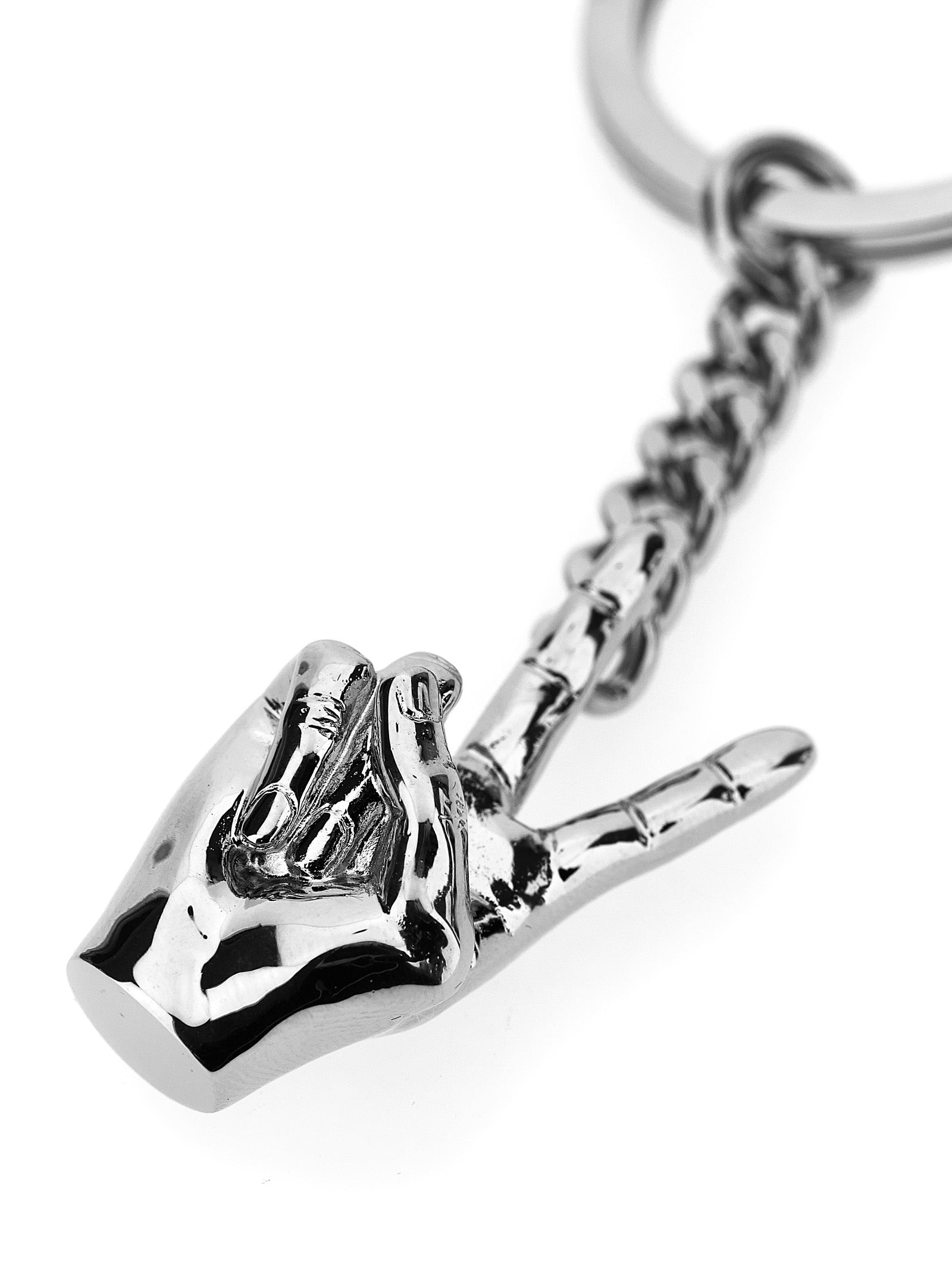 Silver metal keyring with 'Peace' charm, snap hook and ring.