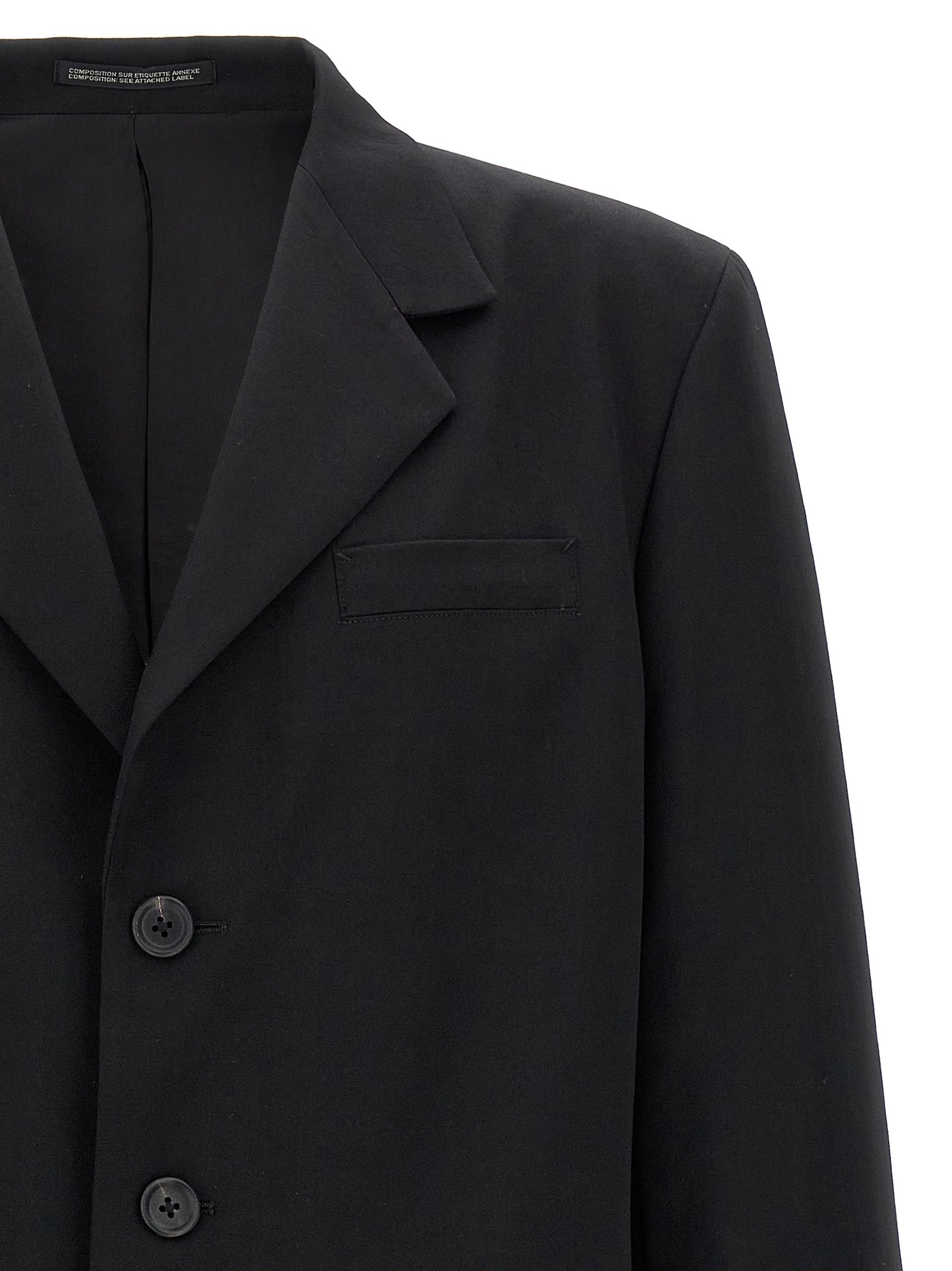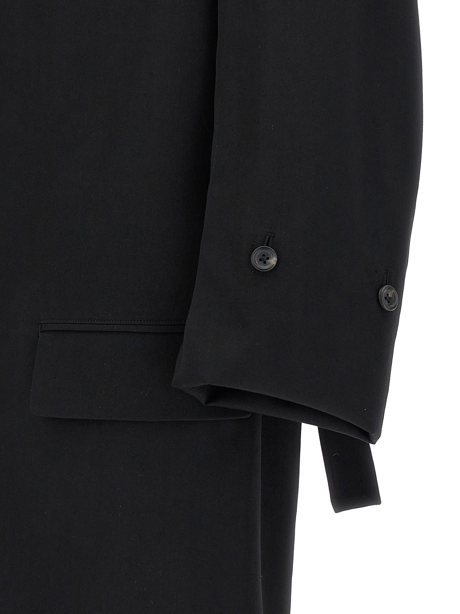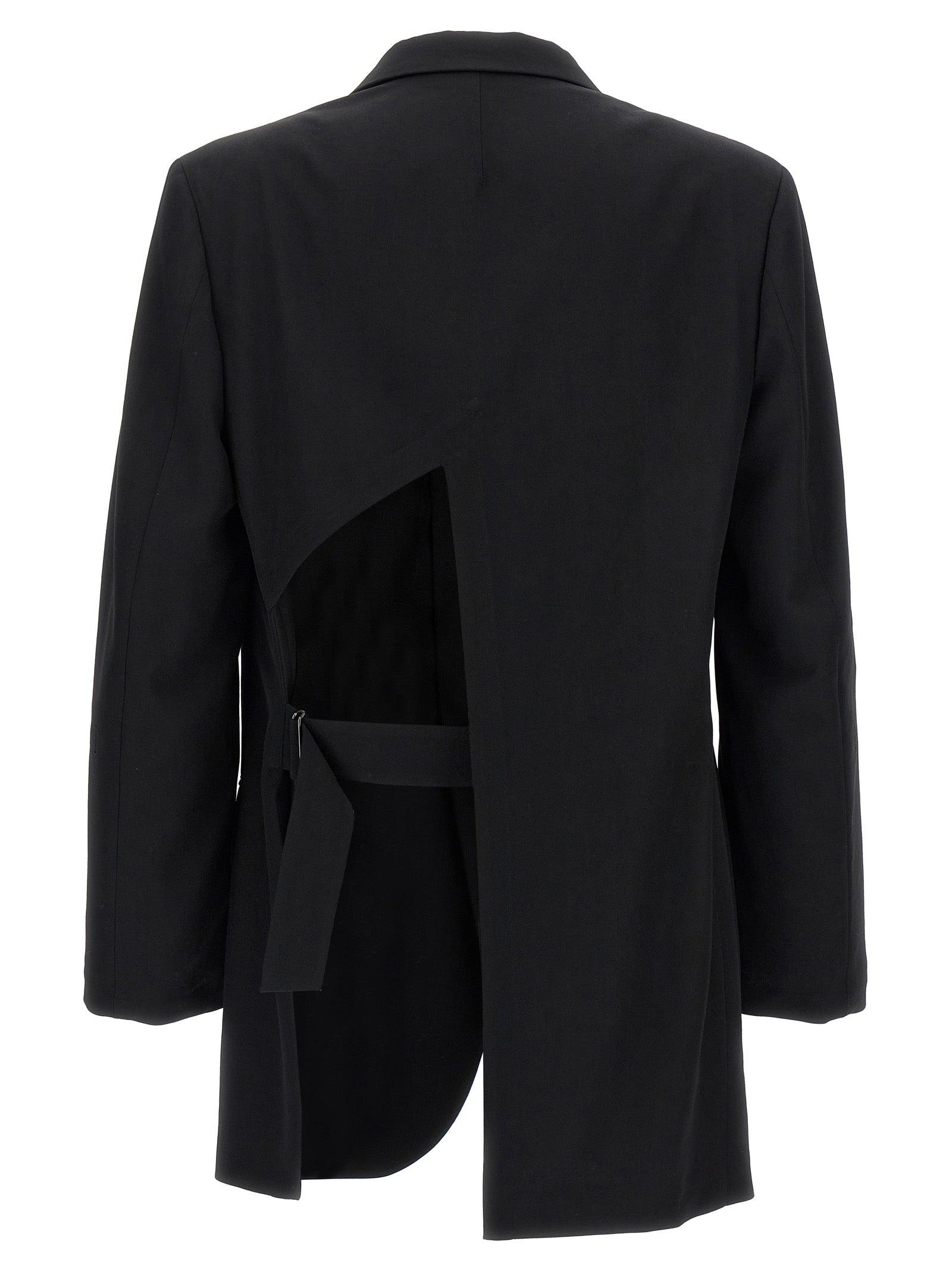 'Back Opening' single-breasted wool blazer with button closure, mirror lapels, long sleeves, pockets, padded shoulders, back with cut-out details and adjustable strap.
