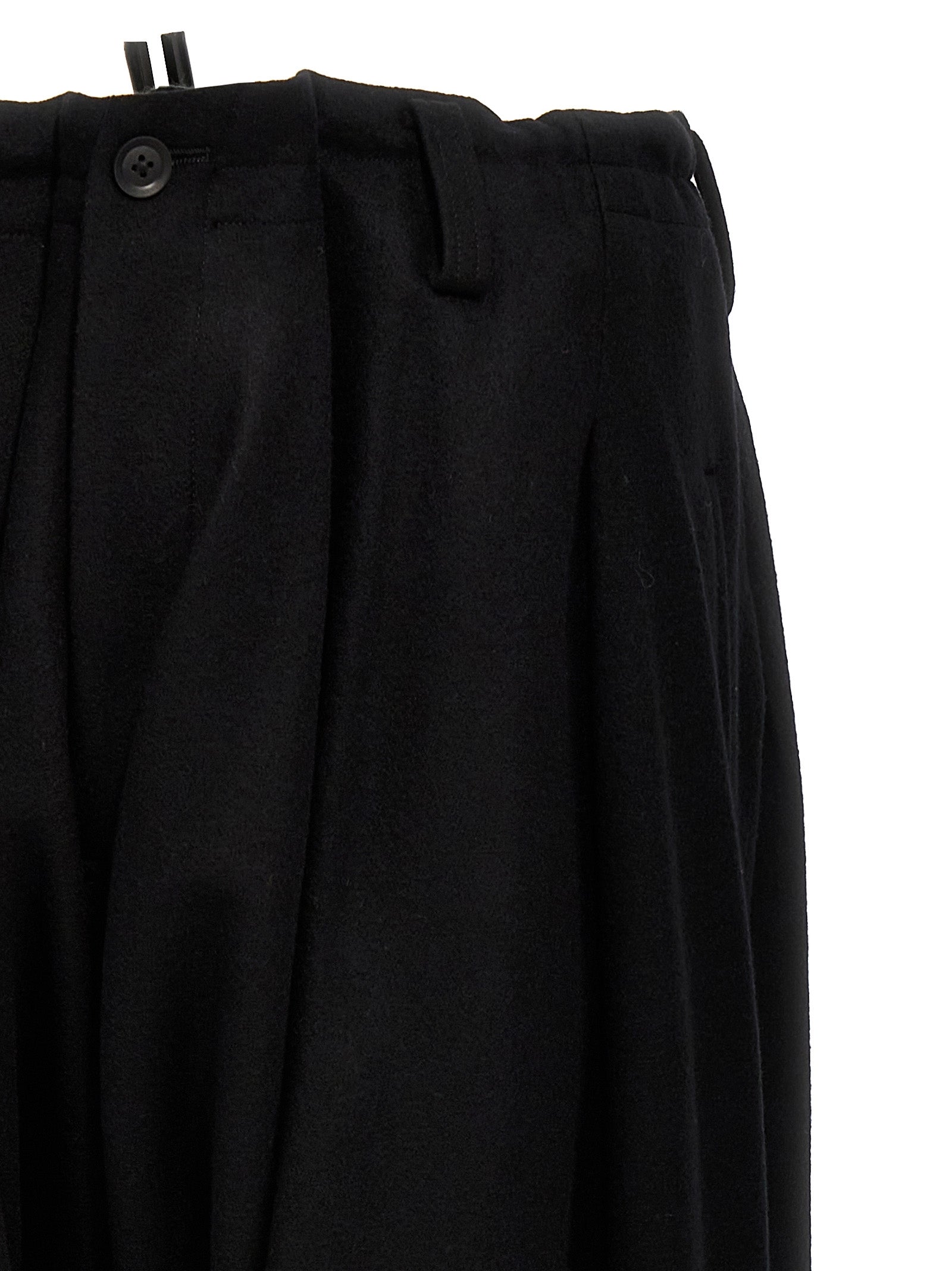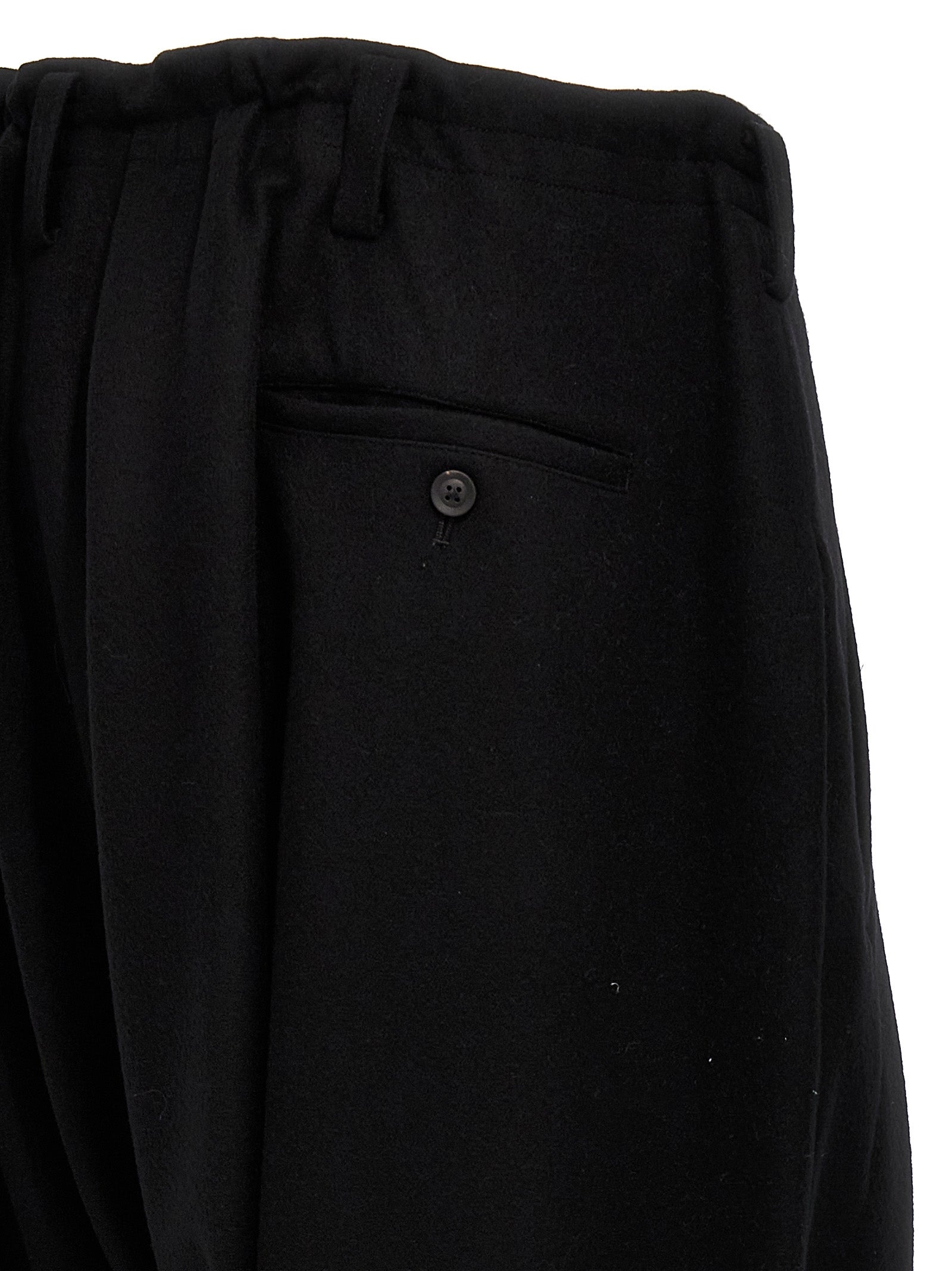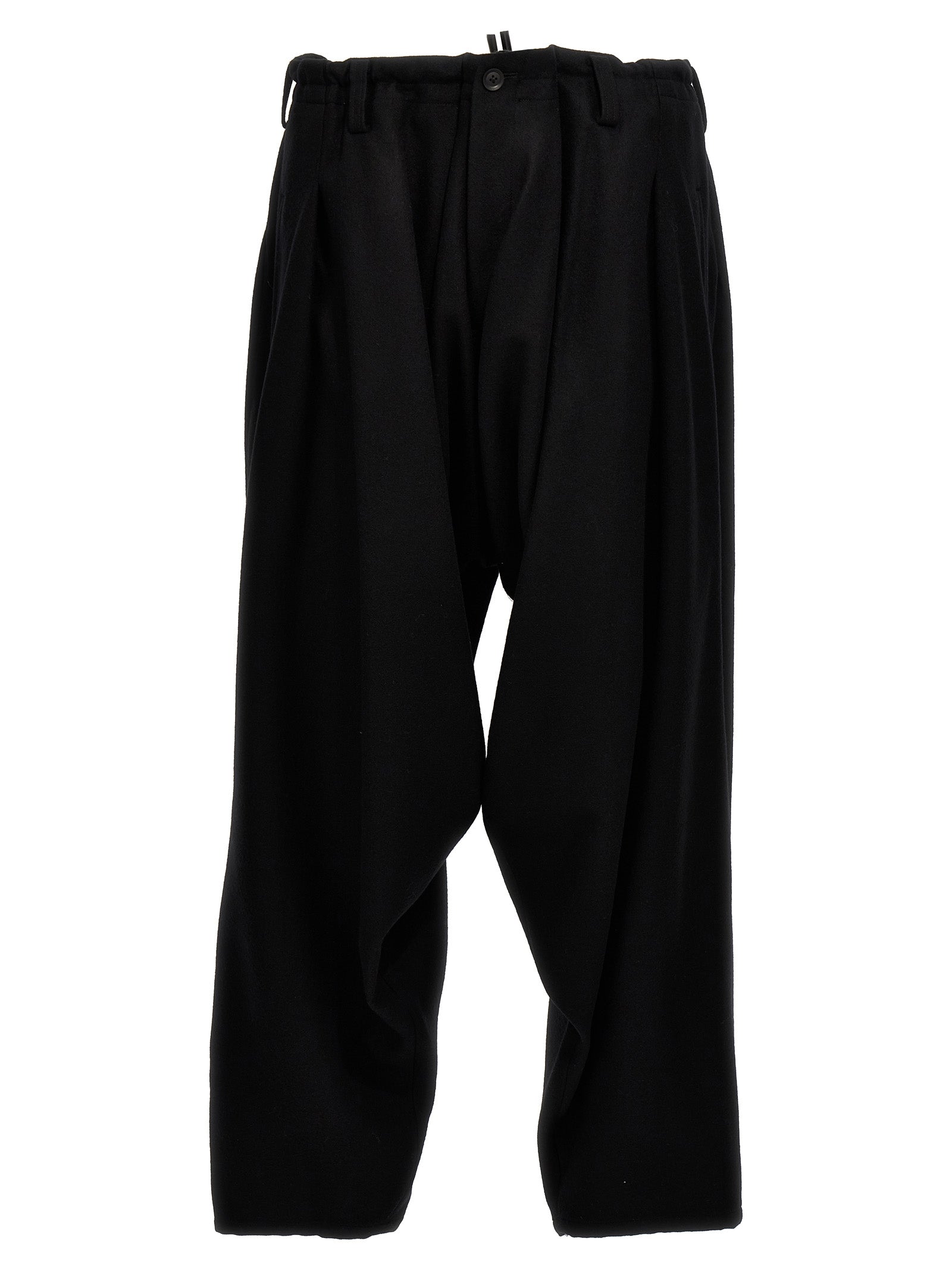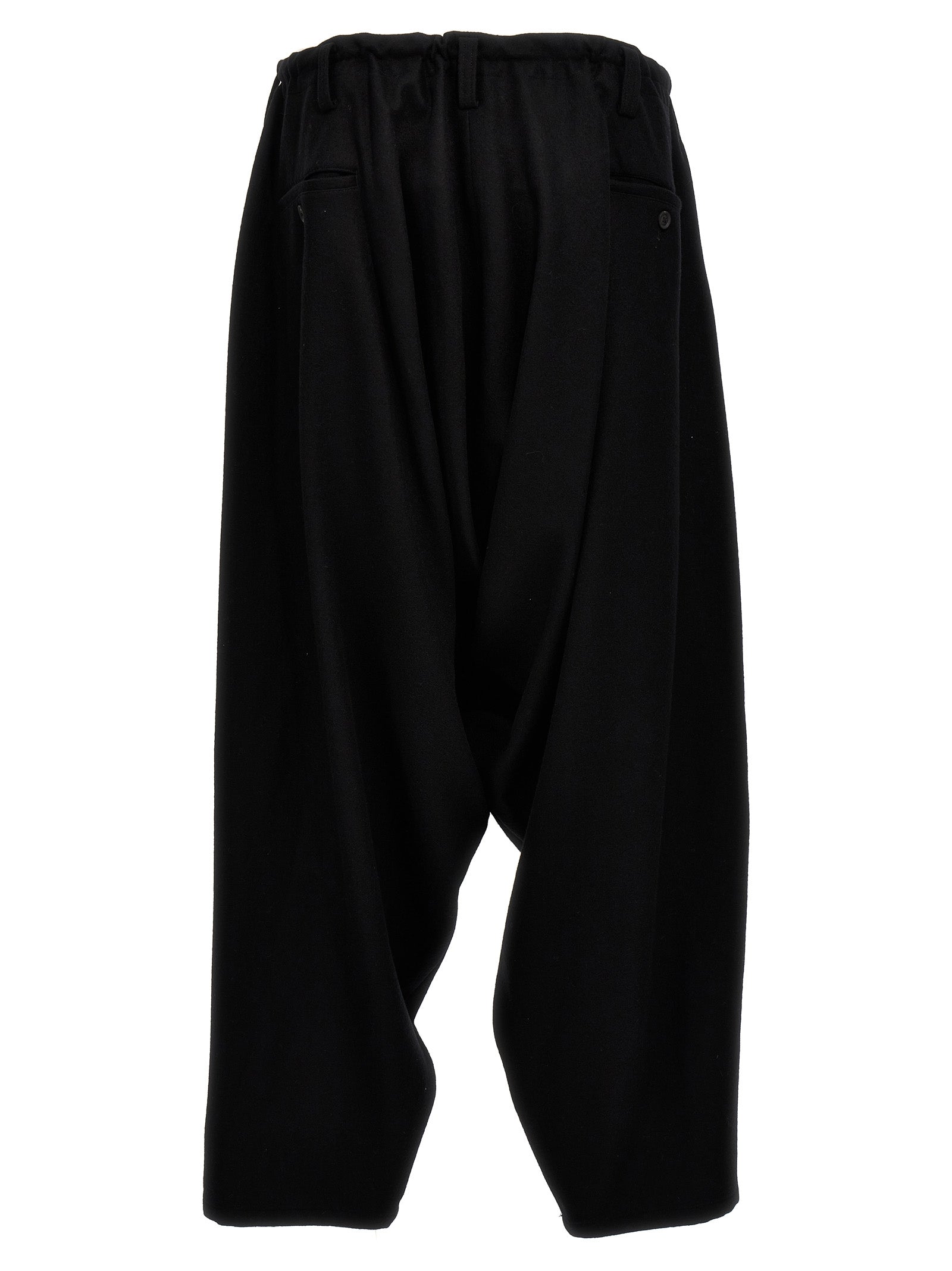 Wool pants with low crotch, zip and button closure, adjustable drawstring at the waist, pockets.