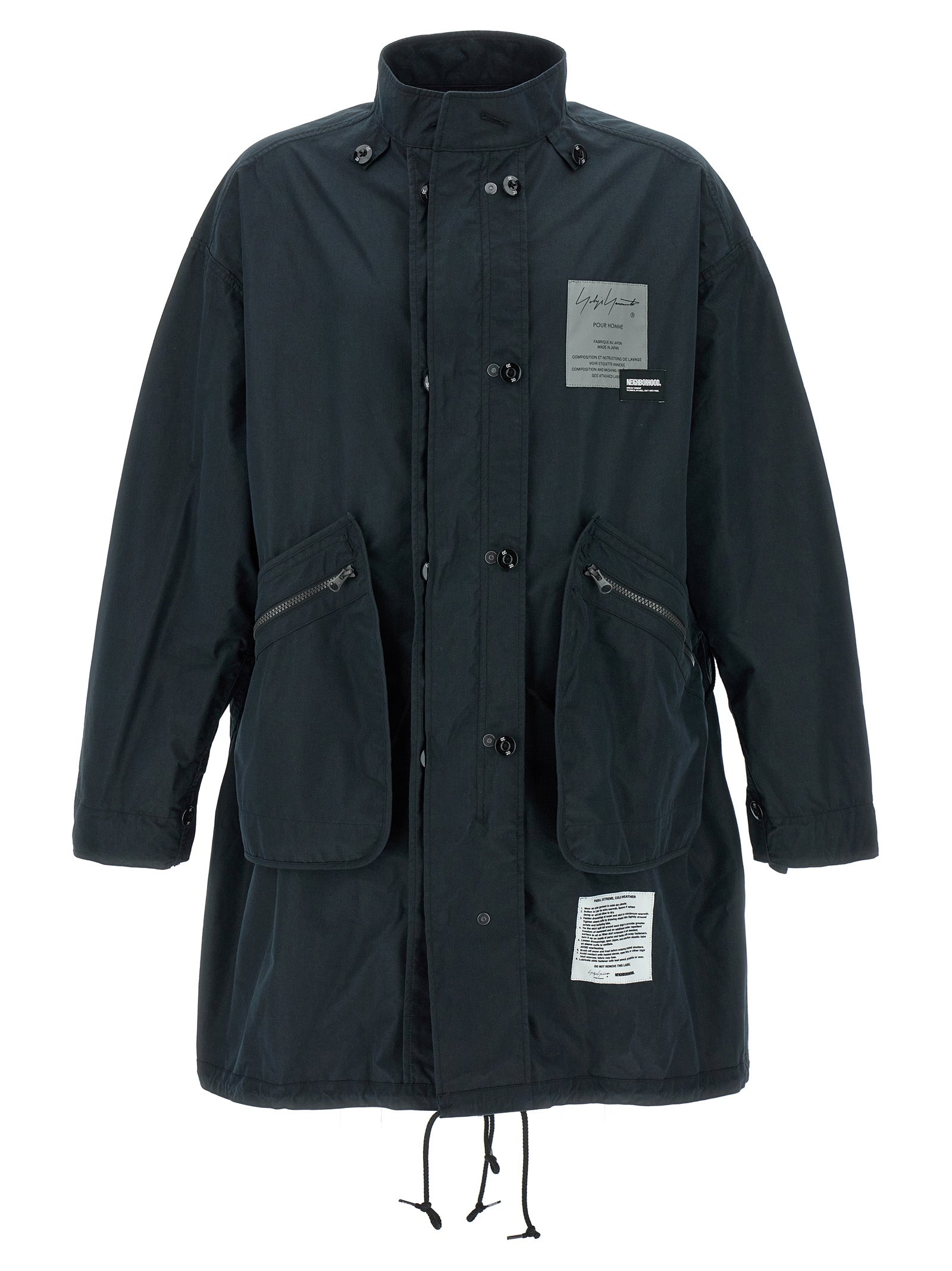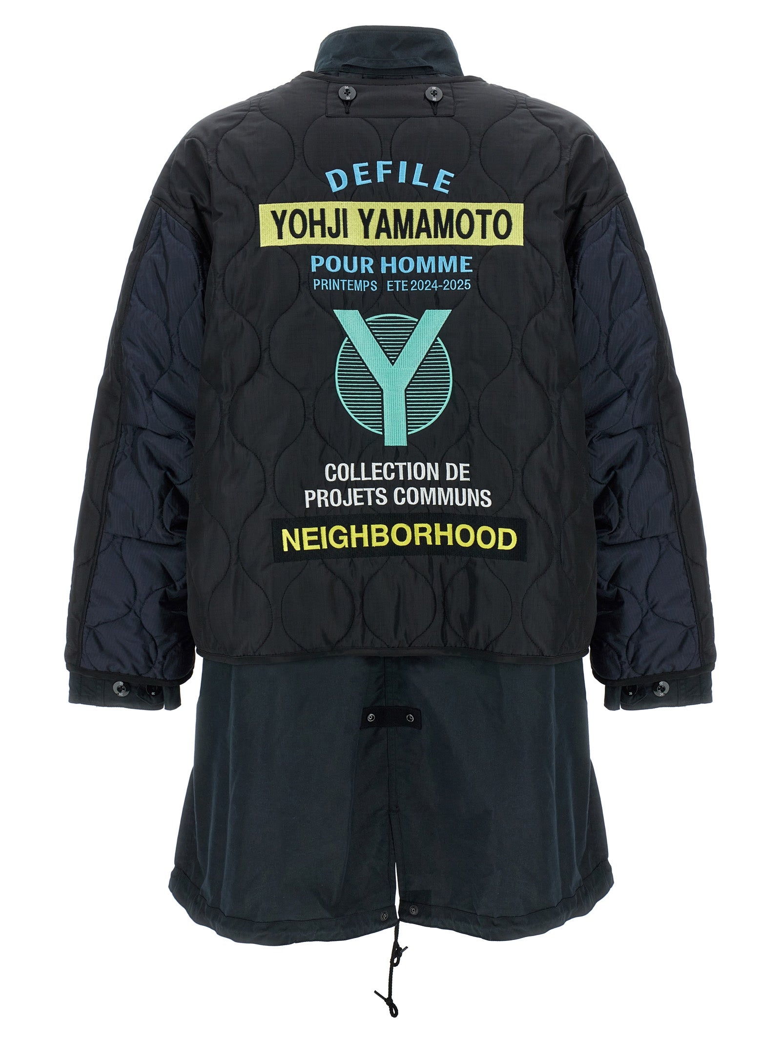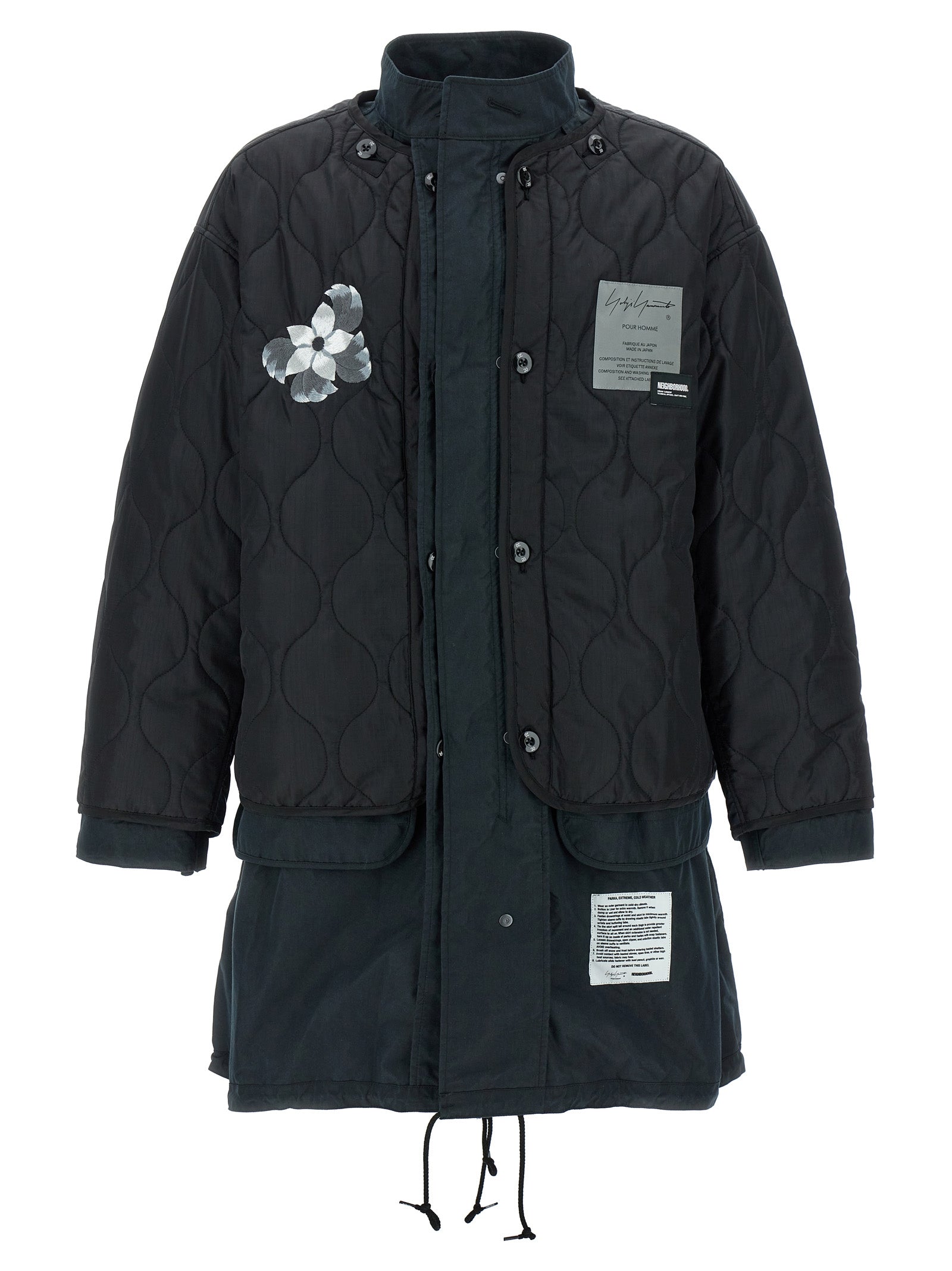 5WAY Yohji Yamamoto x NEIGHBORHOOD set consisting of reversible cotton parka, zip and button closure, patch and prints on the front and back, pockets, long cuffed sleeves, back split, drawstring at the hem, standing collar and reversible quilted fabric jacket, crew neck, button closure, patch and prints on the front and back, pockets, long sleeves. Possibility to use the two garments in 5 different ways: alone or overlapped.