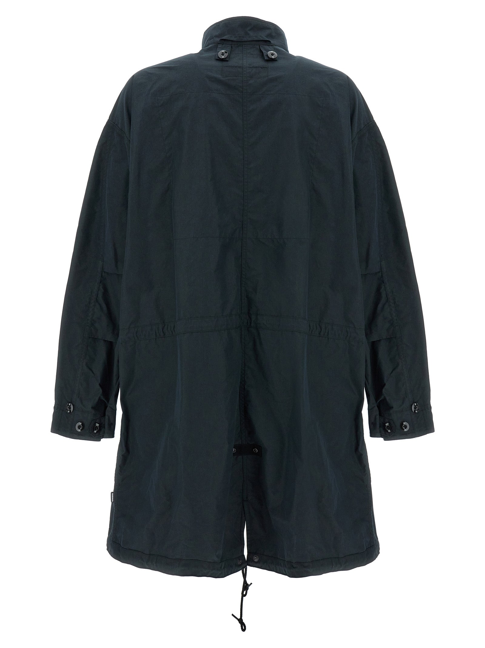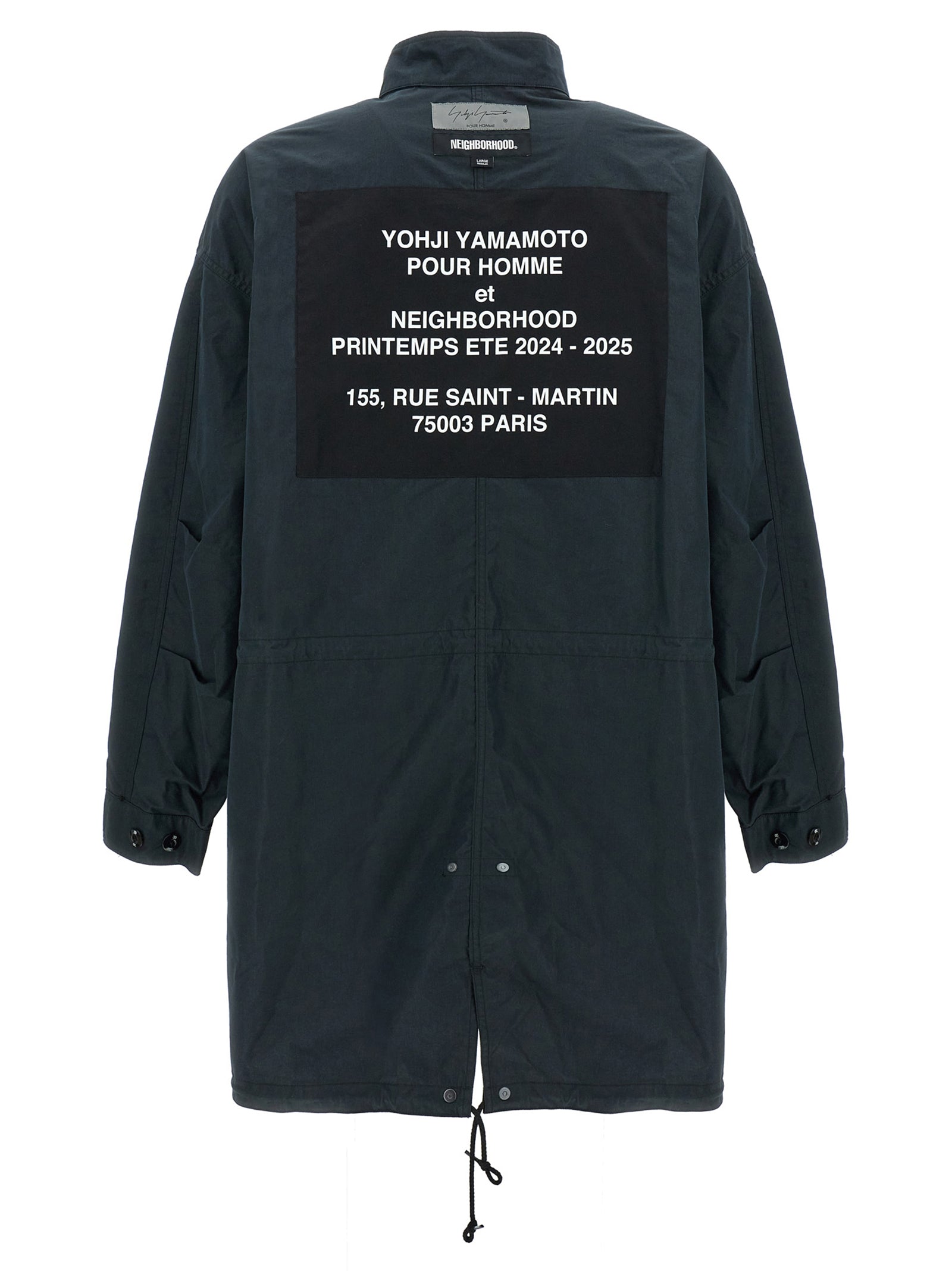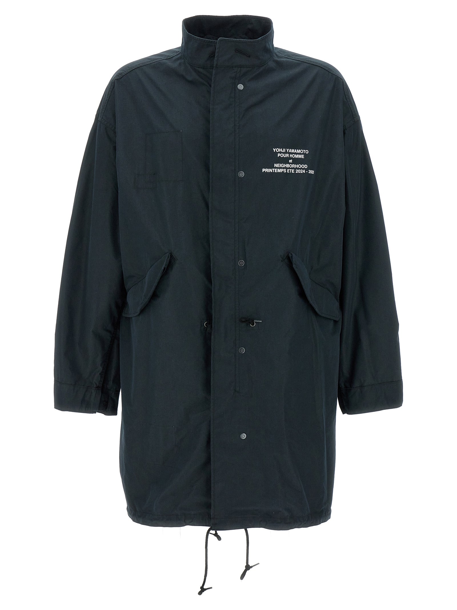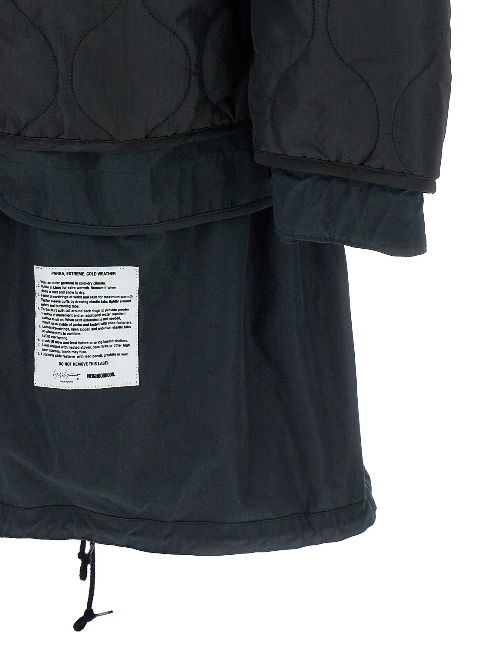 5WAY Yohji Yamamoto x NEIGHBORHOOD set consisting of reversible cotton parka, zip and button closure, patch and prints on the front and back, pockets, long cuffed sleeves, back split, drawstring at the hem, standing collar and reversible quilted fabric jacket, crew neck, button closure, patch and prints on the front and back, pockets, long sleeves. Possibility to use the two garments in 5 different ways: alone or overlapped.