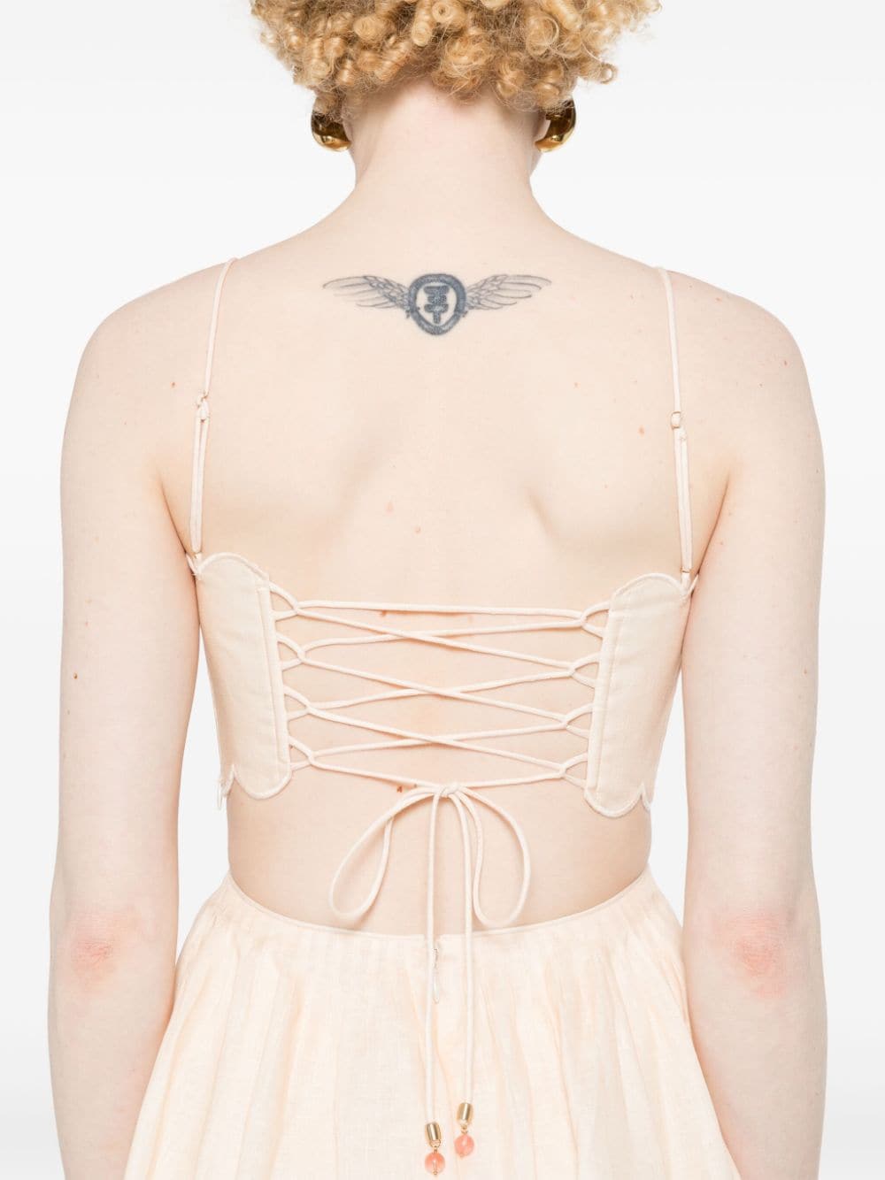 light orange/multicolour linen/flax poplin texture slub texture all-over floral print pleat detailing cut-out detailing at the waist scallop edge square neck adjustable spaghetti straps sleeveless two side inset pockets rear criss-cross straps concealed side zip fastening concealed rear hook and zip fastening mid-length cotton lining This item contains at least 50% materials which are certified or widely recognised as having a lower environmental impact through production and/or manufacturing processes that reduce water consumption and the use of harmful chemicals, or re-use by-products of the production process. Learn more about what makes a product Conscious on our Conscious Criteria page