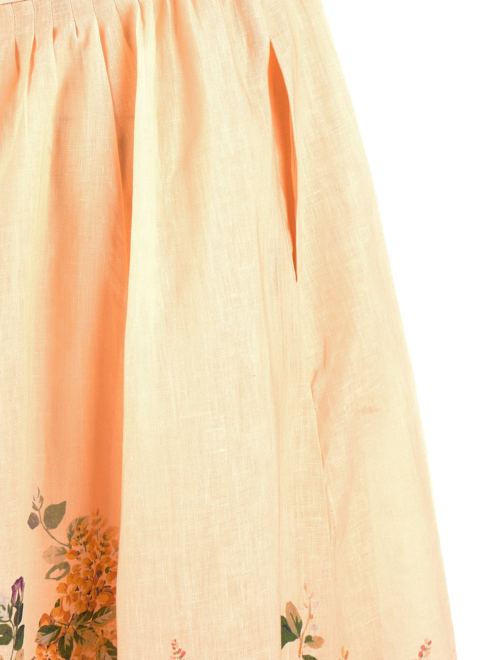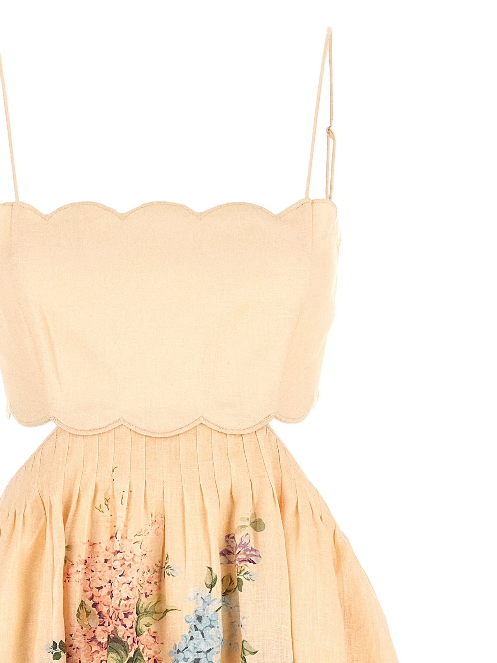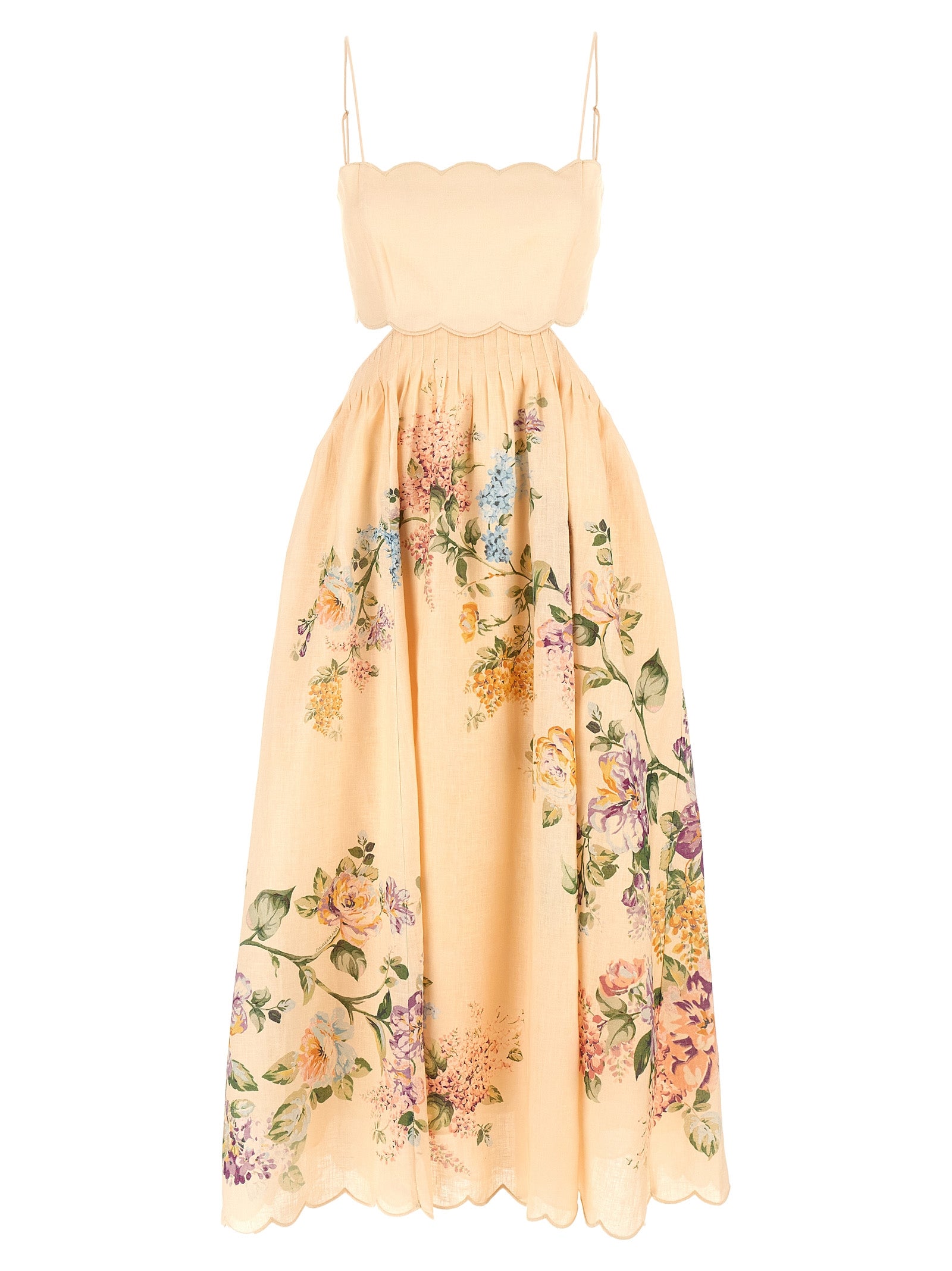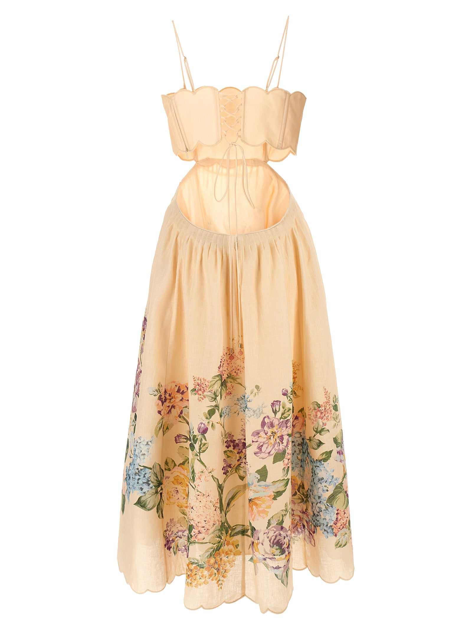'Halliday Scallop Midi' dress in printed linen, thin adjustable straps, top with back laces and details, back zip closure, pockets.