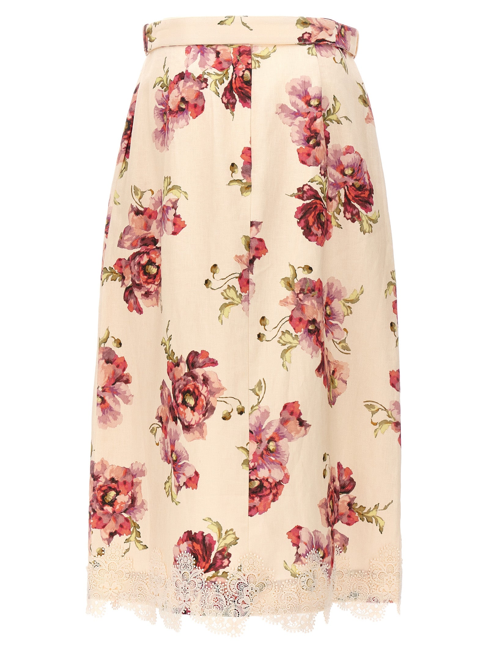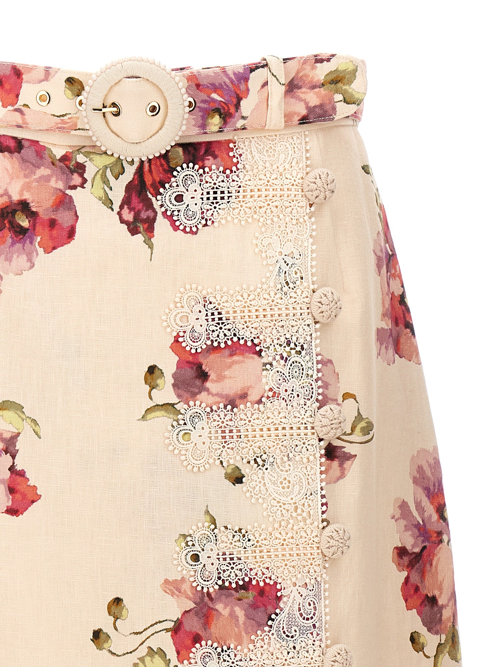 Floral print linen 'High Tide Applique' skirt, lace inserts, button front, matching waistband, back zipper closure.