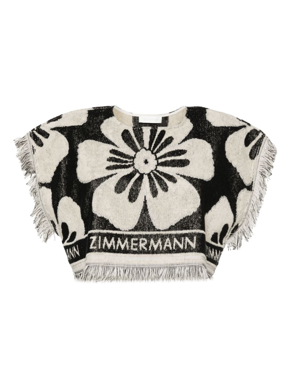 black/cream white cotton towelling finish all-over floral print round neck cap sleeves fringed edge cropped