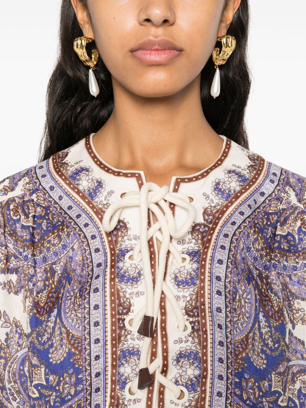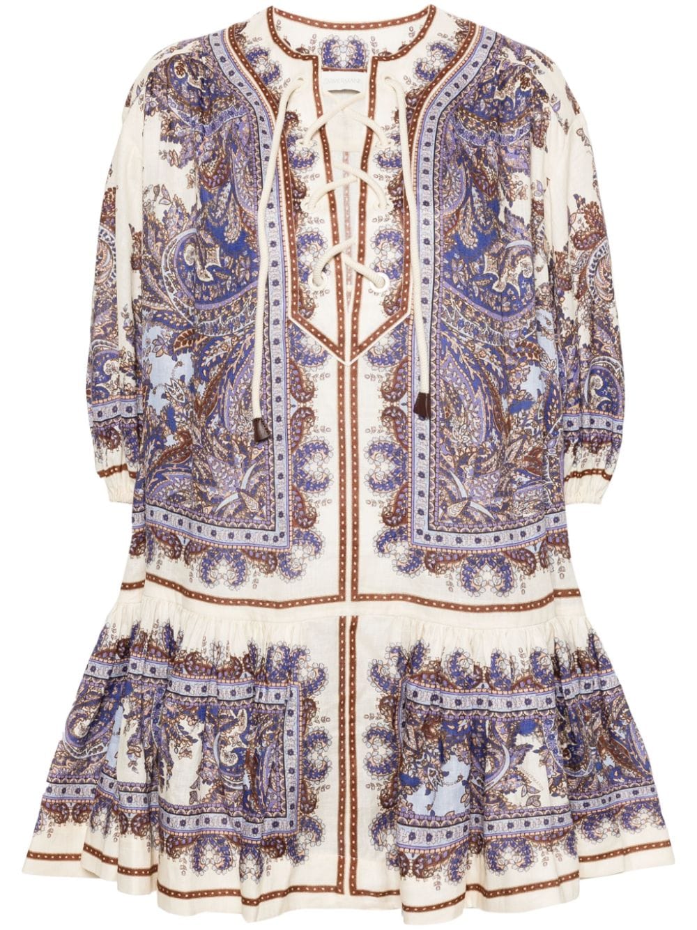 light beige/multicolour linen/flax slub texture all-over paisley print flared round split neck short puff sleeves with elasticated cuffs thigh-length ruffle hem front drawstring fastening This item contains at least 50% materials which are certified or widely recognised as having a lower environmental impact through production and/or manufacturing processes that reduce water consumption and the use of harmful chemicals, or re-use by-products of the production process. Learn more about what makes a product Conscious on our Conscious Criteria page