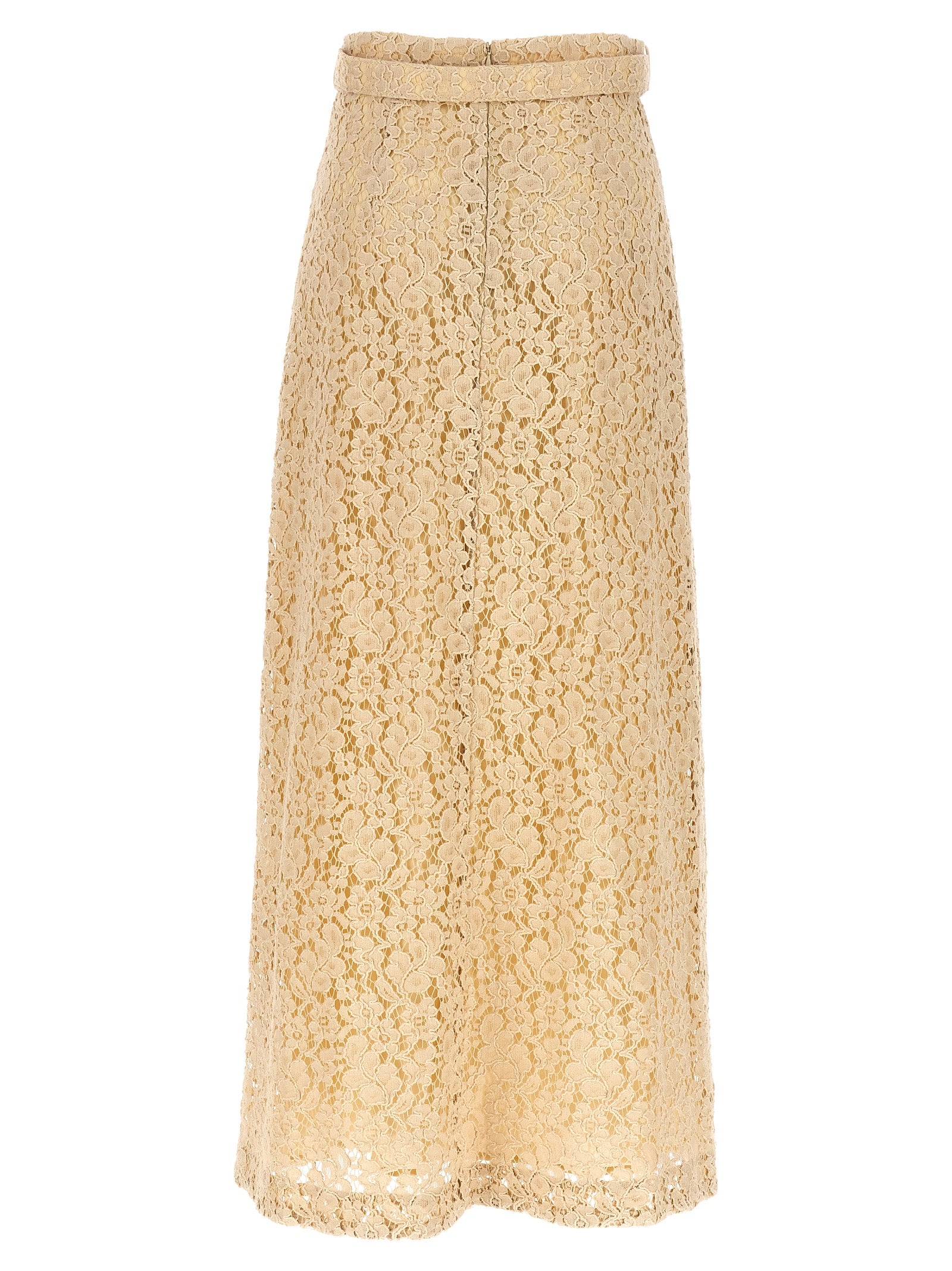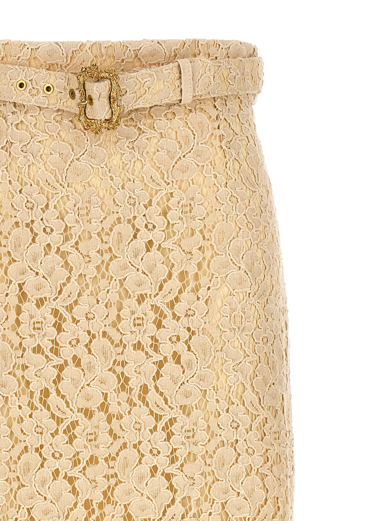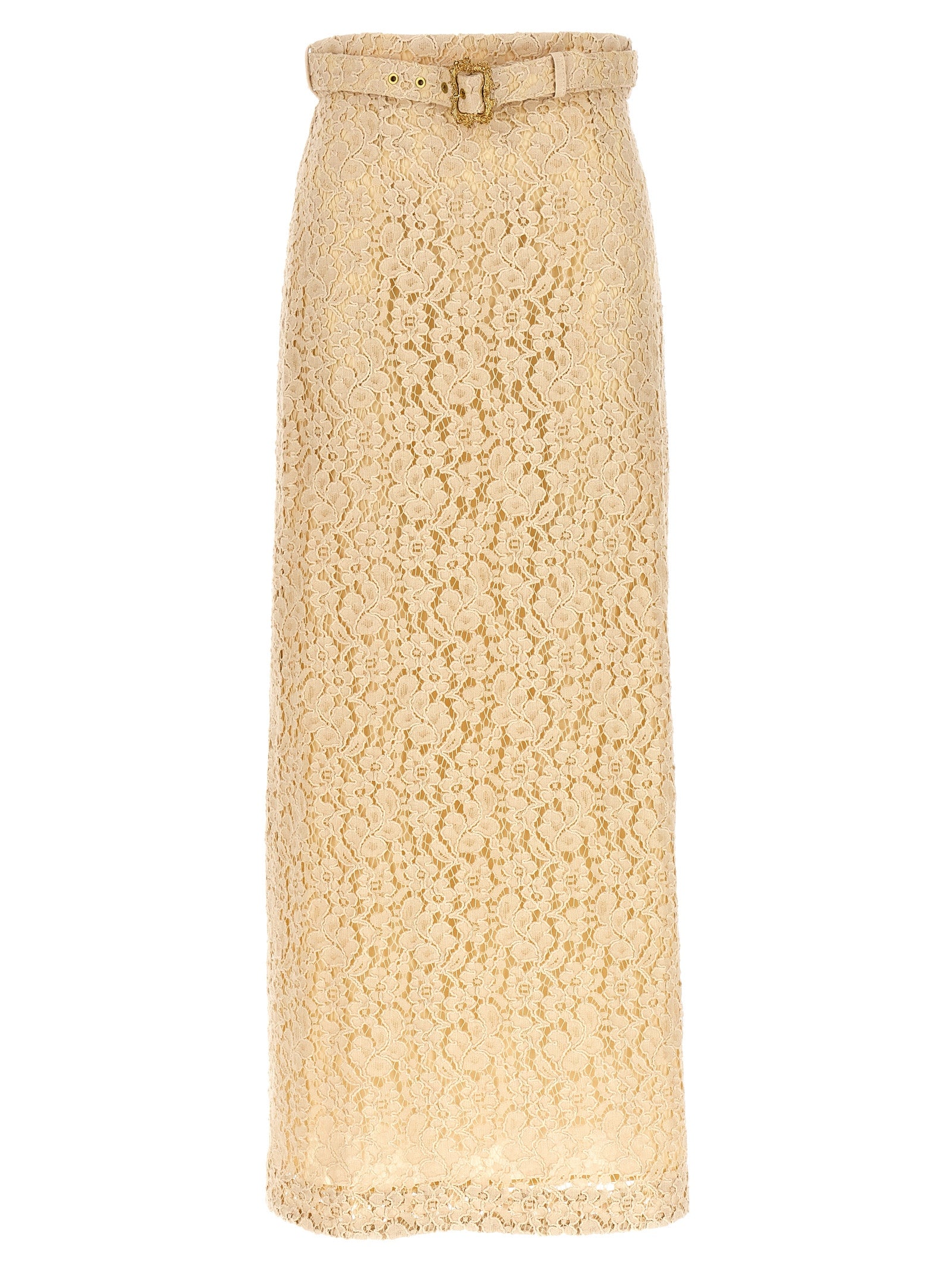 'Sensory Lace' lace skirt with back zip closure, matching waist belt with metal buckle.
